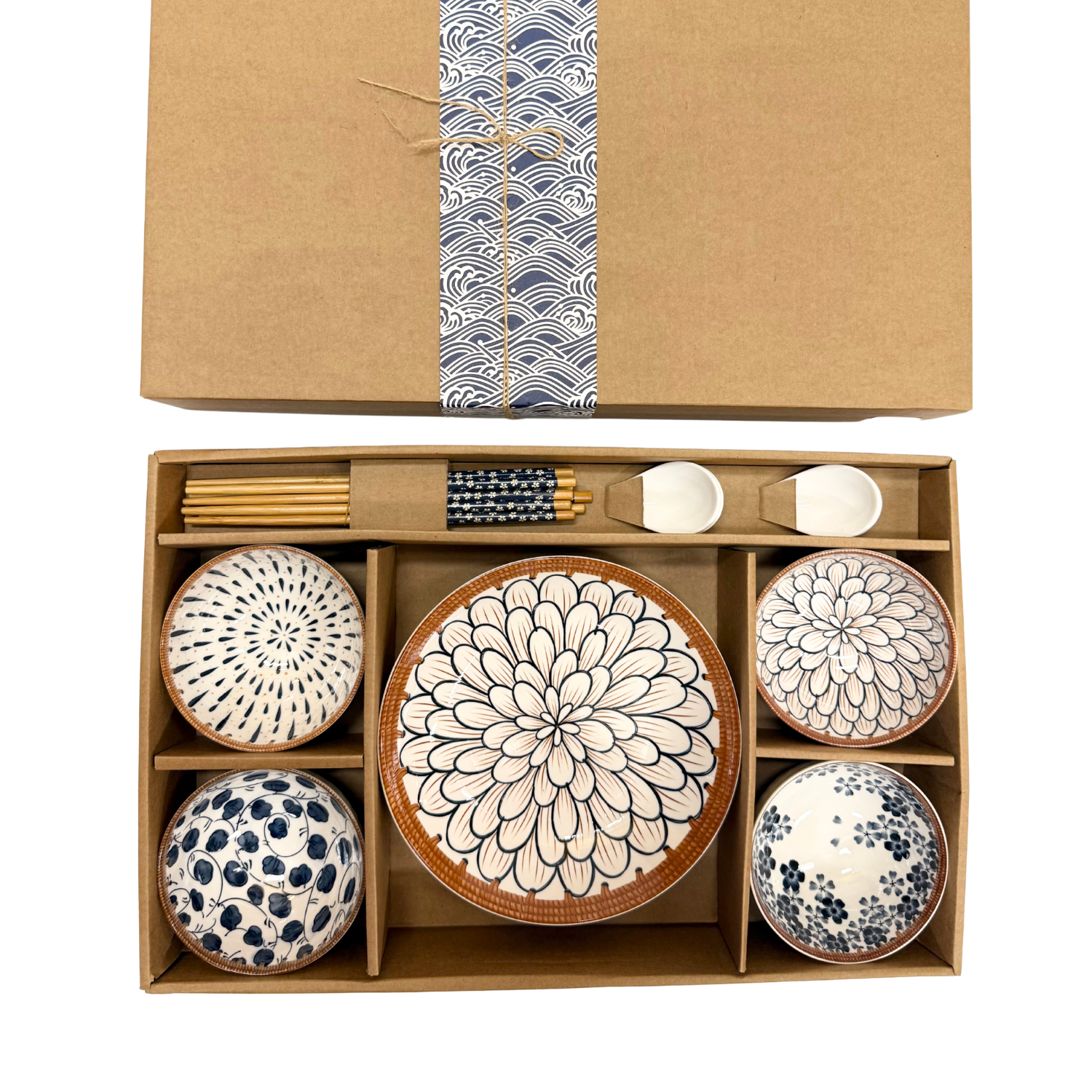 Each box comes with 4 bowls, 2 plates, 4 spoons and 4 pairs of chopsticks.