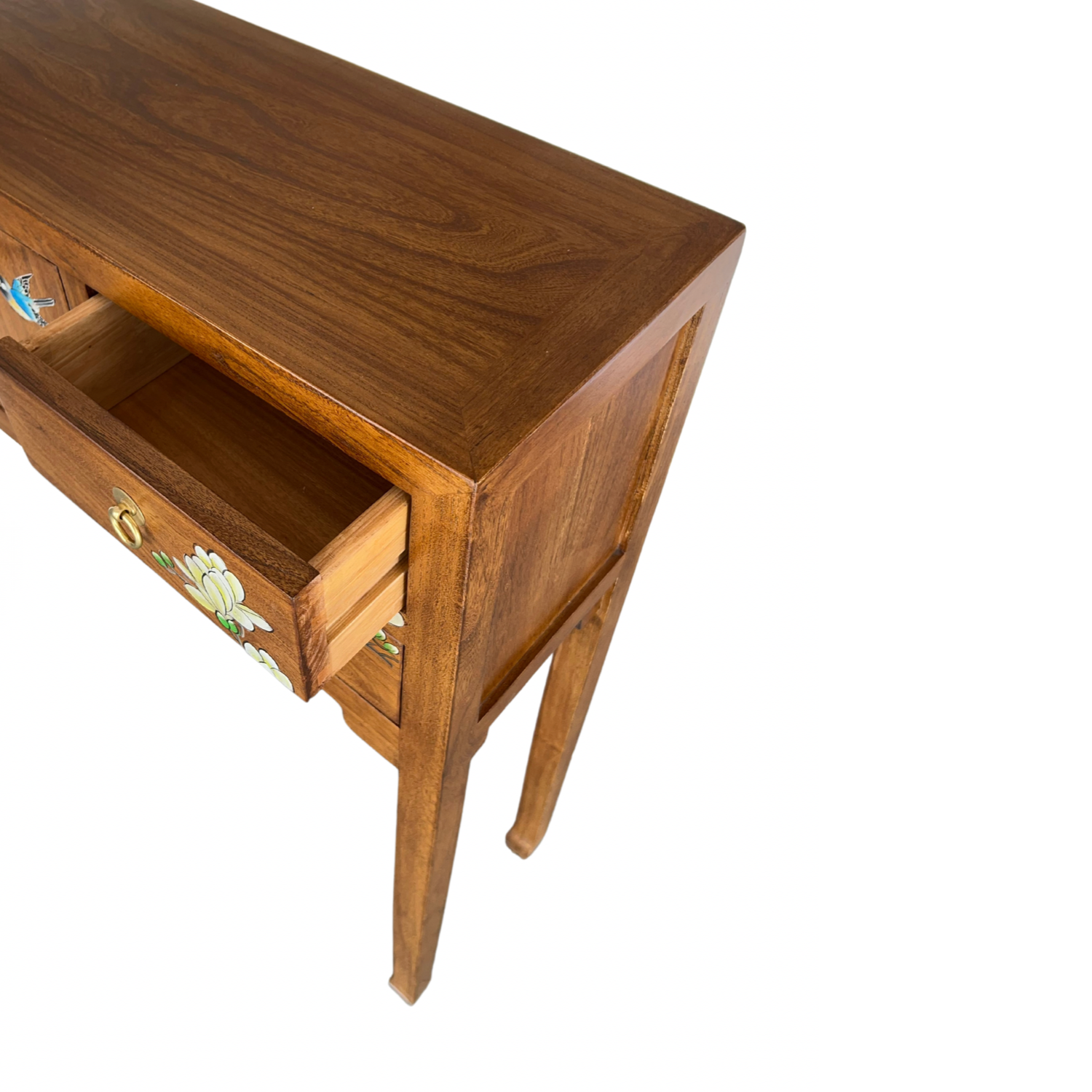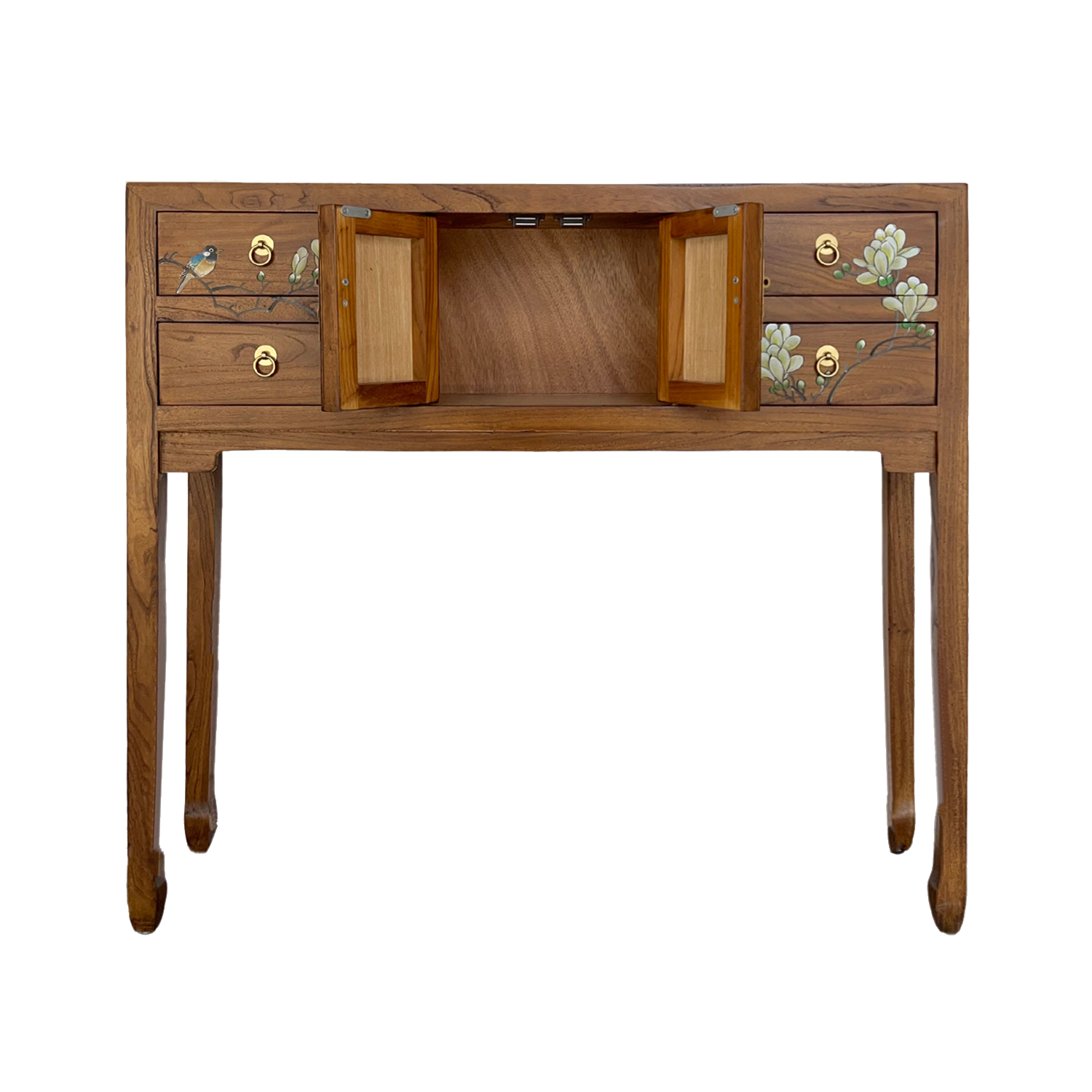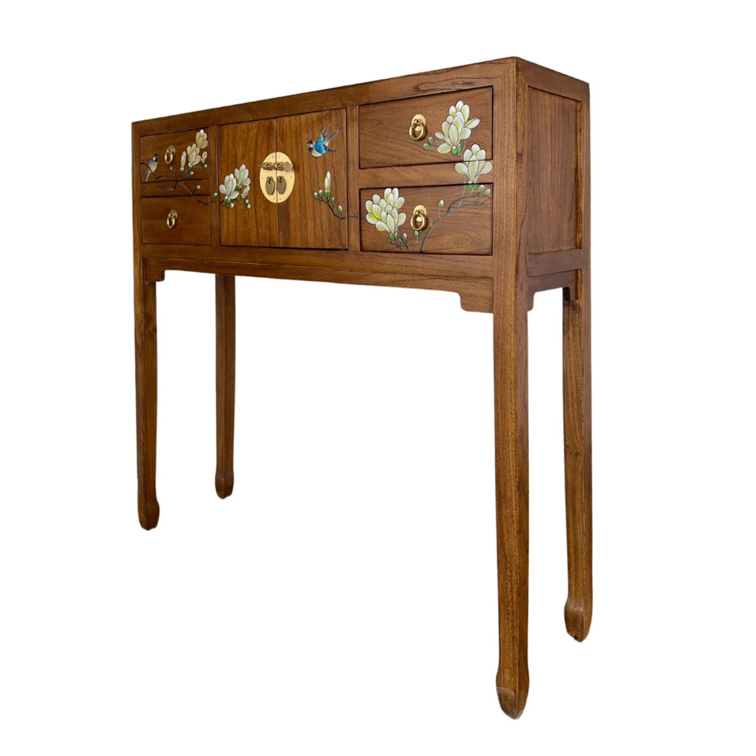 Classy with long, fluid lines, you can instantly picture this in a hallway with a mirror. Made such that the eye immediately draws to the round brass plates in the centre, this is reminiscent of Chinese interior design with brass fittings and handles to match. Top with a crystal vase of flowers or a hanging piece; this tall console is meant to decorate any space it's in.