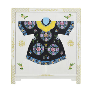 Unmistakably chinoiserie, this white robe cabinet is a statement and a half - from its brightly coloured exterior to the intricate floral robe motif, this decadently painted cabinet is made to have a whole room decorated around it! Opulent in design yet practical in function, this follows the design of the Chinese wedding cabinets, where clothes were not yet vertically hung, but folded. Ideal for linen or small cloth items!