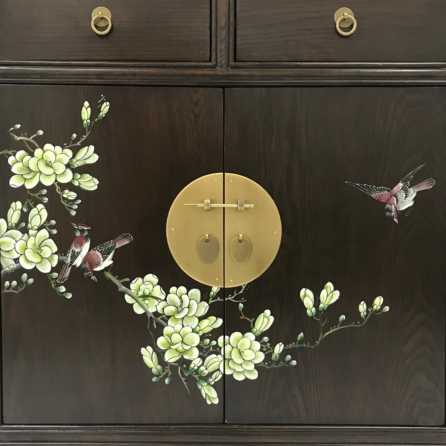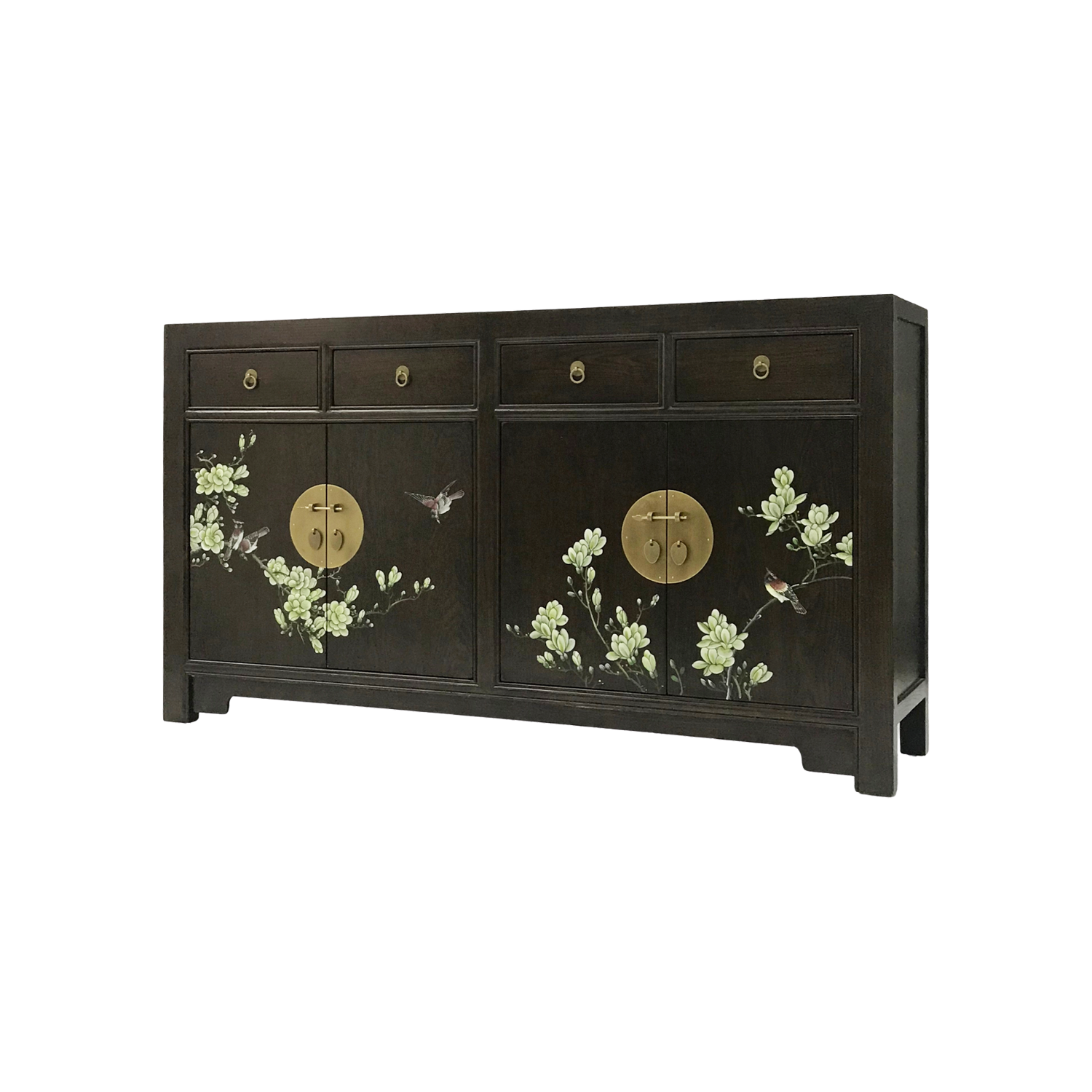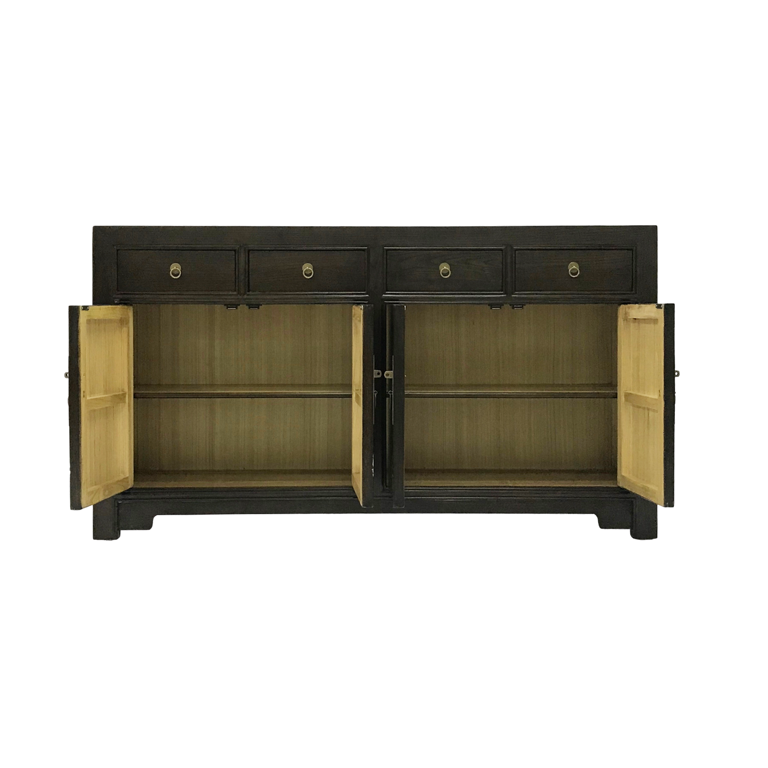 Neither fully minimalist nor chinoiserie, this oriental sideboard elegantly treads the line between both styles with ease, giving the designer full reign to create a fusion between two very different aesthetics. Made from sturdy elm, this oriental sideboard is painted in a glossy dark brown, with contrasting brass faceplates and ring pulls, making it a versatile addition to any living space.