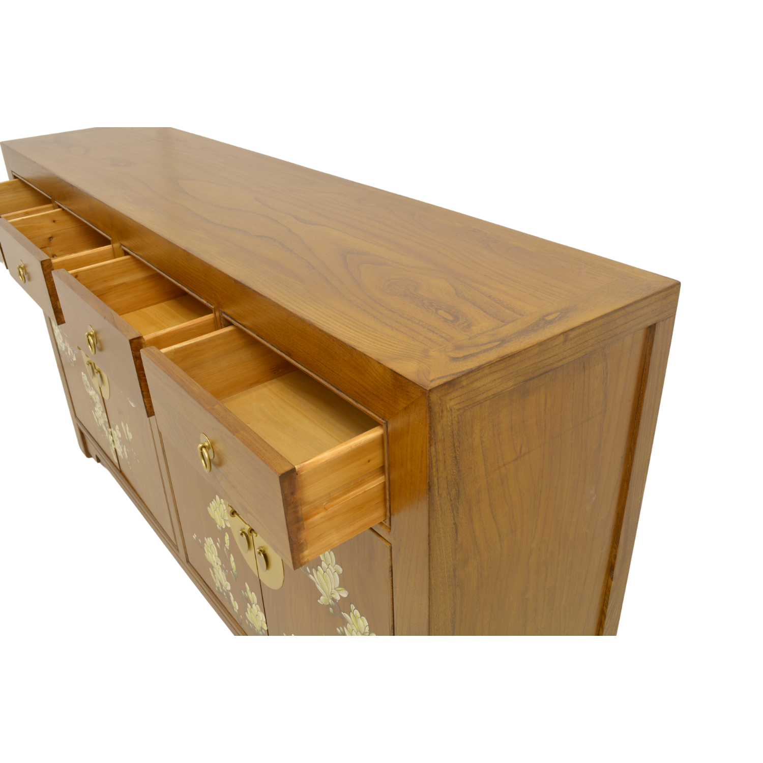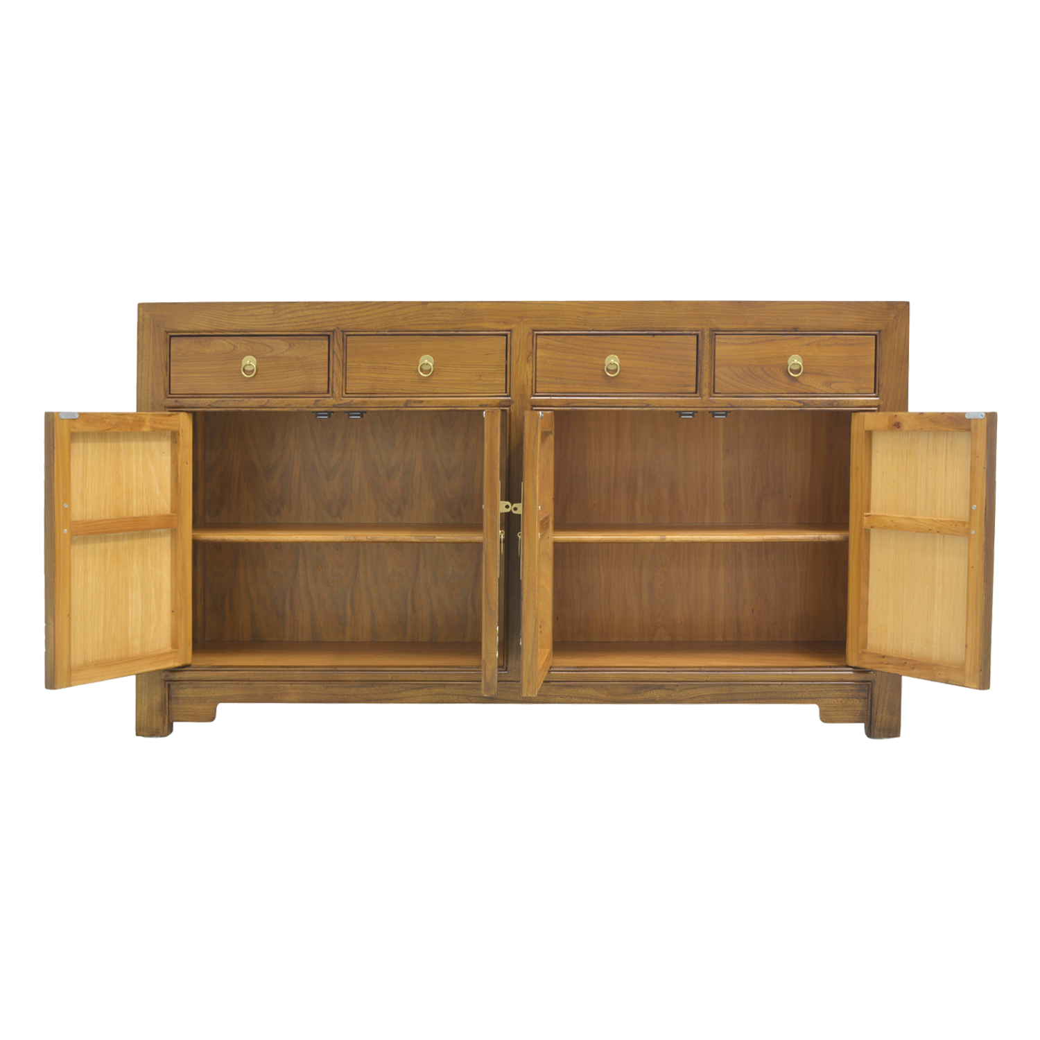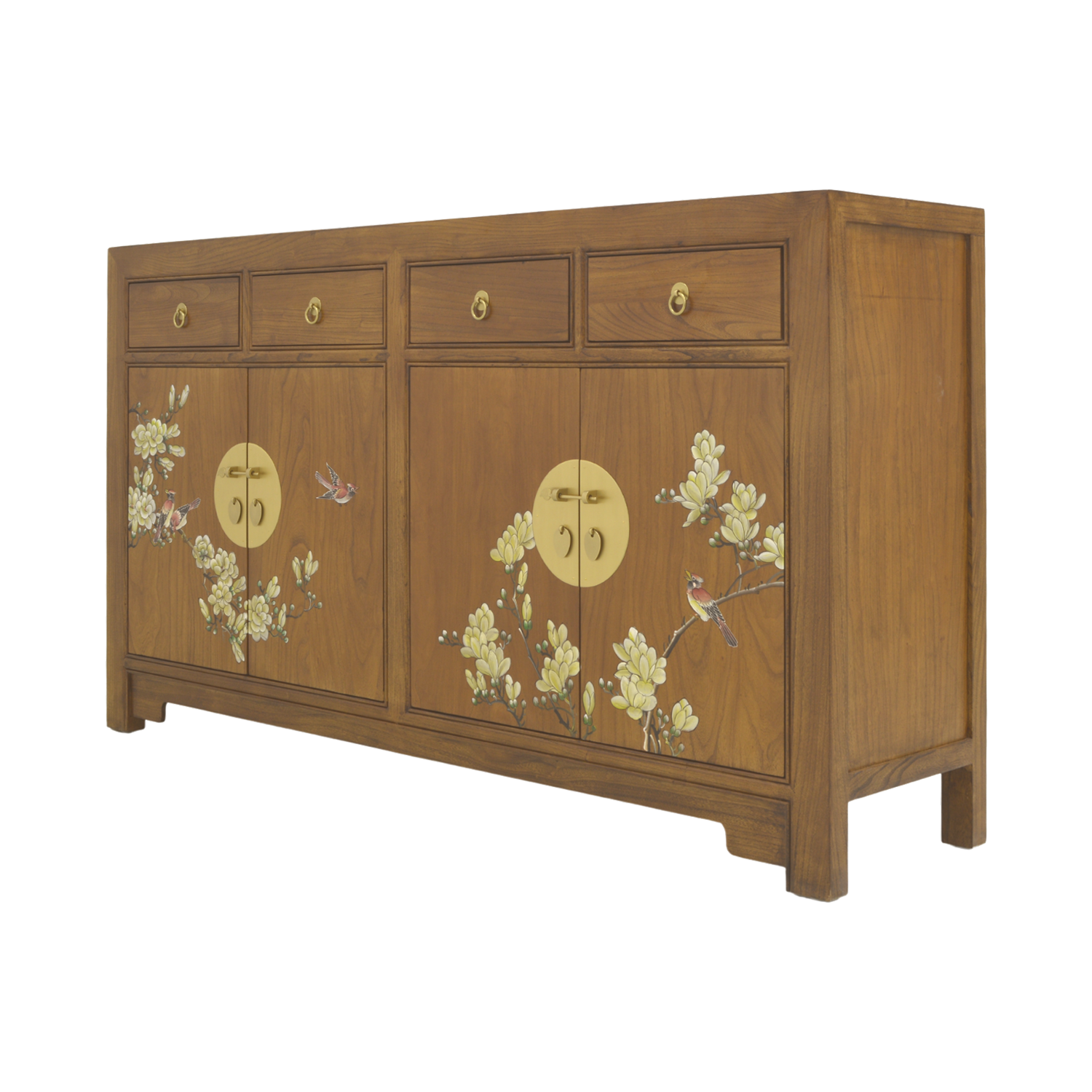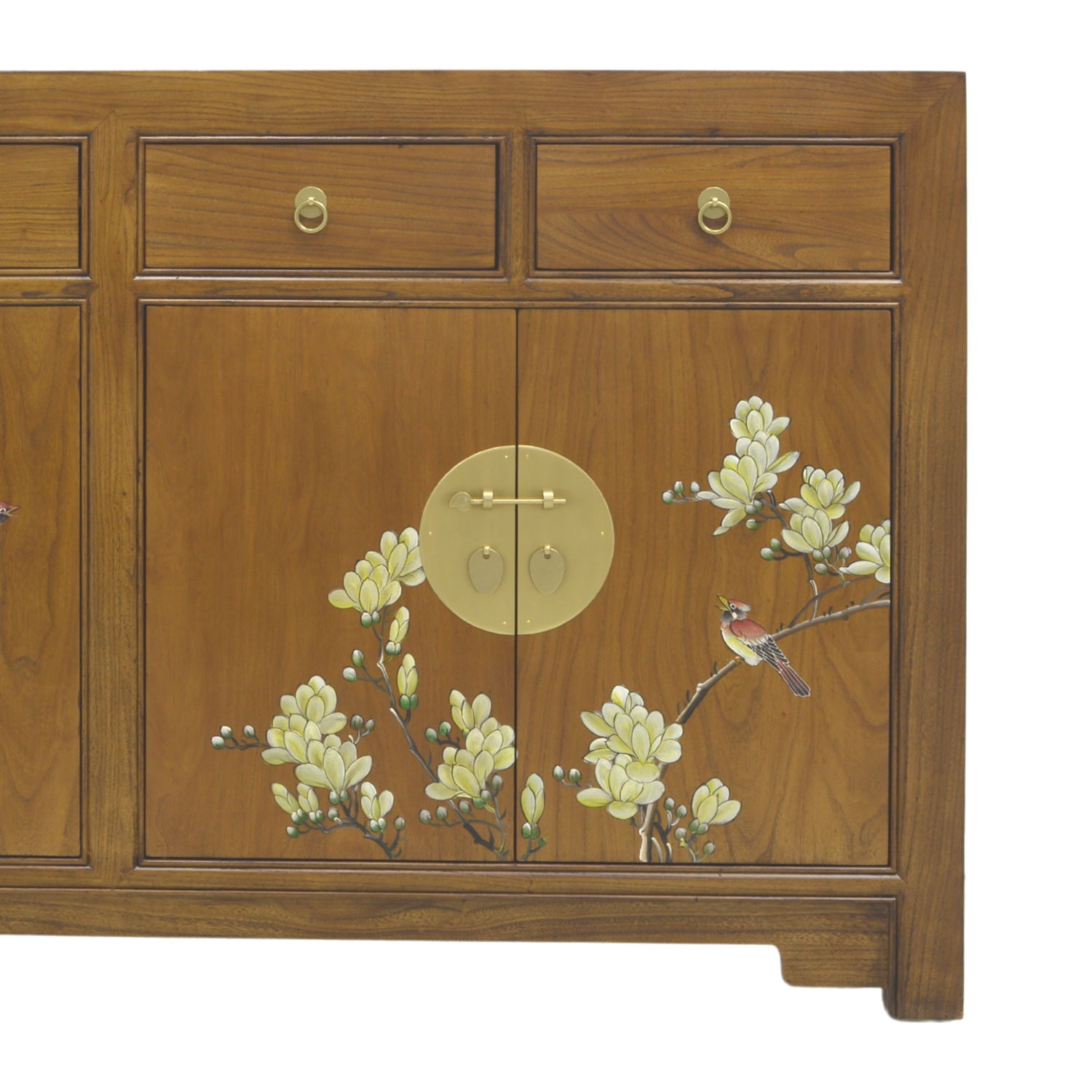 Neither fully minimalist nor chinoiserie, this oriental sideboard elegantly treads the line between both styles with ease, giving the designer full reign to create a fusion between two very different aesthetics. Made from sturdy elm, this oriental sideboard is painted in a glossy light brown, with contrasting brass faceplates and ring pulls, making it a versatile addition to any living space.
