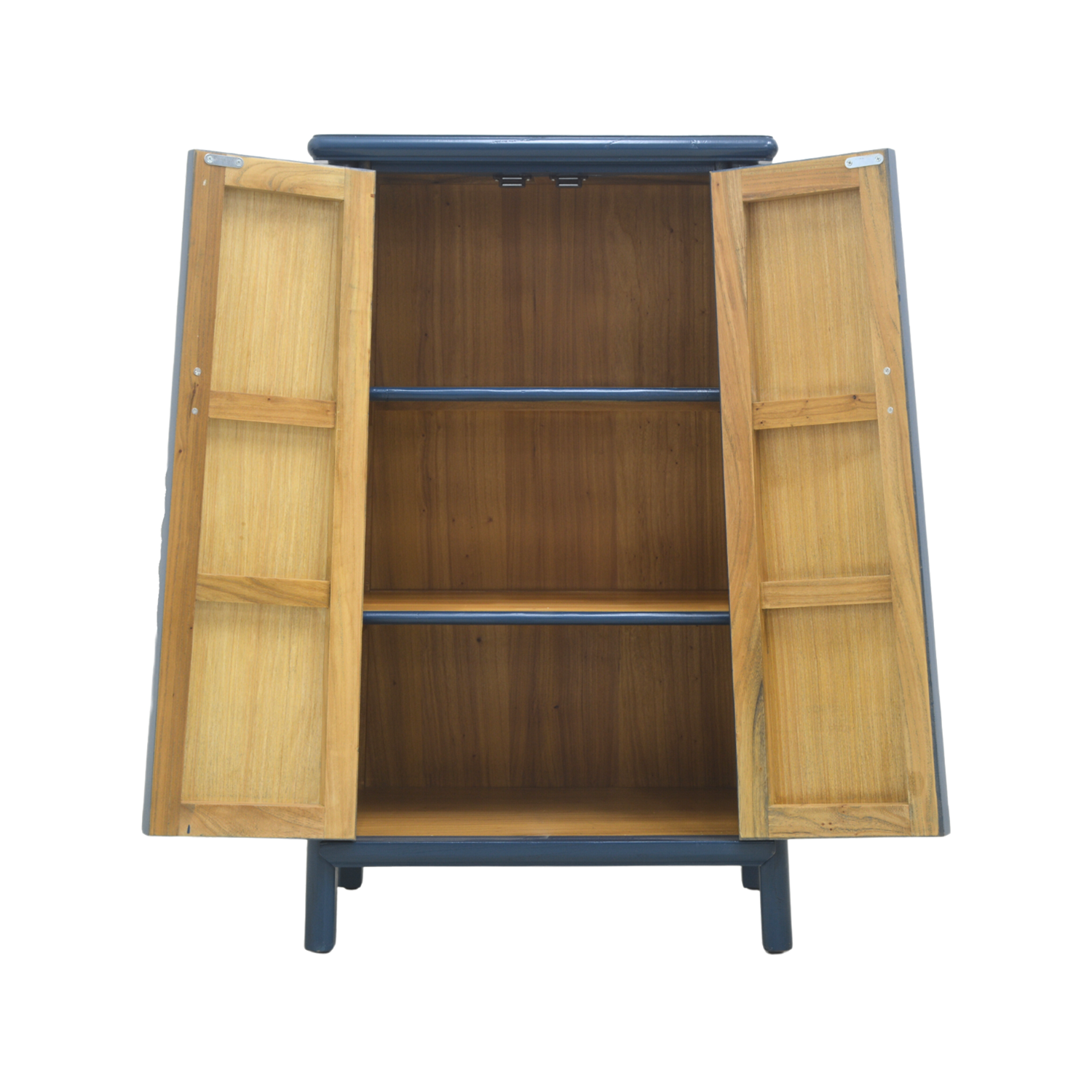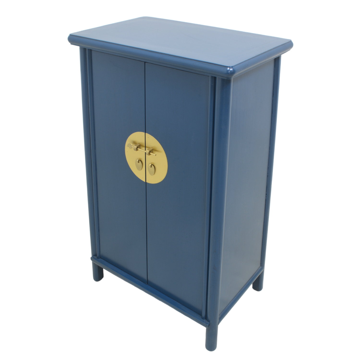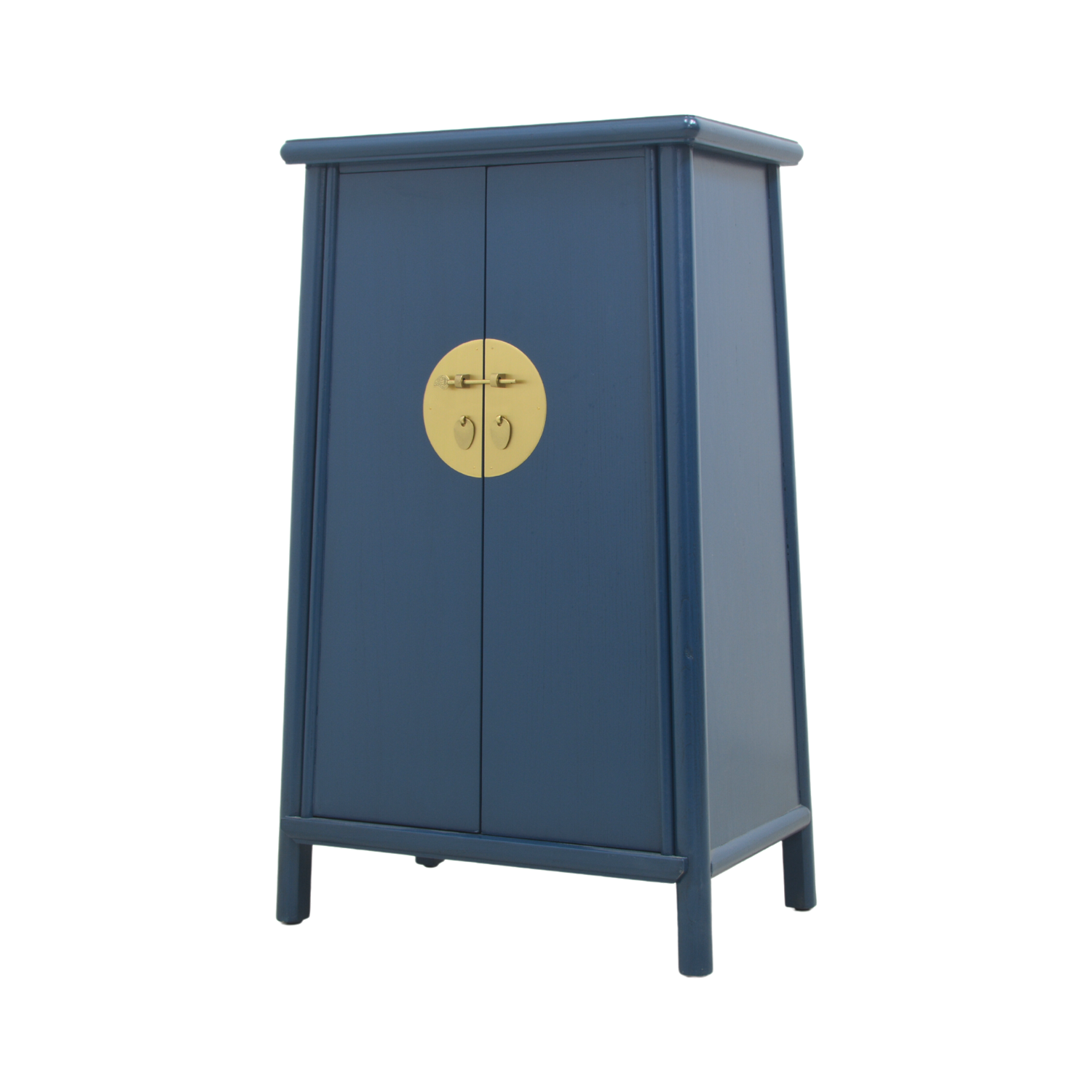 In a burst of contemporary new country style, this royal blue modern two door cabinet features a highly complex yet natural elm wood grain in a classic chinoiserie style. With brass plating to complement the overall feel, this piece is designed to blend seamlessly into any living area. Use it as a hallway storage or simply as additional storage in the bedroom, this cabinet will give the space an earthy, oriental feel.