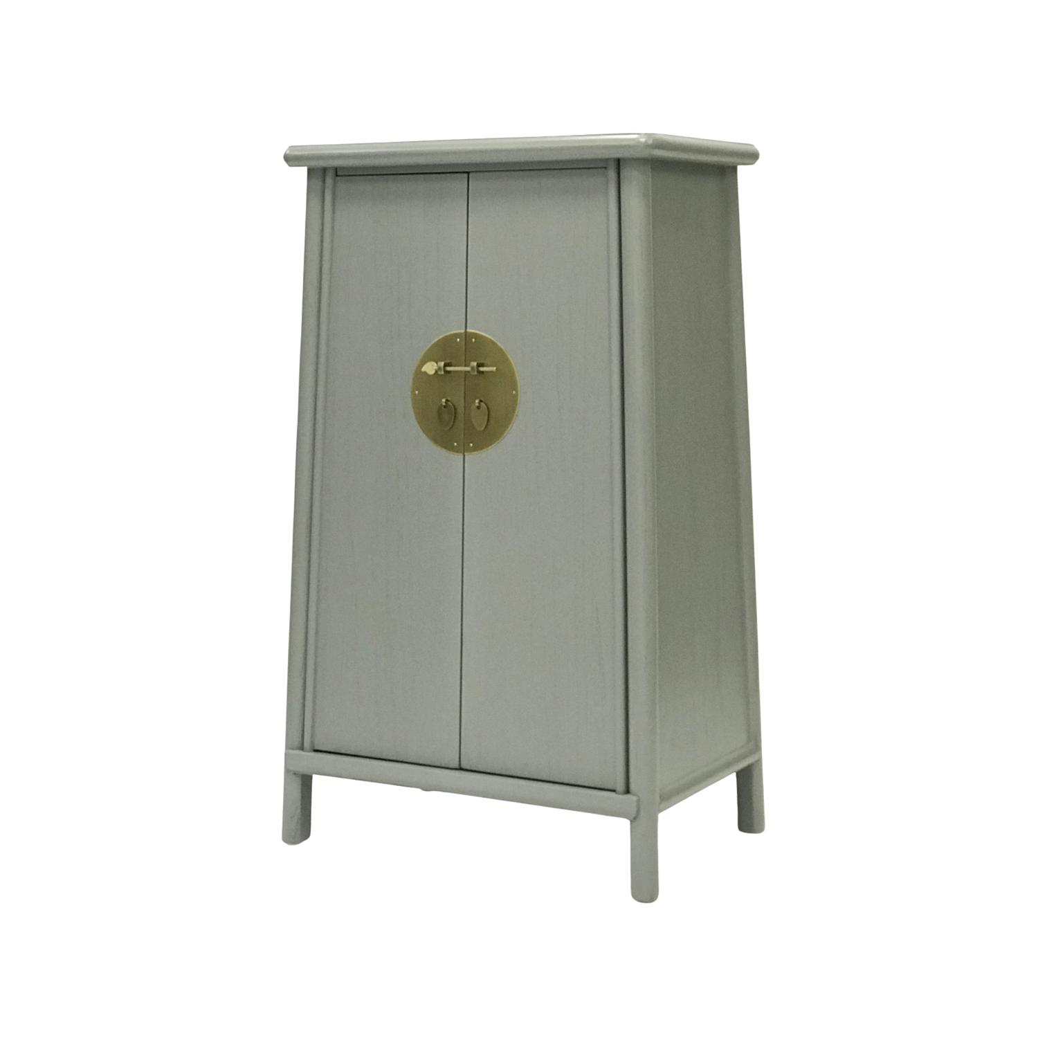 In a burst of contemporary new country style, this slate grey modern two door cabinet features a highly complex yet natural elm wood grain in a classic chinoiserie style. With brass plating to complement the overall feel, this piece is designed to blend seamlessly into any living area. Use it as a hallway storage or simply as additional storage in the bedroom, this cabinet will give the space an earthy, oriental feel.