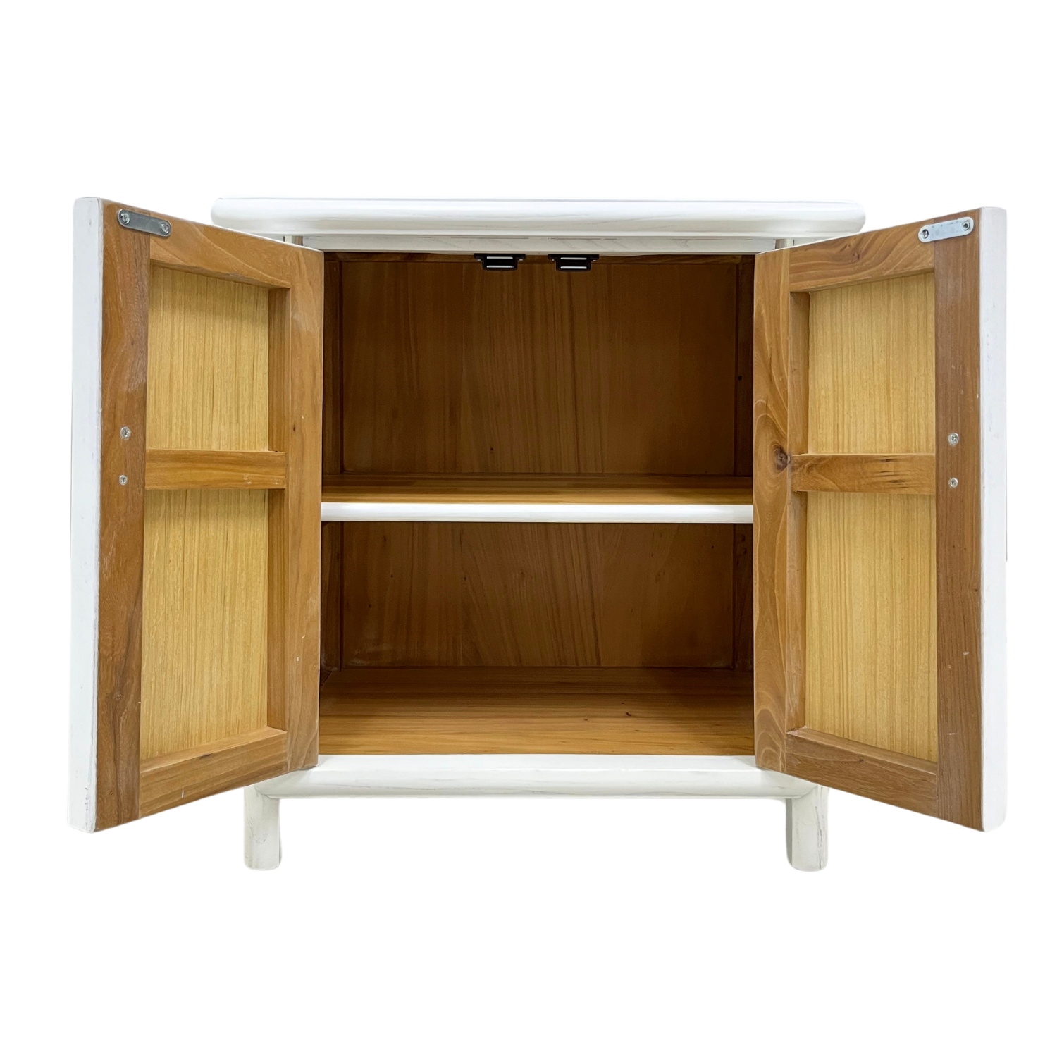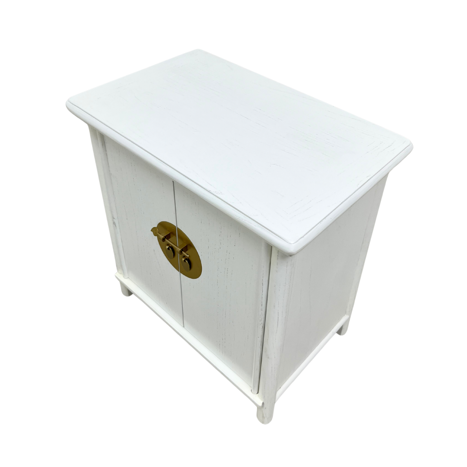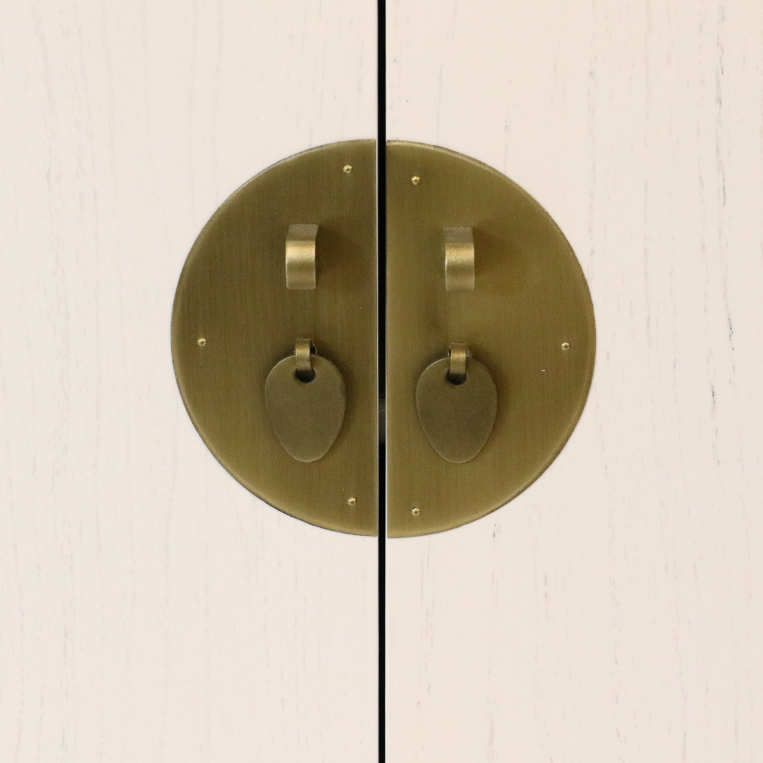 One of the sweetest cabinets we have, this A-shaped cabinet is outwardly simple with a brass face plate and oval pull rings that open to reveal two shelves that are perfect for small items and trinkets to keep by your bedside!
