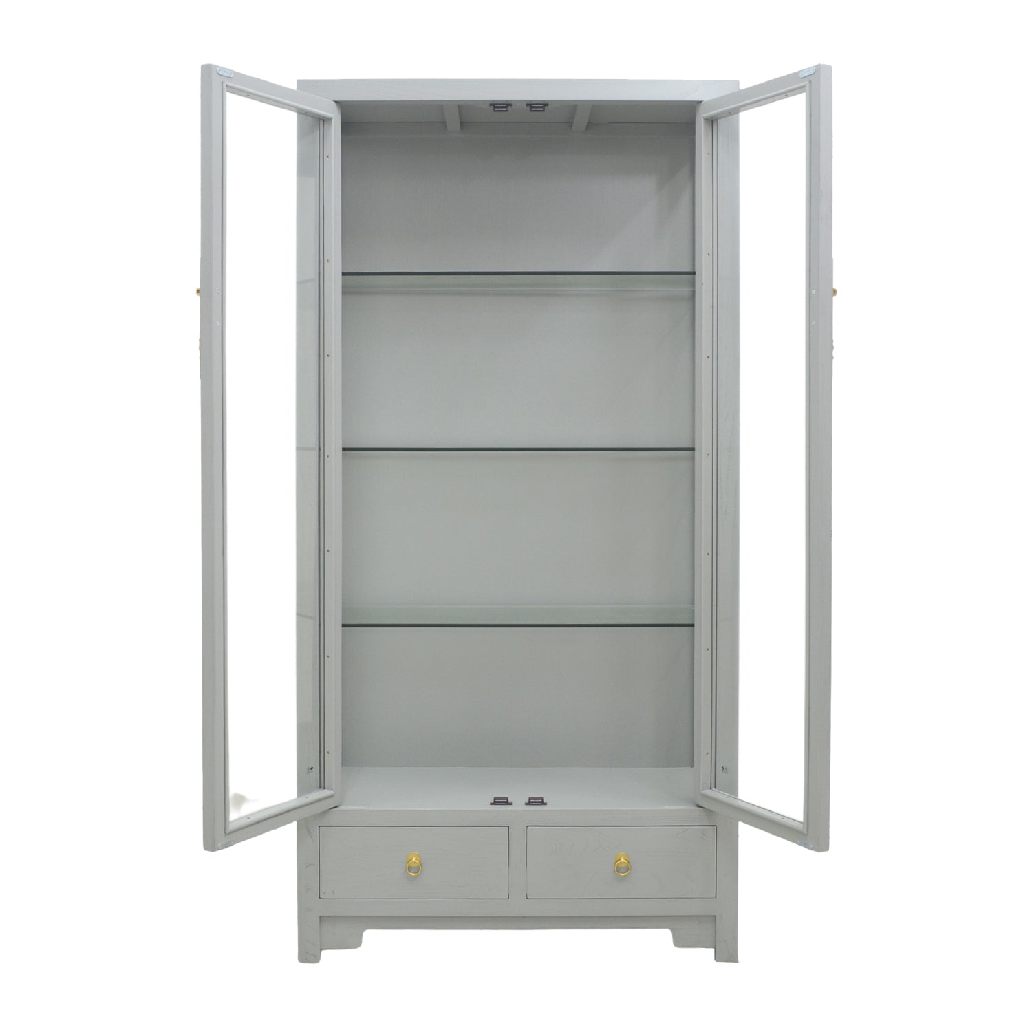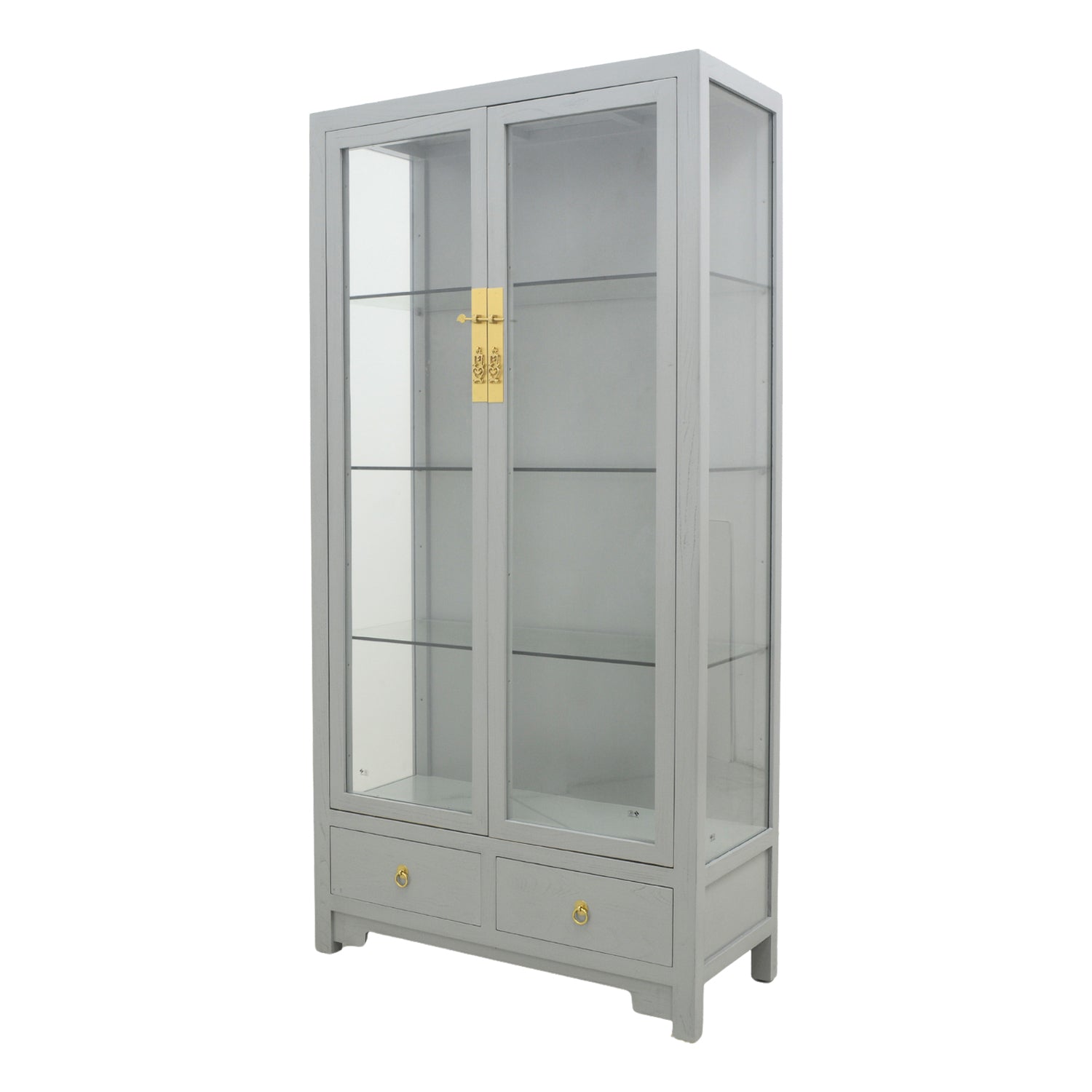Made specifically to show off, this opulent glass cabinet mixes the oriental with the classic with grey washed elm wood, wide glass doors and two drawers below. Decorate its interiors with classic china or simply use it to showcase your passions, keepsakes or valuables, this multi-use cabinet is the book for your story. With intricate brass fittings and a classic teardrop sliding pin lock, this display cabinet brings just a hint of the chinoiserie without being overboard.