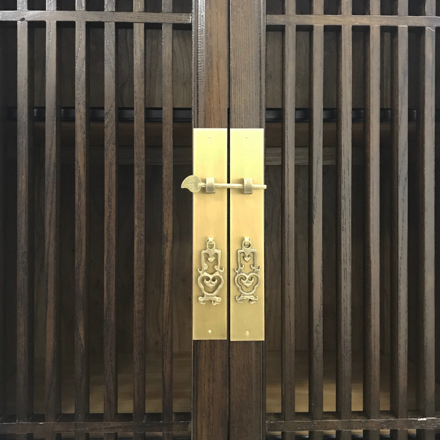 Standing at almost two meters, this tall structure is both a statement as well as an expansive storage space. This design borrows from the Chinese lattice, where it was popular to keep things ventilated, yet hidden from view. The end effect lends any living space with a quiet, minimalistic finish, accented by dark mahogany which showcases the natural grain of the elm wood.