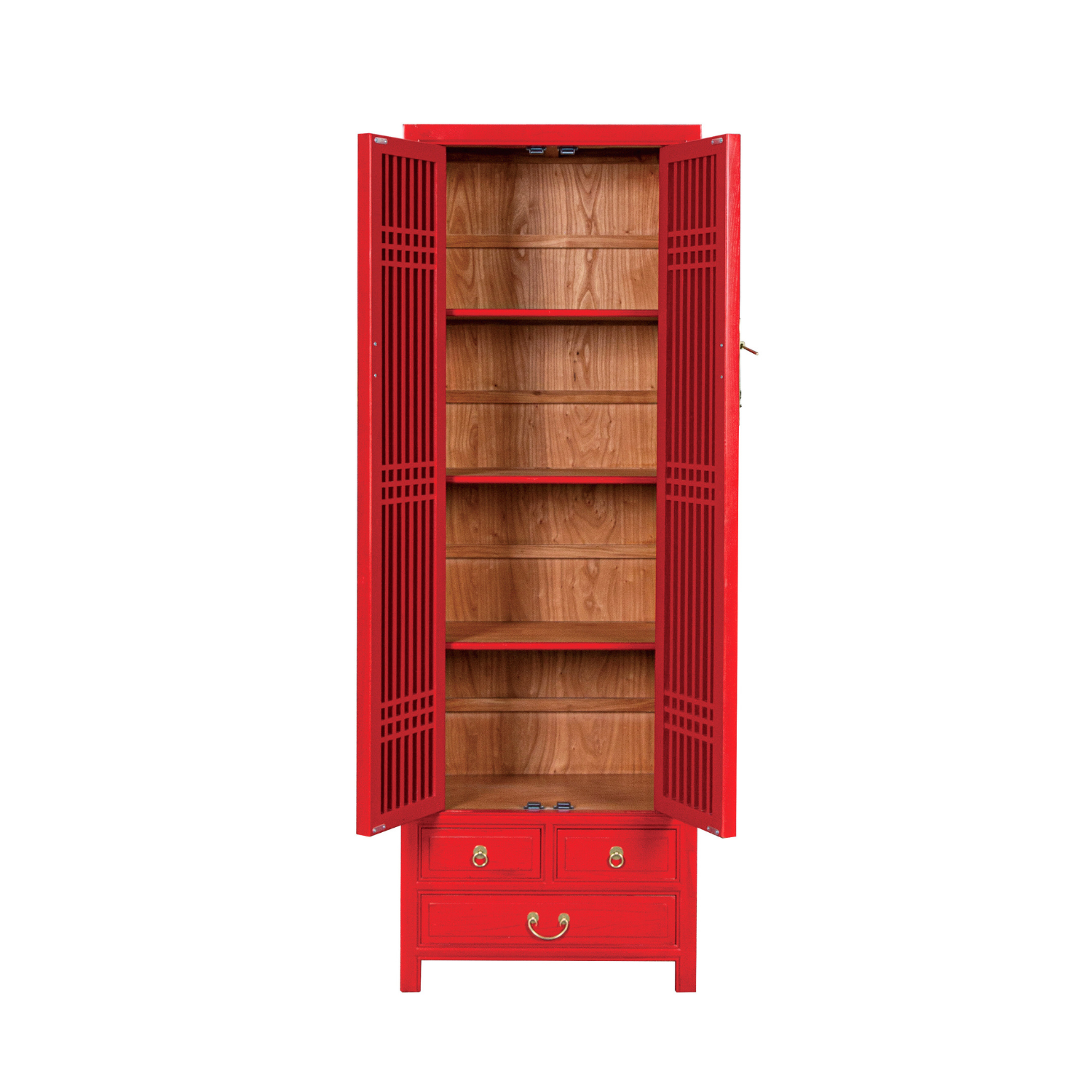 Standing at almost two meters, this tall structure is both a statement as well as an expansive storage space. This design borrows from the Chinese lattice, where it was popular to keep things ventilated, yet hidden from view. The end effect lends any living space with a quiet, minimalistic finish, accented by the redwash, which showcases the natural grain of the elm wood.