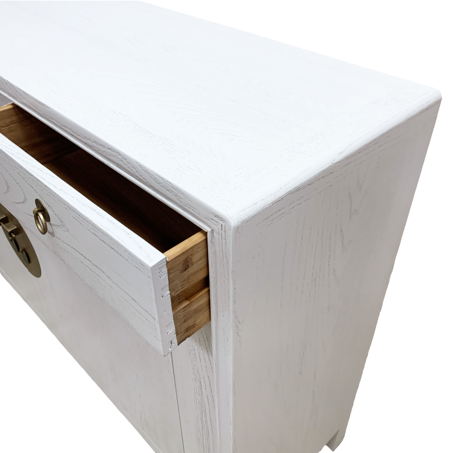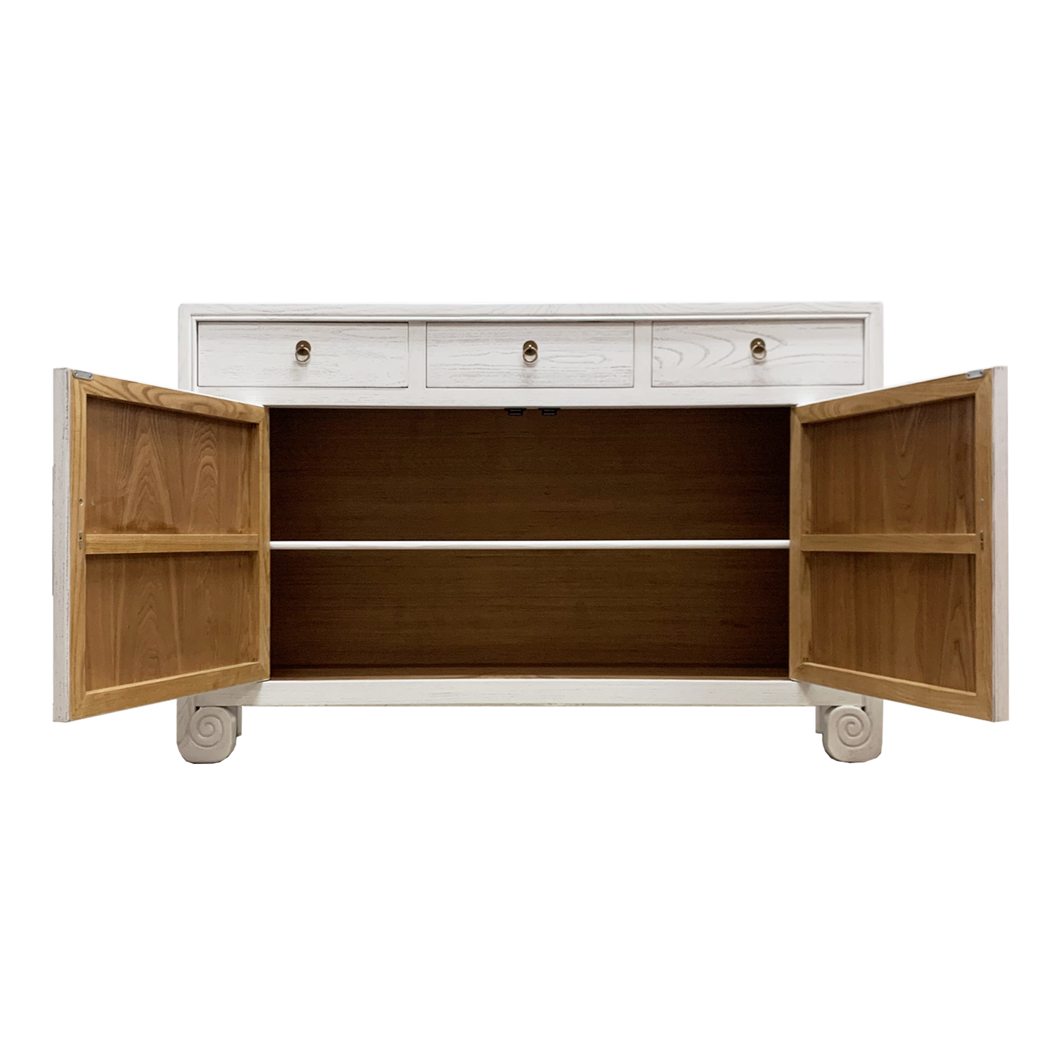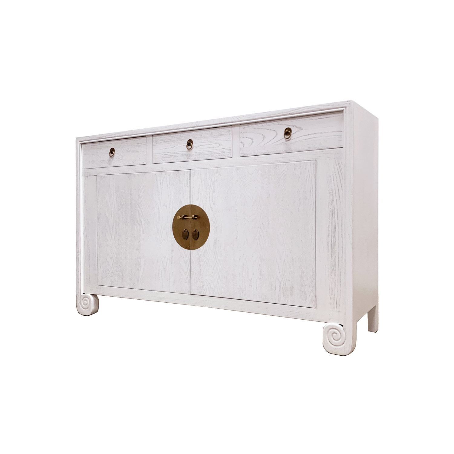 With three drawers and one large middle compartment and painted a stunning white, this sideboard has a unique feature – legs in the shape of scrolls to take a cue from ancient Chinese carpentry. Paired with brass faceplates and magnetic closures, it is the perfect fusion of the past and present.