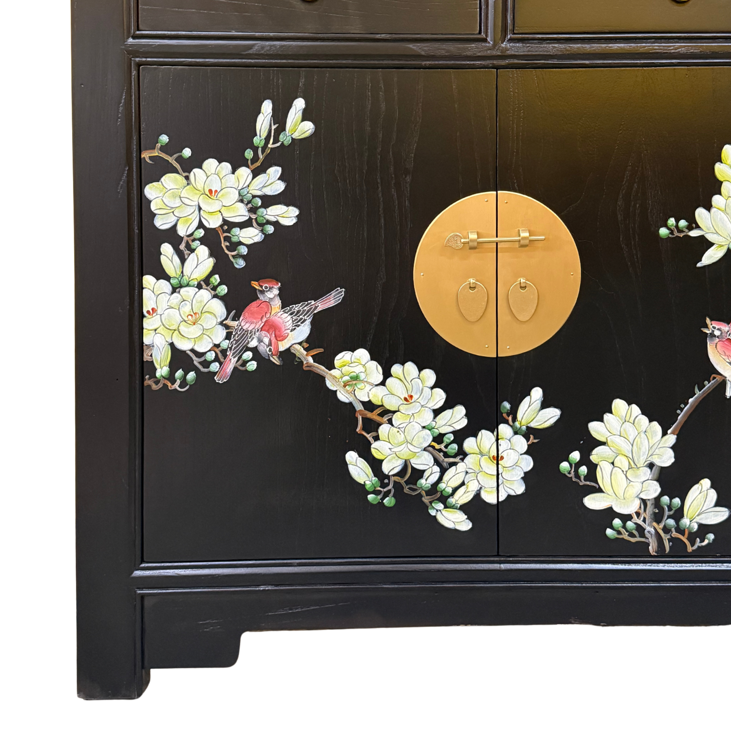 This gorgeous side cabinet is both trendy and traditional. The organic colours of the flowing florals show enough contrast to balance the aesthetic. Fitted with a brass faceplate and a sliding pin lock, this sideboard has two large compartments and two smaller drawers, perfect for living room storage.