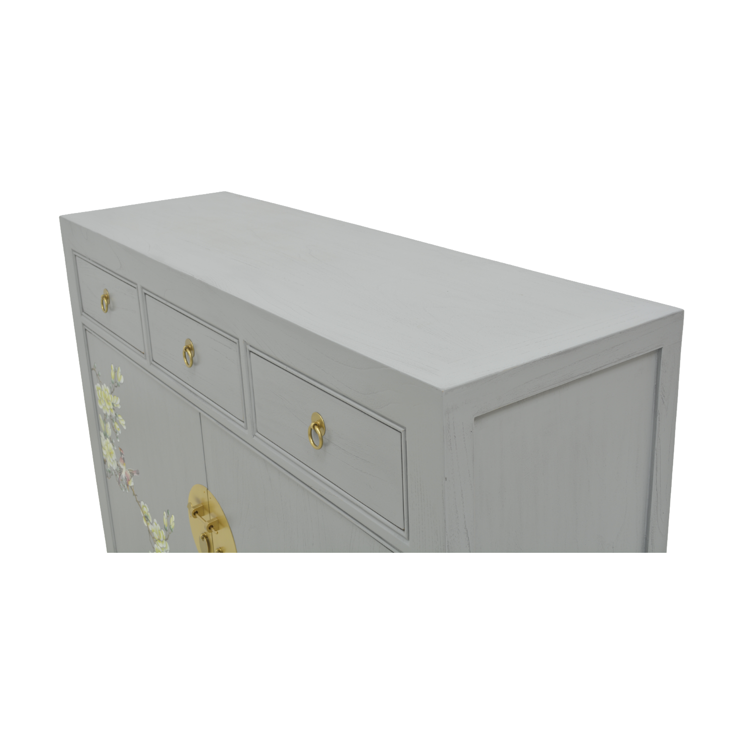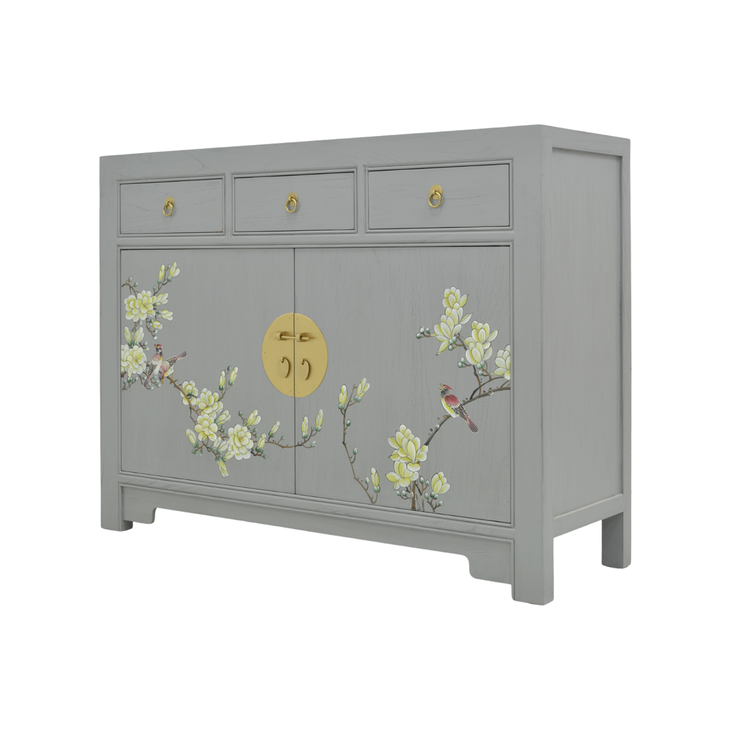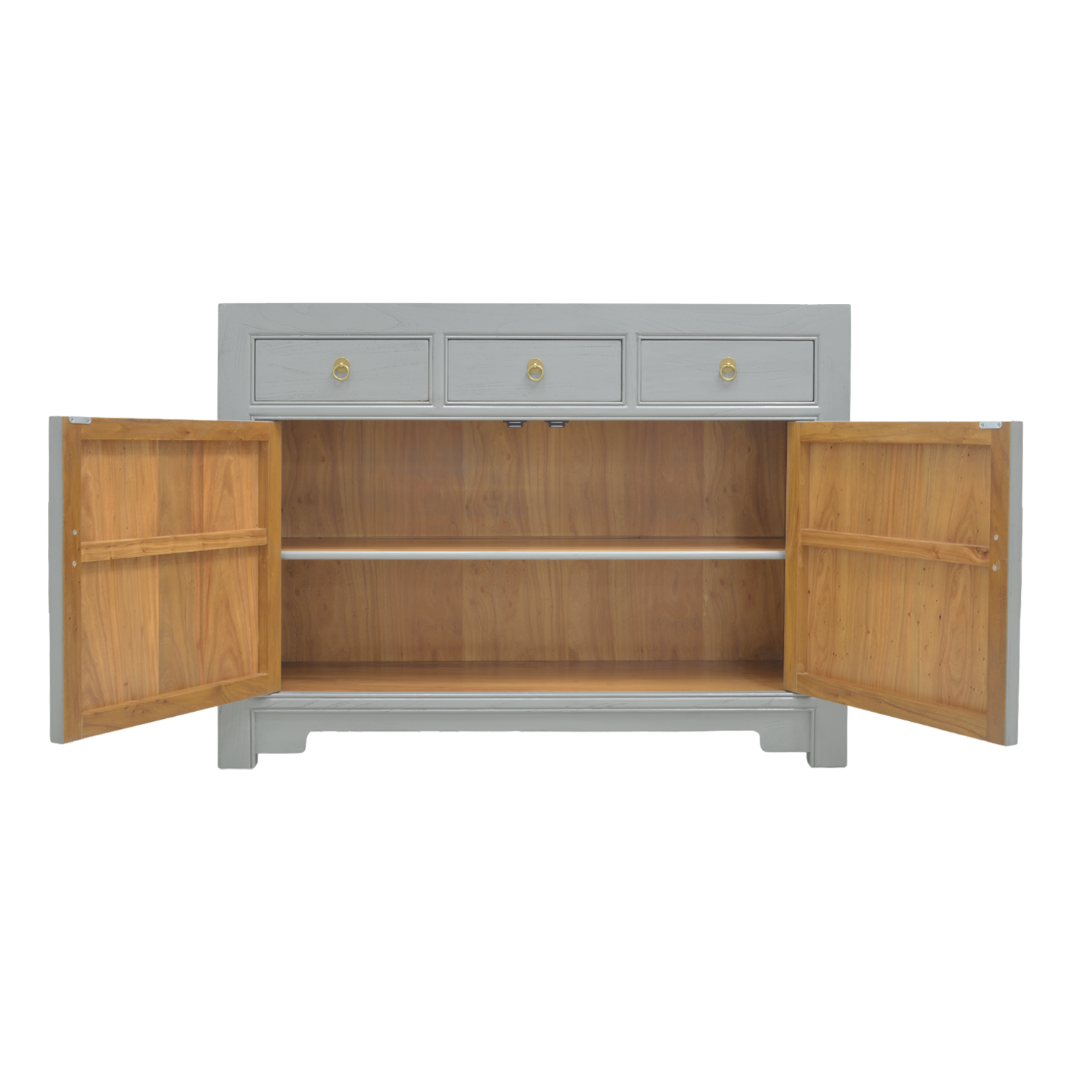 This generously sized sideboard features a trendy grey canvas with burnished gold coloured brass handles. Organic natural lines feature heavily in this piece, while the form meets function with the available storage space. With two outward swinging doors and three drawers, this piece is suitable for any type of interior décor, lending the room a subtle hint of the orient.