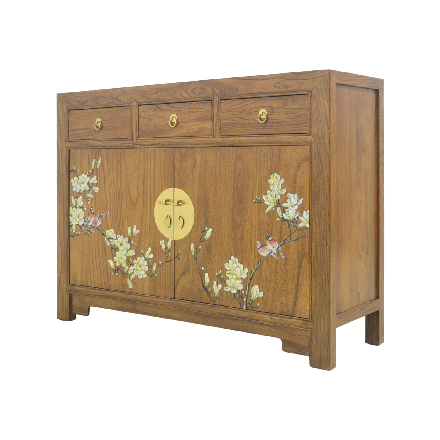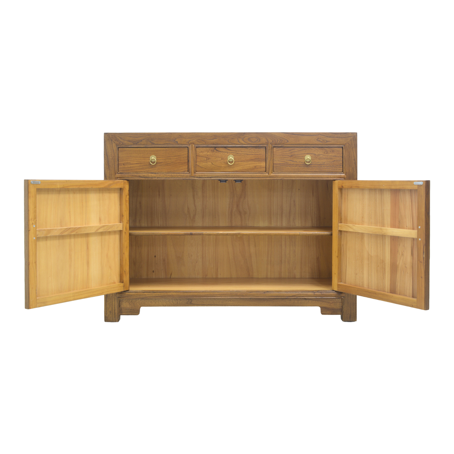 This generously sized sideboard features a light brown canvas with burnished gold coloured brass handles. Organic natural lines feature heavily in this piece, while the form meets function with the available storage space. With two outward swinging doors and three drawers, this piece is suitable for any type of interior décor, lending the room a subtle hint of the orient.