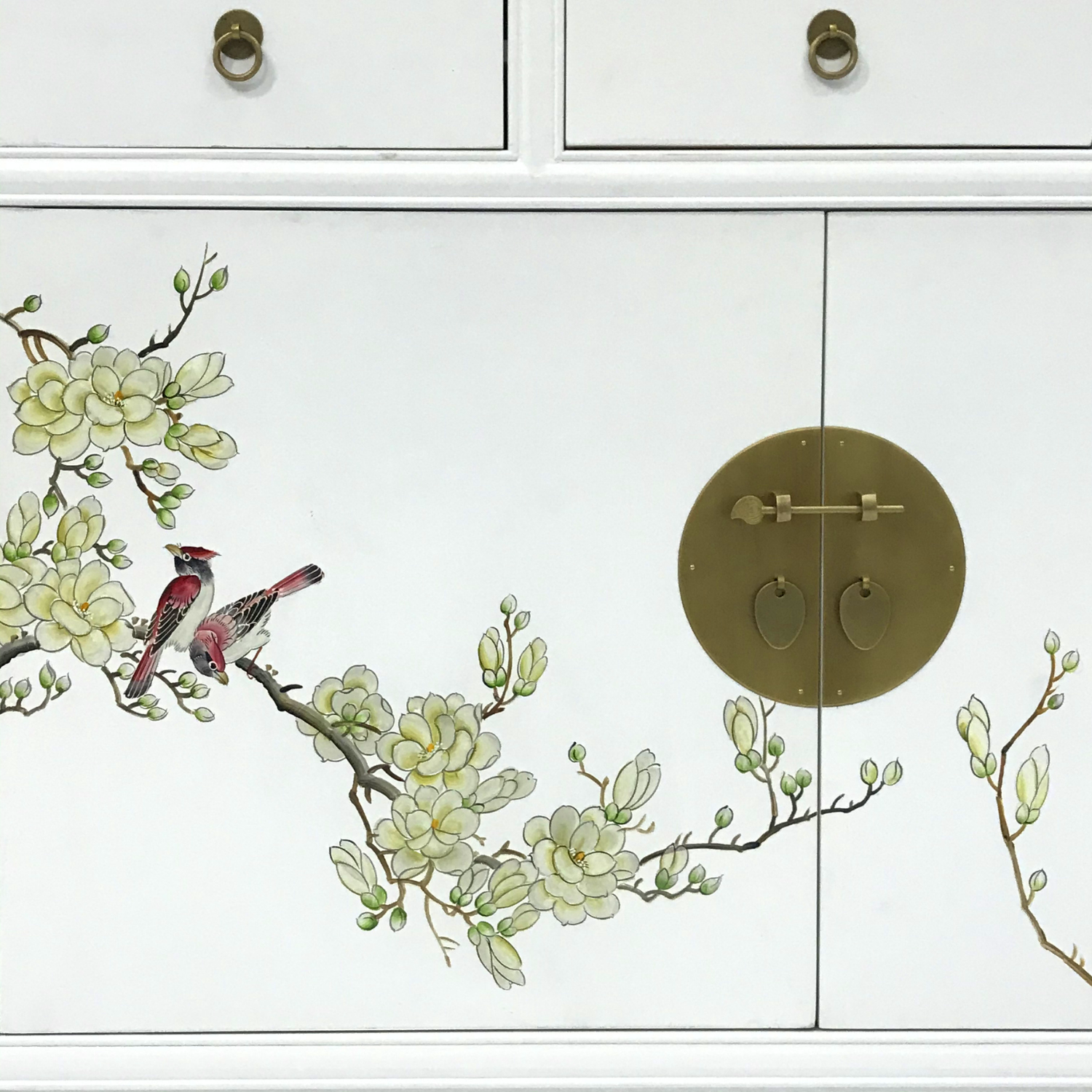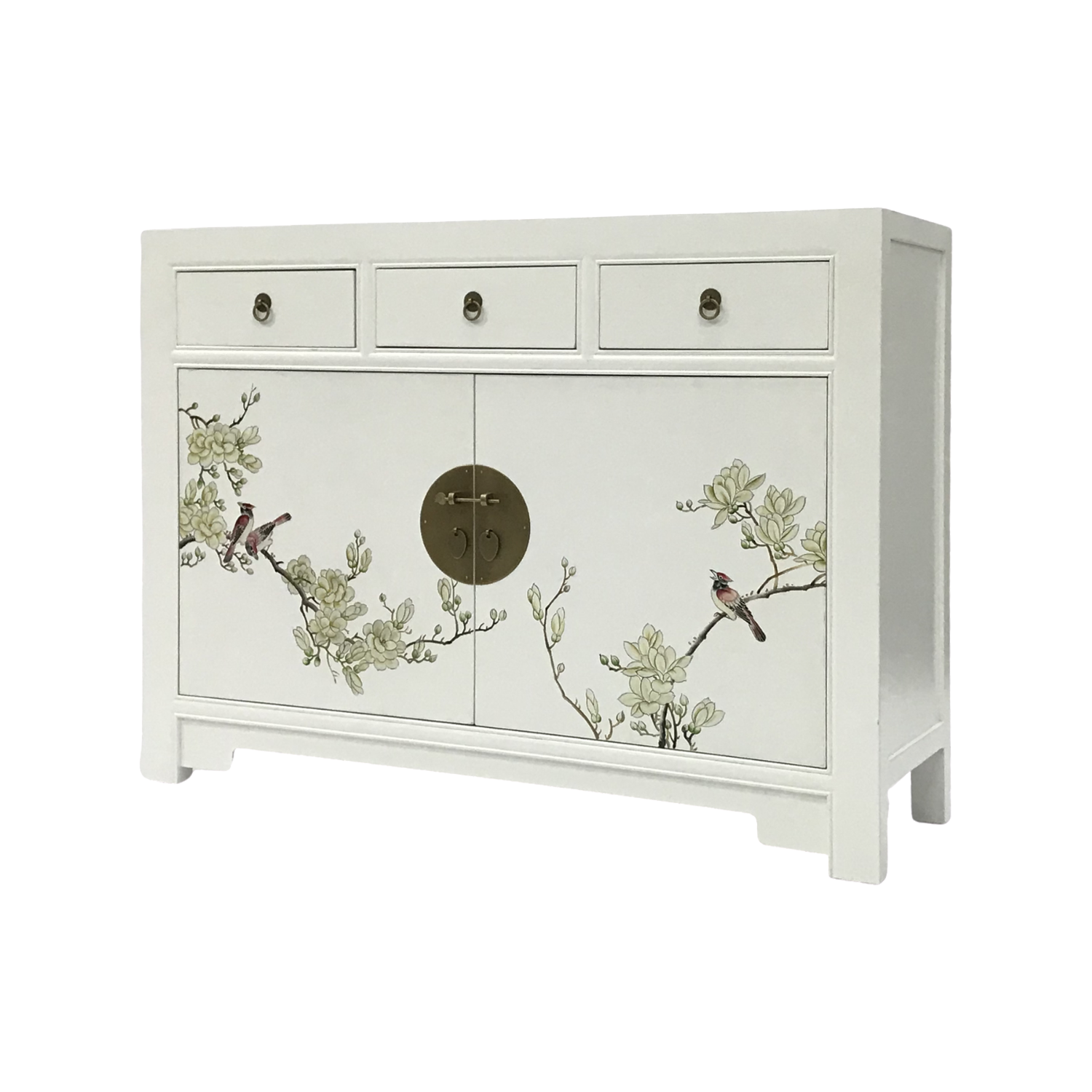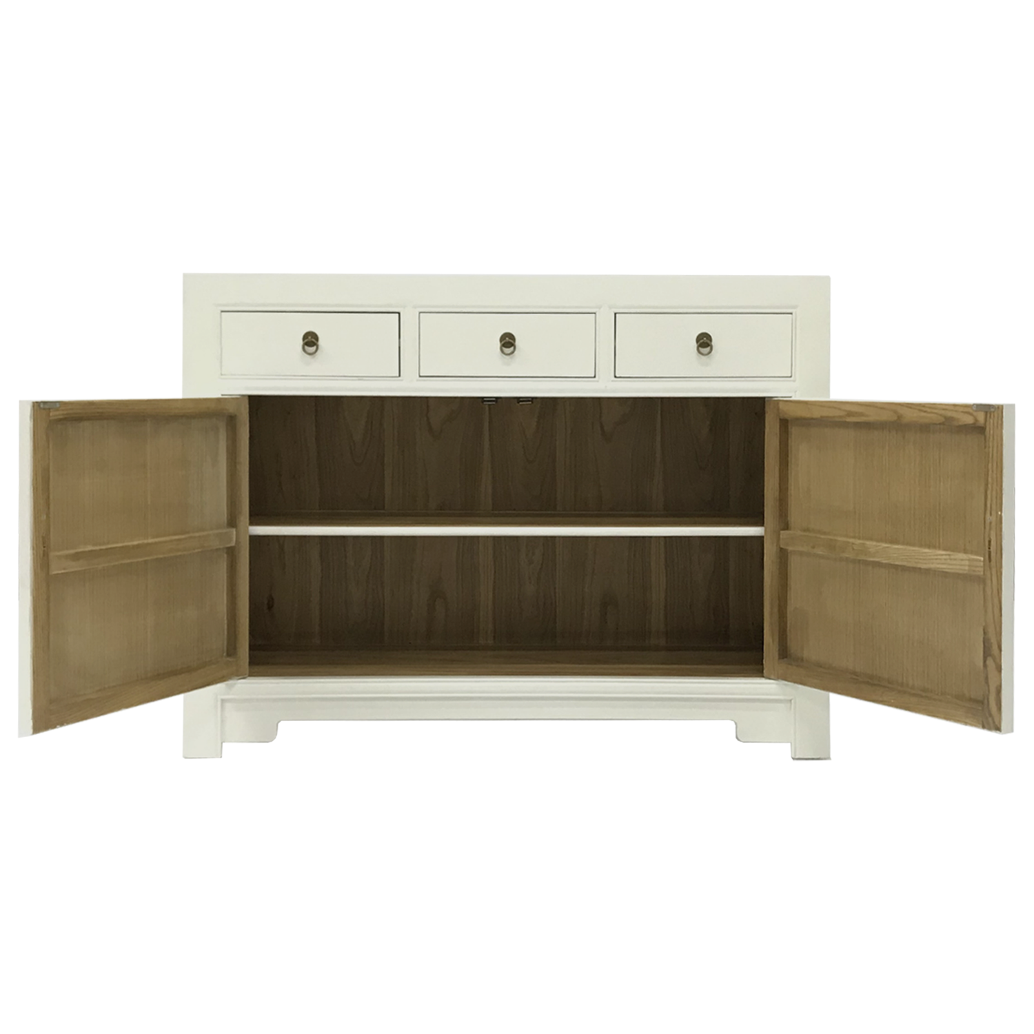 This generously sized sideboard features a white-washed canvas with burnished gold coloured brass handles. Organic natural lines feature heavily in this piece, while the form meets function with the available storage space. With two outward swinging doors and three drawers, this piece is suitable for any type of interior décor, lending the room a subtle hint of the orient.