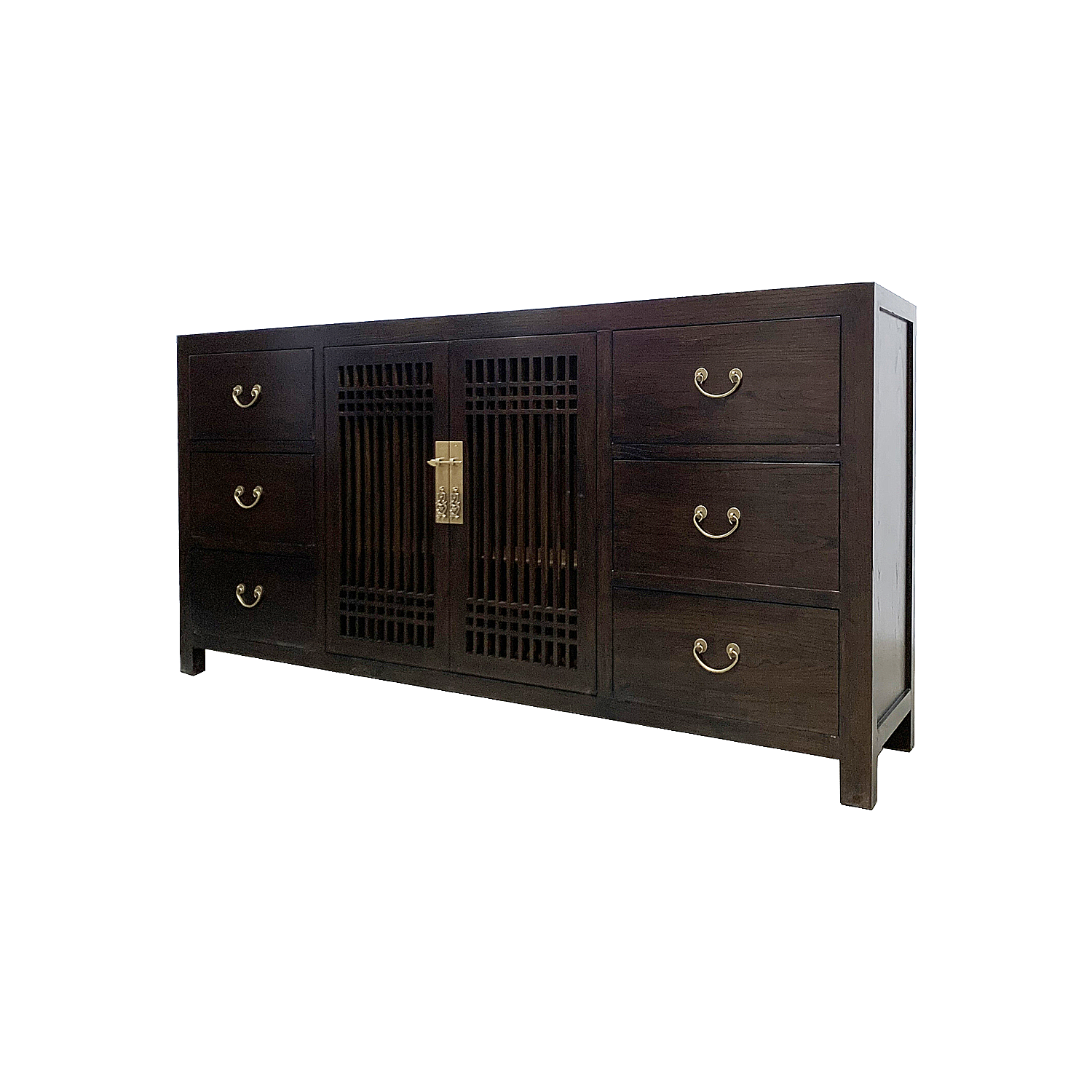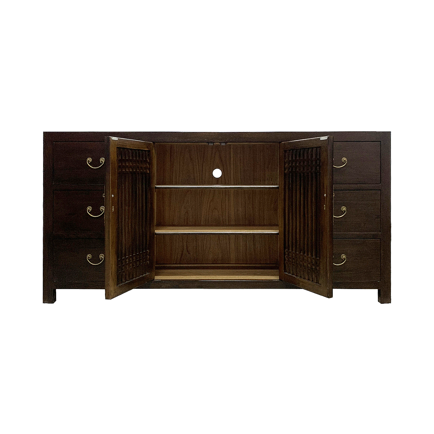 In a classic twist of east meets west, this rich chocolate side piece is made of sturdy elm wood in the time-honoured lattice design. With a whopping number of six drawers and a spacious middle compartment accented by two outward swinging doors and a cable hole, this is ideal not only as a perch for a bedroom television, but also as a station by the hallway for excess storage space.