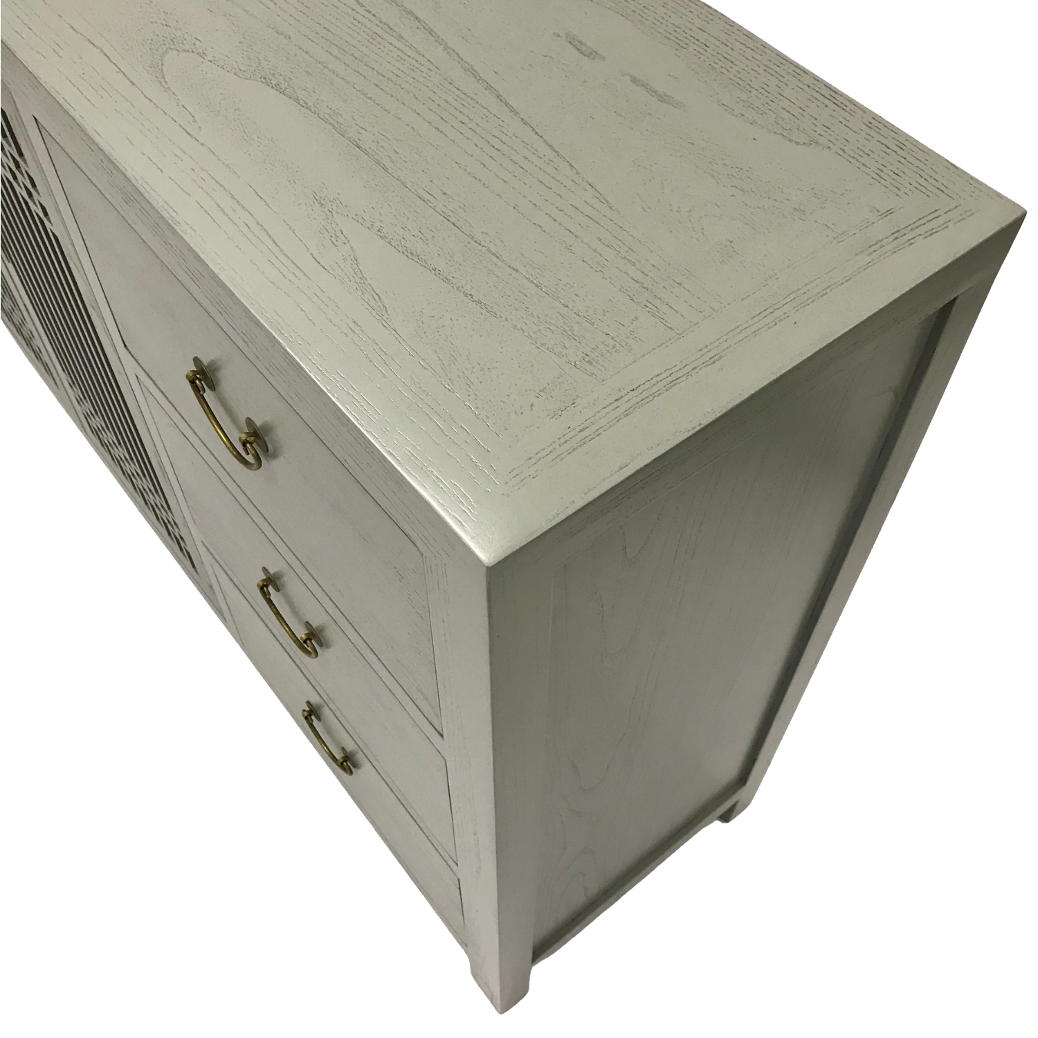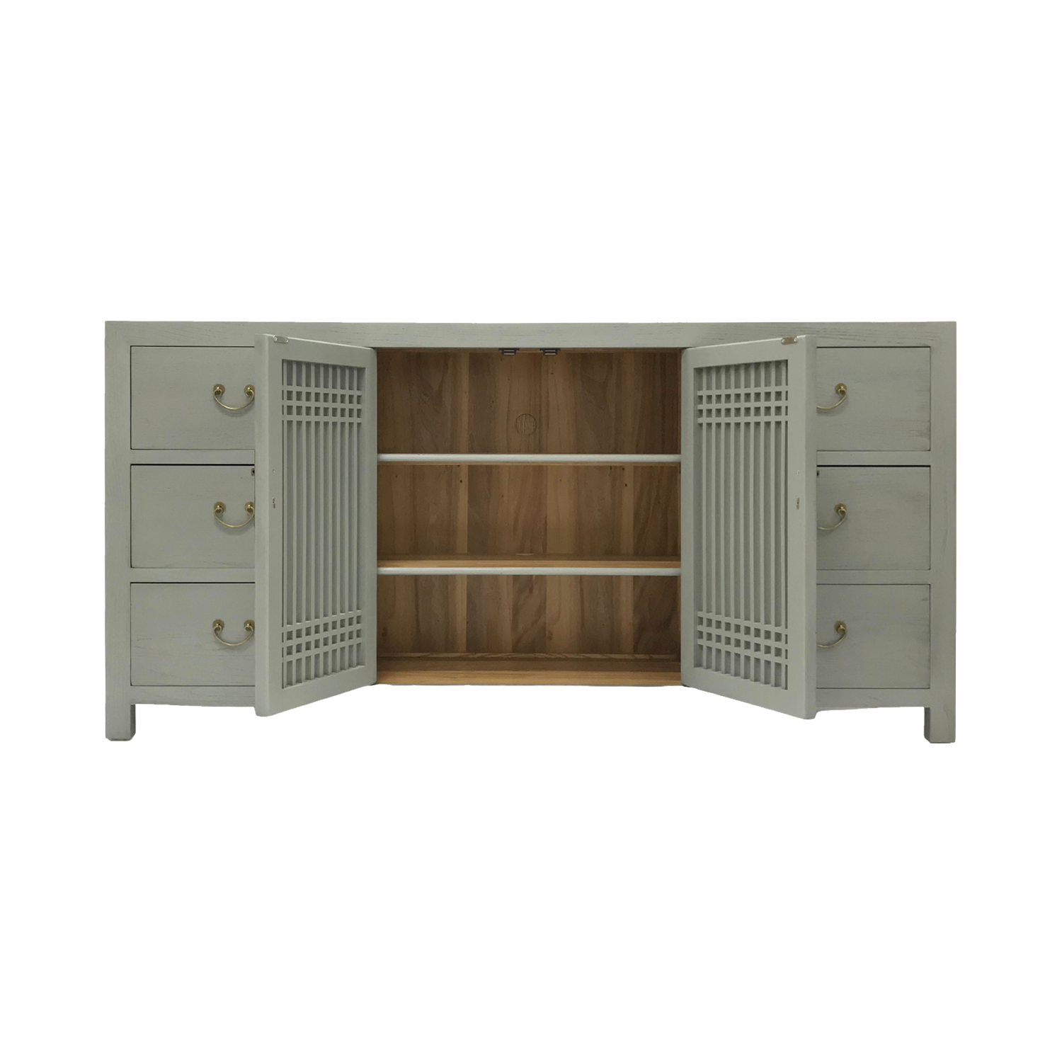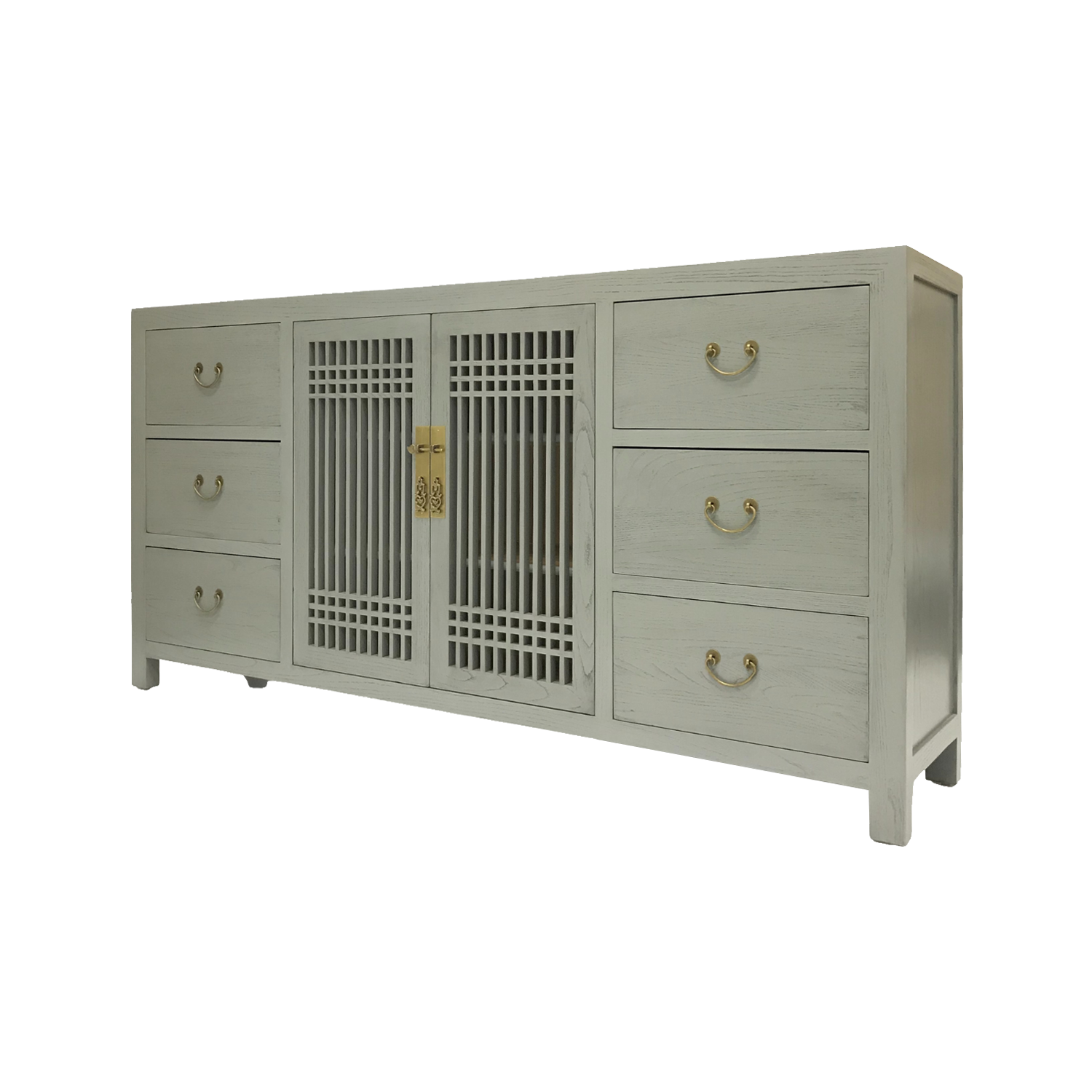 In a classic twist of east meets west, this grey side piece is made of sturdy elm wood in the time-honoured lattice design. With a whopping number of six drawers and a spacious middle compartment accented by two outward swinging doors and a cable hole, this is ideal not only as a perch for a bedroom television, but also as a station by the hallway for excess storage space.