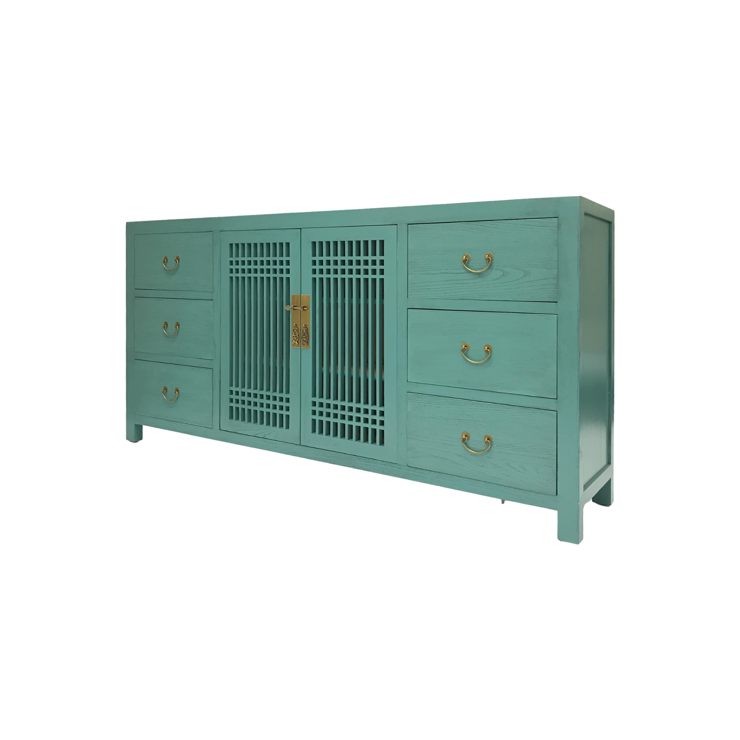 In a classic twist of east meets west, this turquoise wash side piece is made of sturdy elm wood in the time-honoured lattice design. With a whopping number of six drawers and a spacious middle compartment accented by two outward swinging doors and a cable hole, this is ideal not only as a perch for a bedroom television, but also as a station by the hallway for excess storage space.