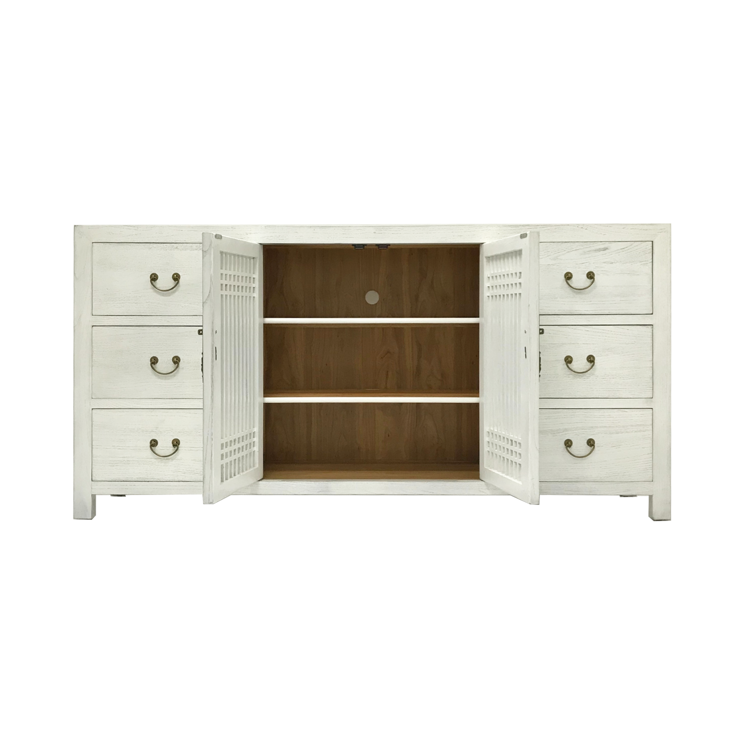 In a classic twist of east meets west, this whitewashed side piece is made of sturdy elm wood in the time-honoured lattice design. With a whopping number of six drawers and a spacious middle compartment accented by two outward swinging doors and a cable hole, this is ideal not only as a perch for a bedroom television, but also as a station by the hallway for excess storage space.