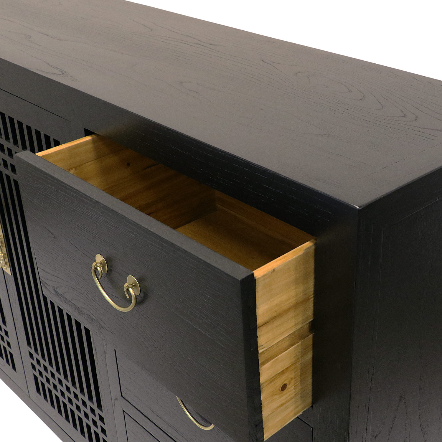 In a classic twist of east meets west, this black side piece is made of sturdy elm wood in the time-honoured lattice design. With a whopping number of six drawers and a spacious middle compartment accented by two outward swinging doors and a cable hole, this is ideal not only as a perch for a bedroom television, but also as a station by the hallway for excess storage space.