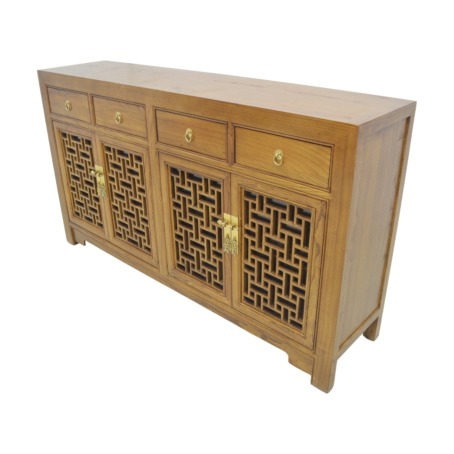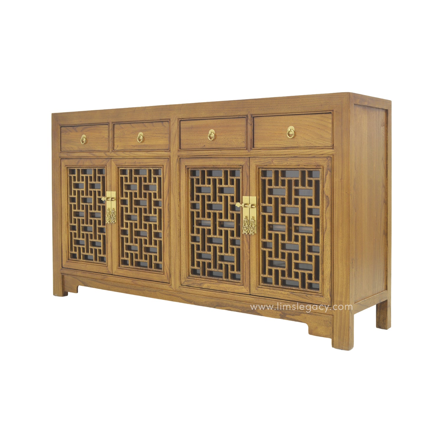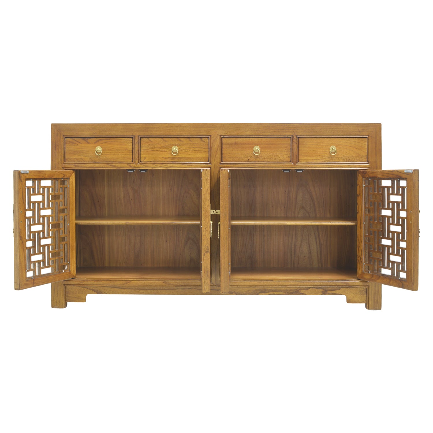 Borrowed from the ancient dynasties of China, this delicate latticework is a feature of the Ming dynasty, widely to be considered the golden age of furniture and art. Fluidly minimalist, this sideboard marries form and function by carving symmetrical windows in the elmwood, while using brass to embellish the handles. In a natural light brown, this cupboard is both understated and useful, conveniently blending into almost any interior.