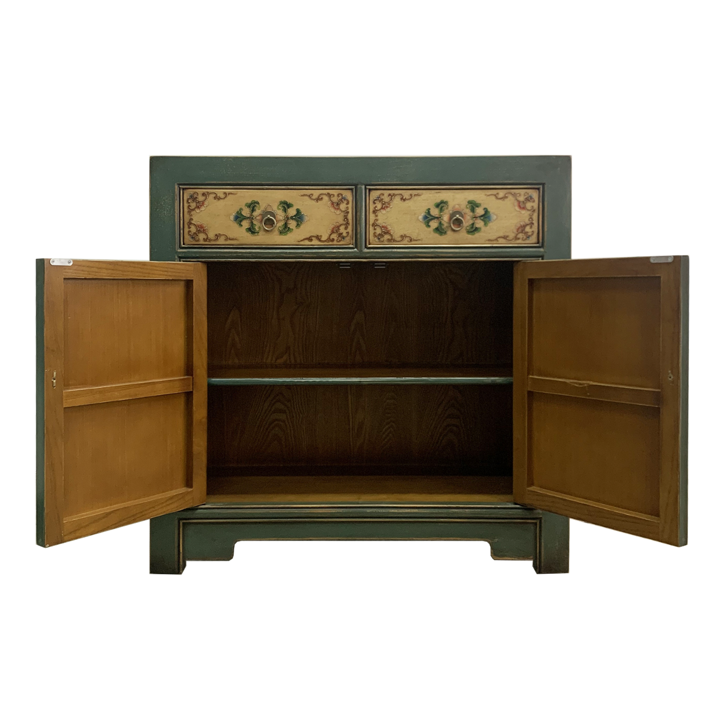 Often placed in the middle of a living area or towards the side, the ancient Chinese sideboards were a very important part of historical Chinese furniture. A comfortable waist height with double swinging doors, this distressed teal cabinet features intricate floral paintings on both doors and filigree on the drawers as well. Ideal for the avid decorator with a soft spot for the chinoiserie, this cabinet brings decadence to any space.