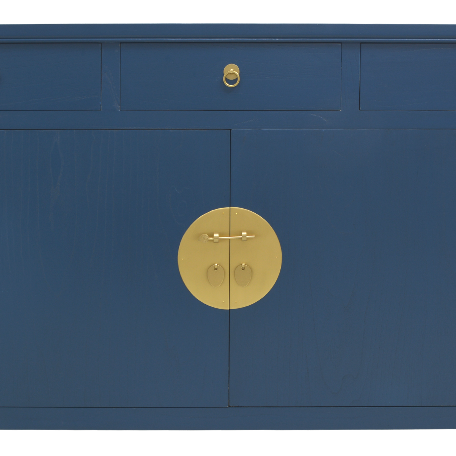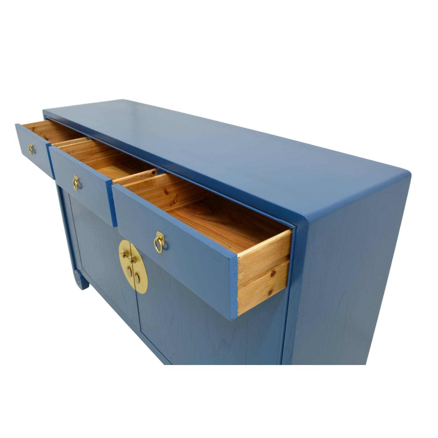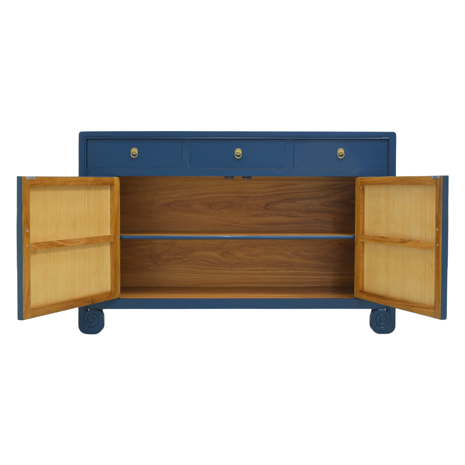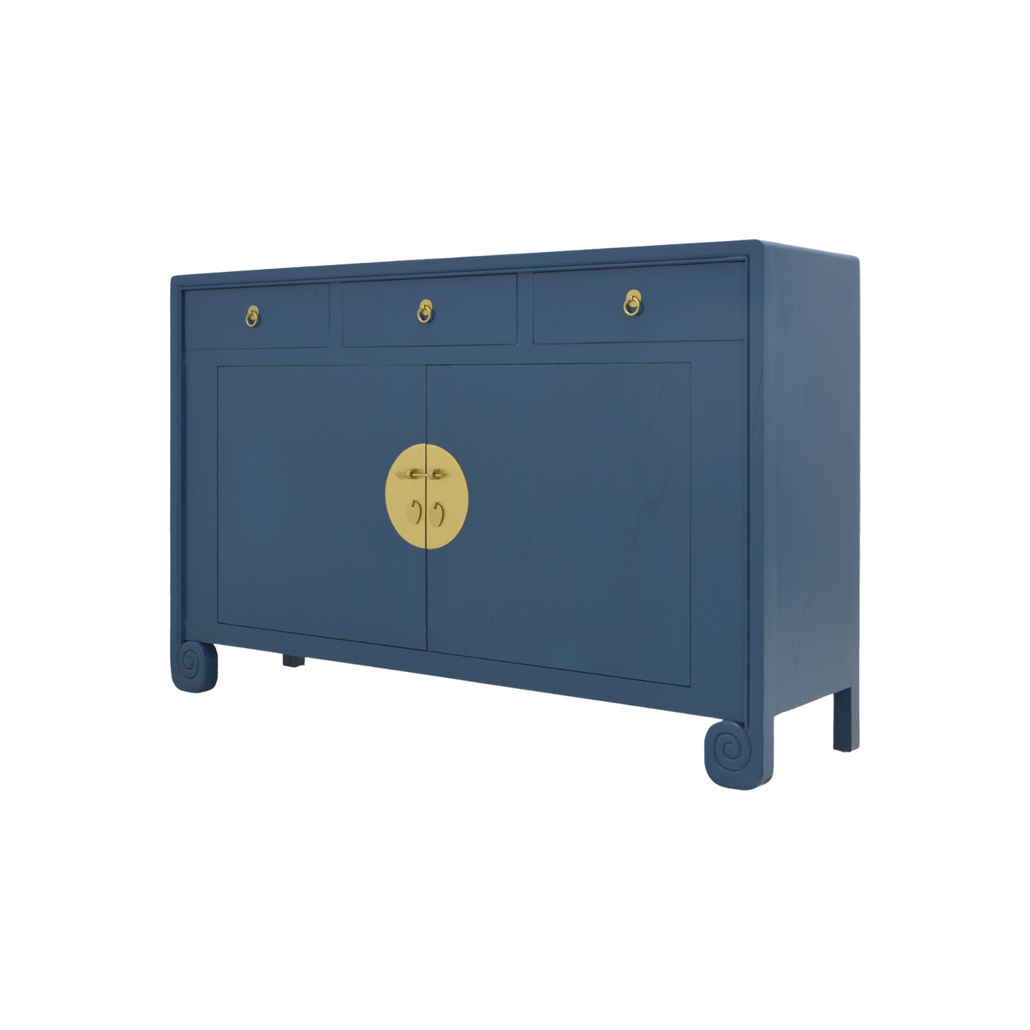 With three drawers and one large middle compartment and painted a stunning blue, this sideboard has a unique feature – legs in the shape of scrolls to take a cue from ancient Chinese carpentry. Paired with brass faceplates and magnetic closures, it is the perfect fusion of the past and present.