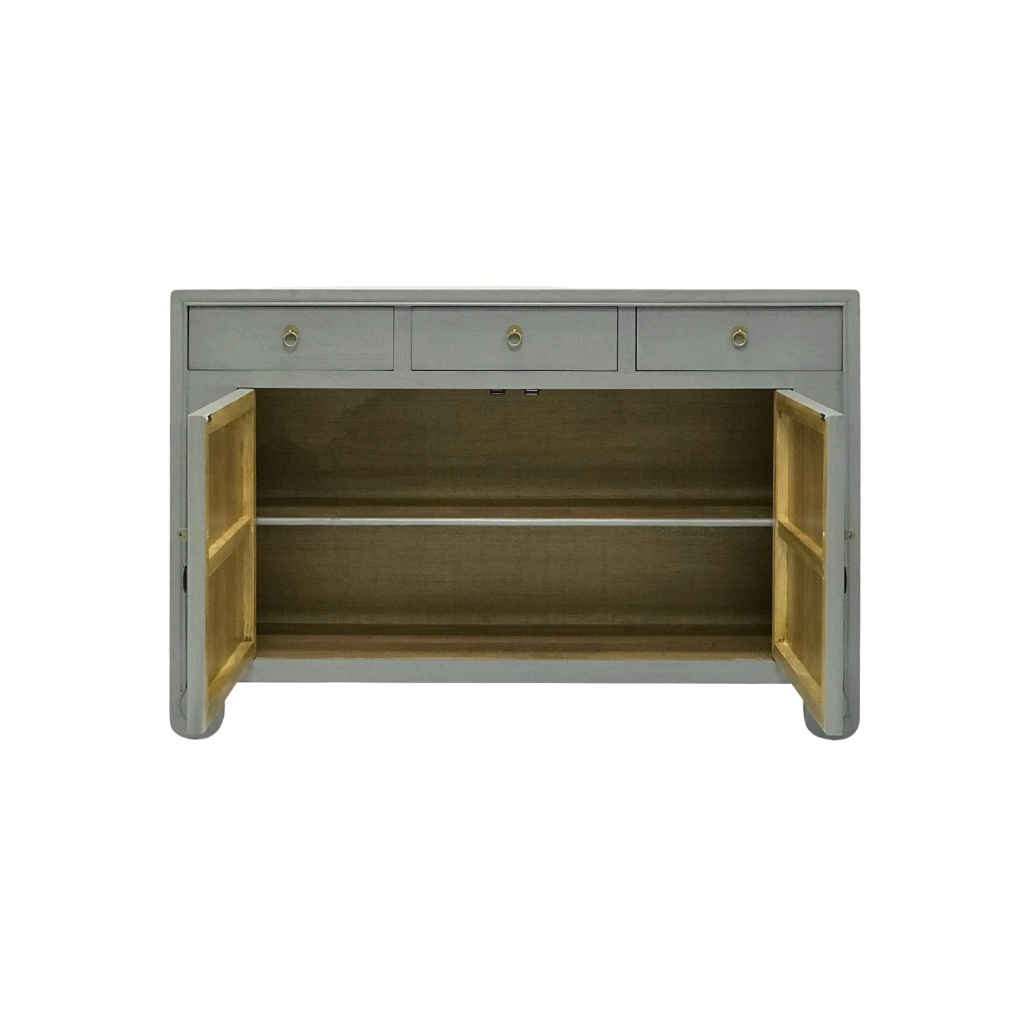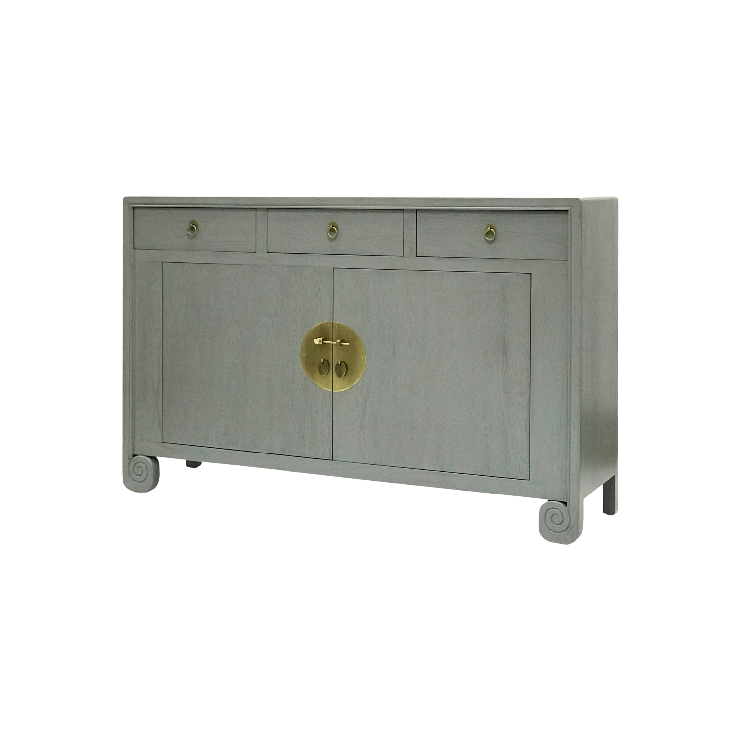 With three drawers and one large middle compartment and painted a stunning grey, this sideboard has a unique feature – legs in the shape of scrolls to take a cue from ancient Chinese carpentry. Paired with brass faceplates and magnetic closures, it is the perfect fusion of the past and present.
