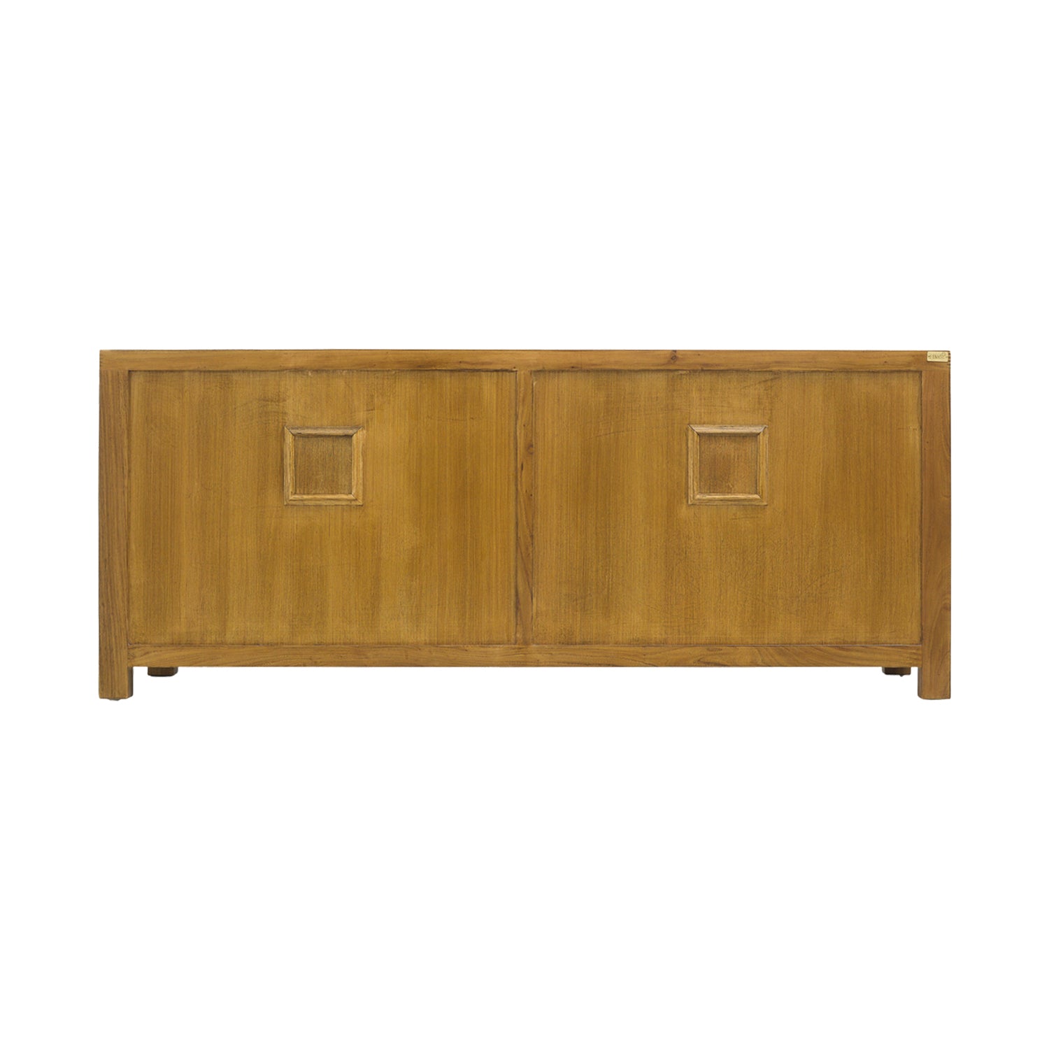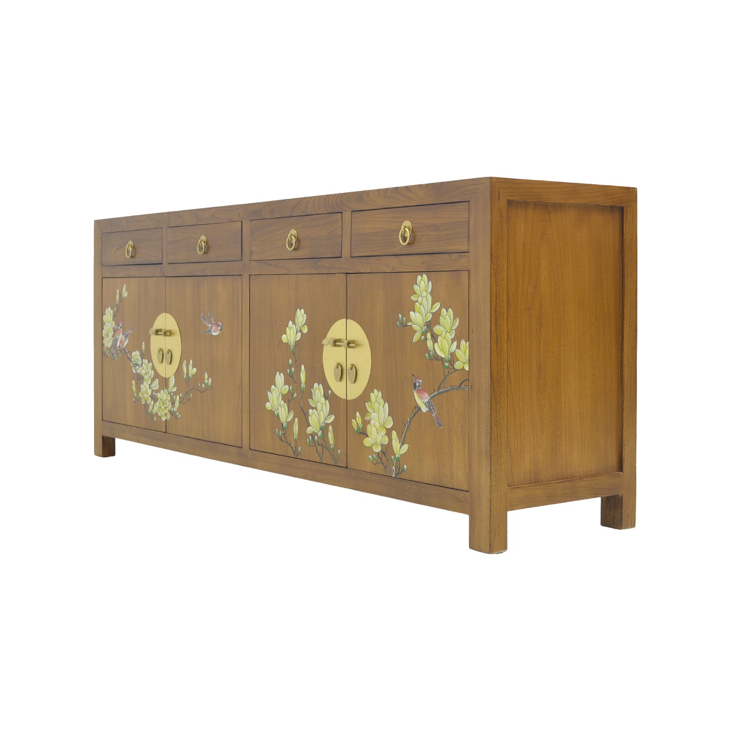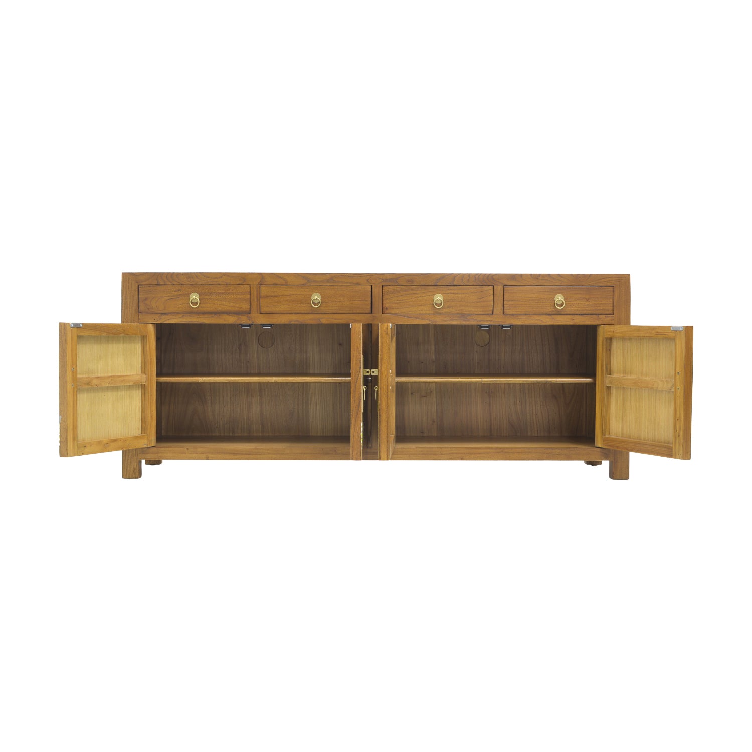 This TV console is essential for any modern household that wants a touch of chinoiserie. Structured with a solid form and round brass faceplates and sliding lock pins, this console fuses old and new styles, creating a unique piece with a bold statement. With two in-built cable hole to hide your wires, this console also has two cabinets on each side to store your remotes and DVDs.