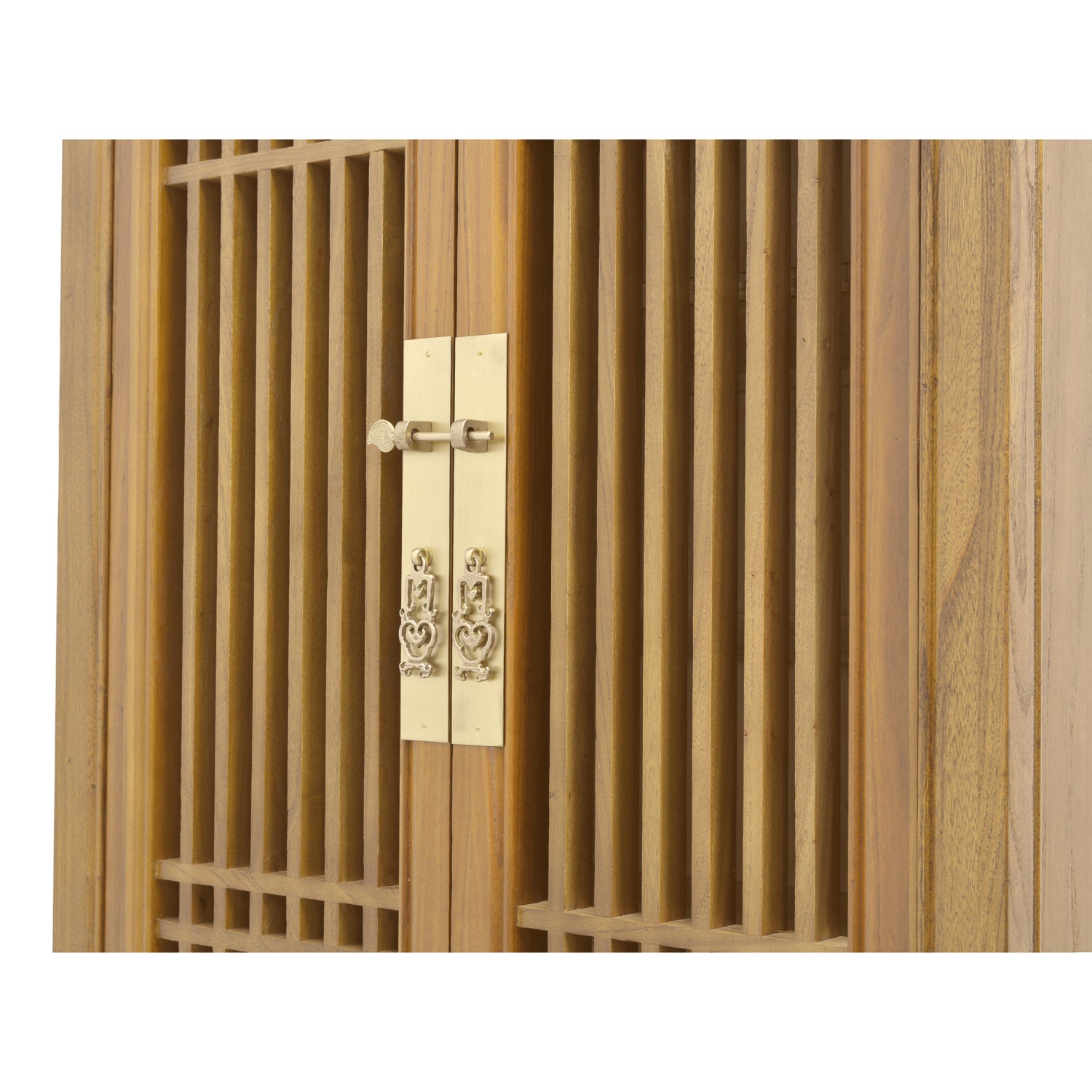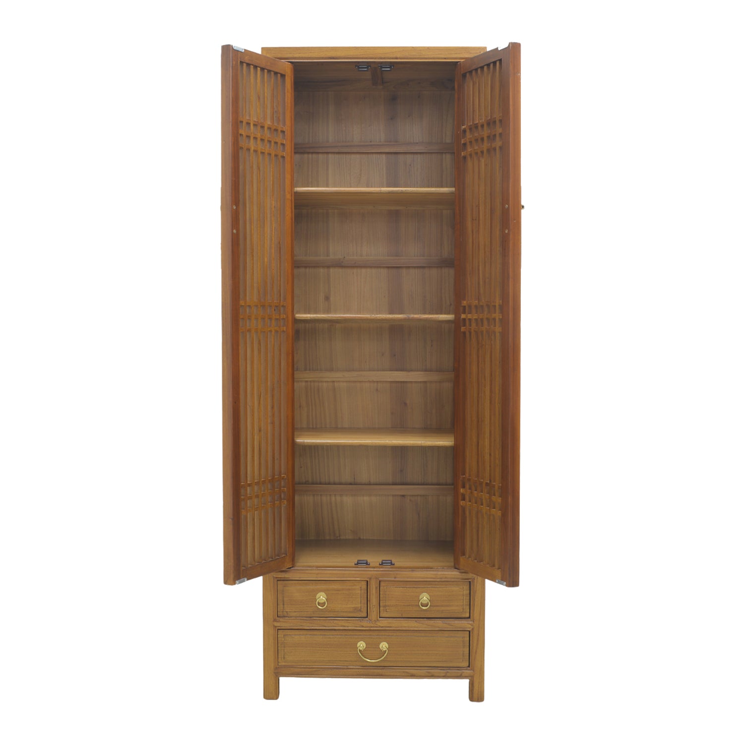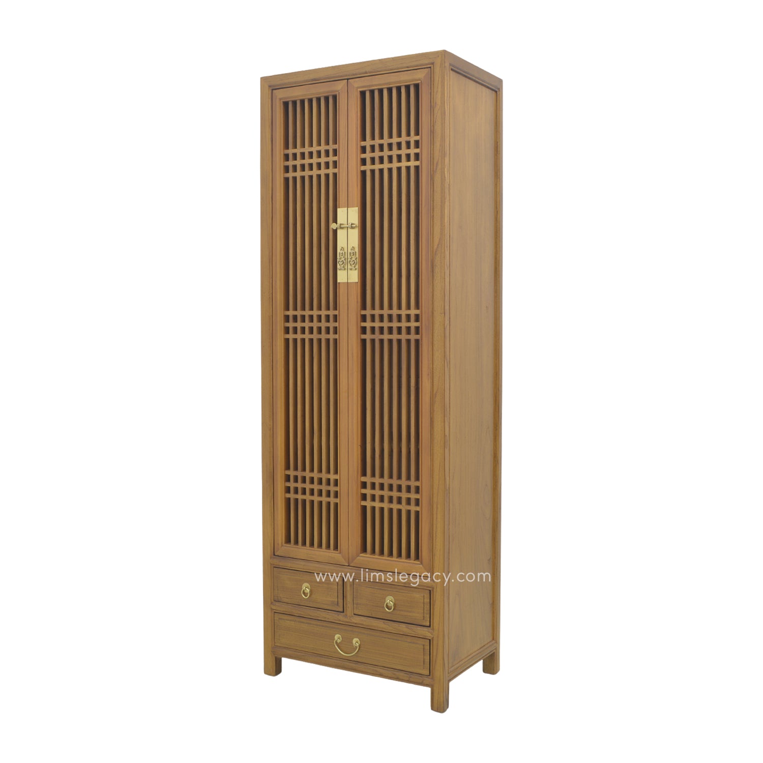 Standing at almost two meters, this tall structure is both a statement as well as an expansive storage space. This design borrows from the Chinese lattice, where it was popular to keep things ventilated, yet hidden from view. The end effect lends any living space with a quiet, minimalistic finish, accented by its light wood colour, which showcases the natural grain of the elm wood.