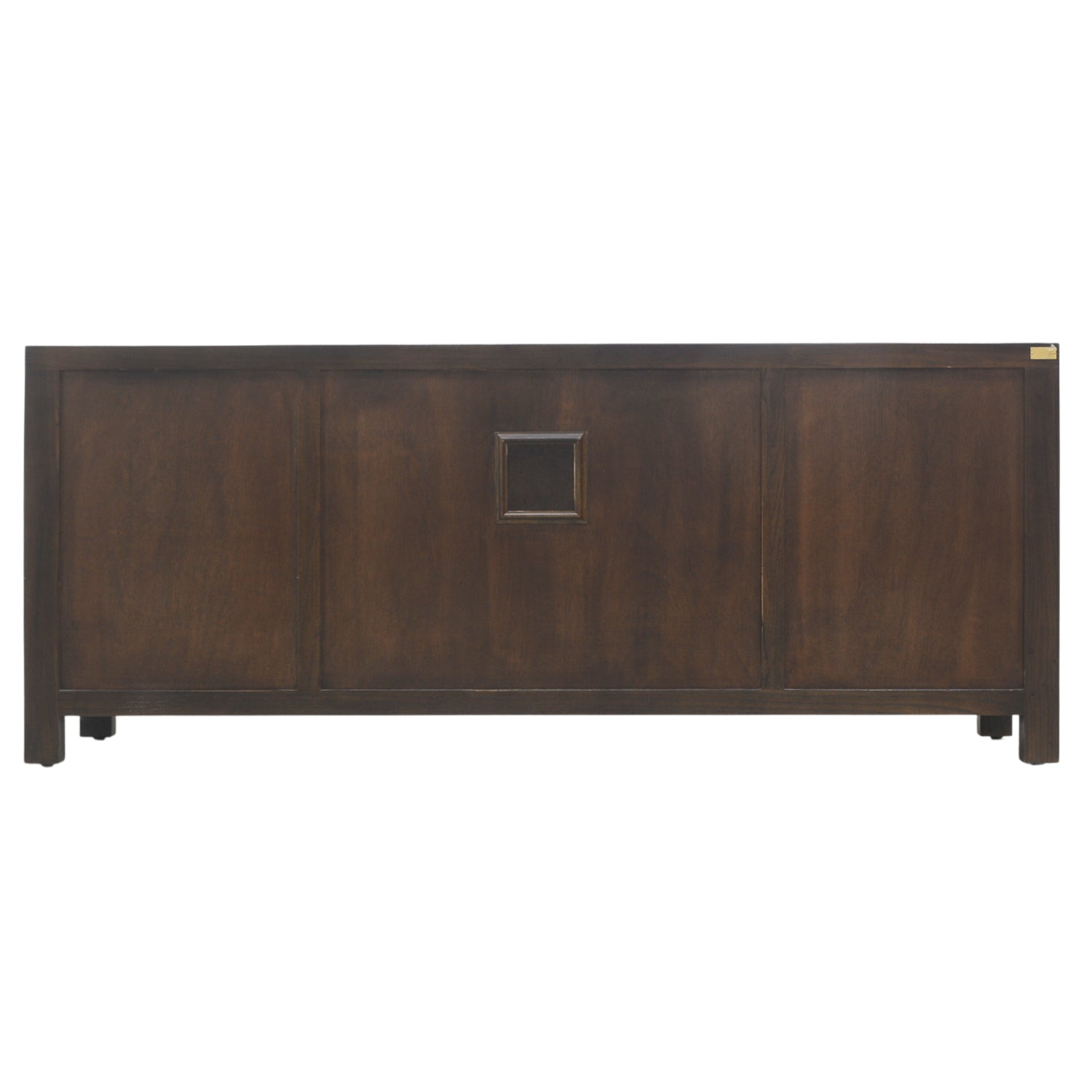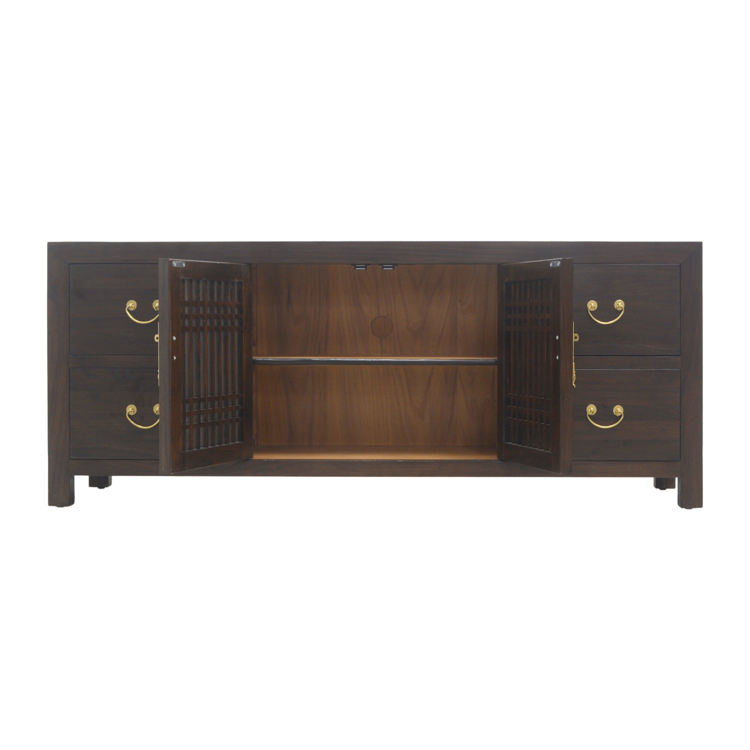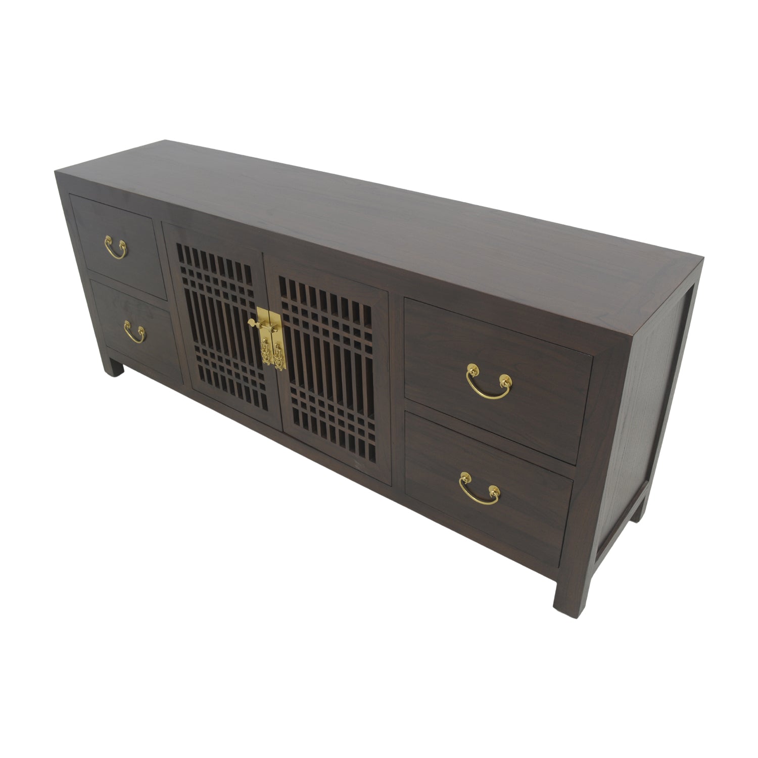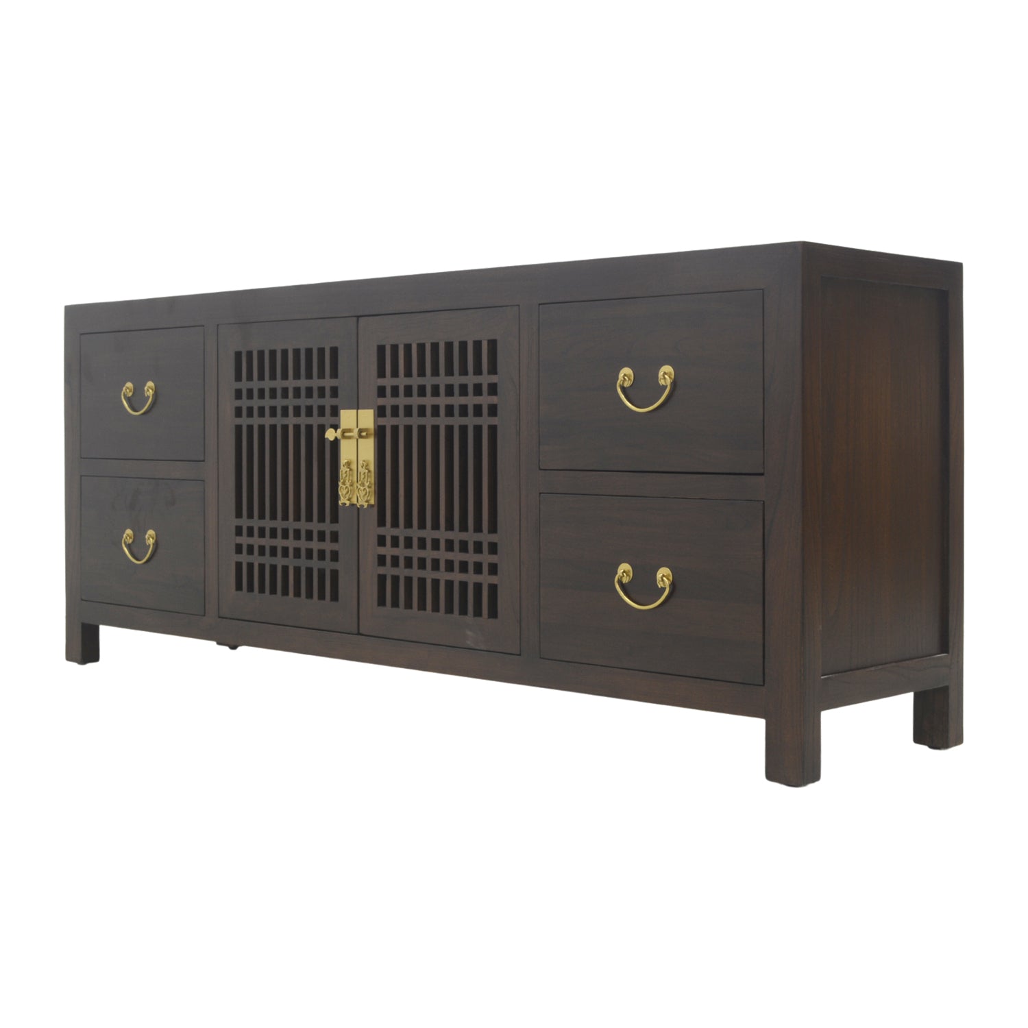 Clean and fluidly minimalistic, this tv console is a low cabinet with a simple, classic lattice design. With a middle compartment to store any game consoles or DVD players and four accompanying drawers to house remotes and electronic paraphernalia, this little lattice cabinet will serve all your entertainment needs. Made from sturdy elm wood and fitted with brass handles, this rich chocolate cabinet will blend into any interior design with ease.