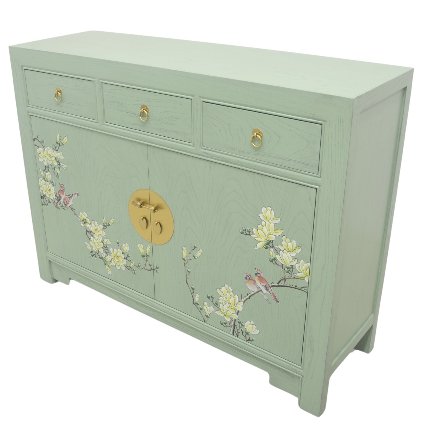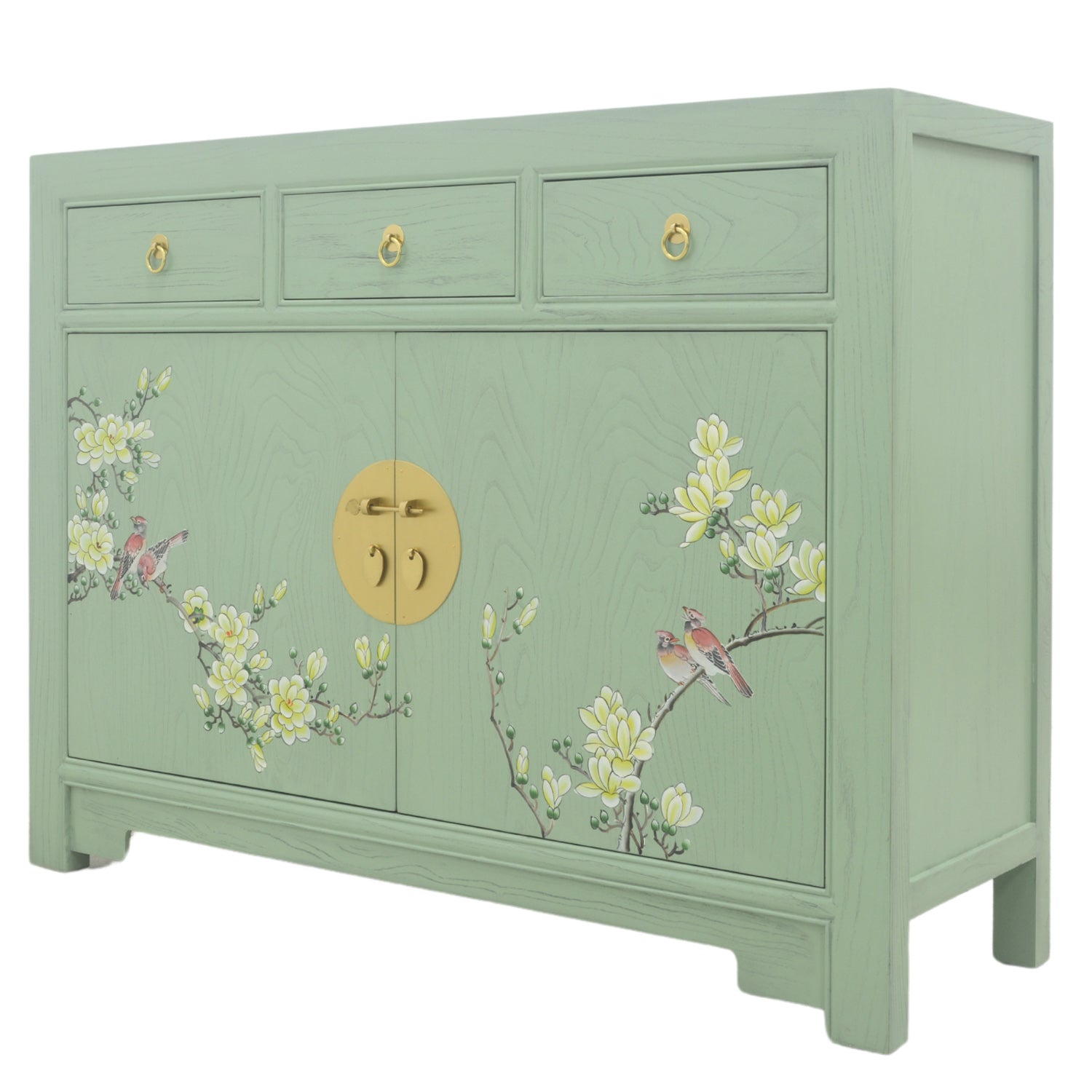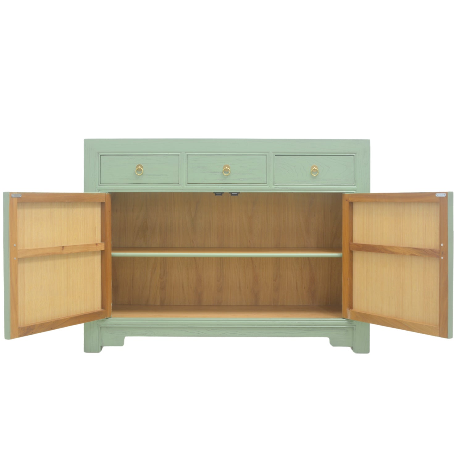 This generously sized sideboard features a mint-washed canvas with burnished gold coloured brass handles. Organic natural lines feature heavily in this piece, while the form meets function with the available storage space. With two outward swinging doors and three drawers, this piece is suitable for any type of interior décor, lending the room a subtle hint of the orient.