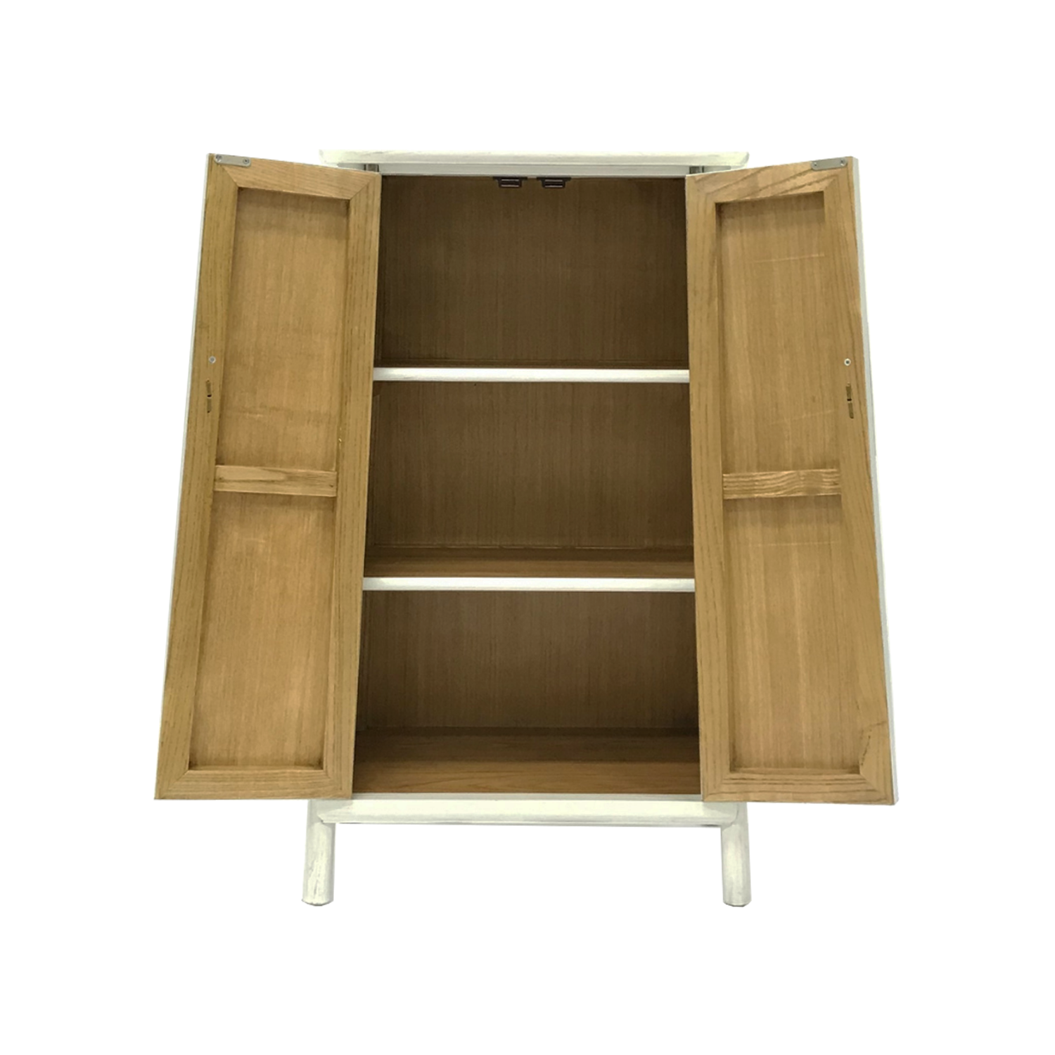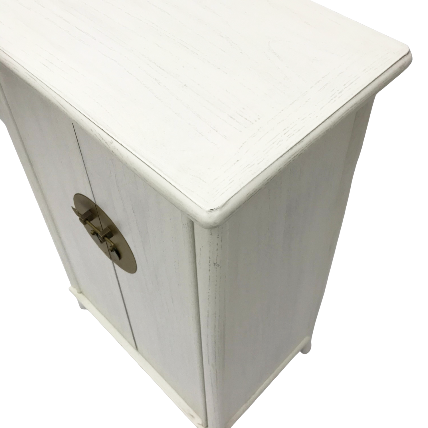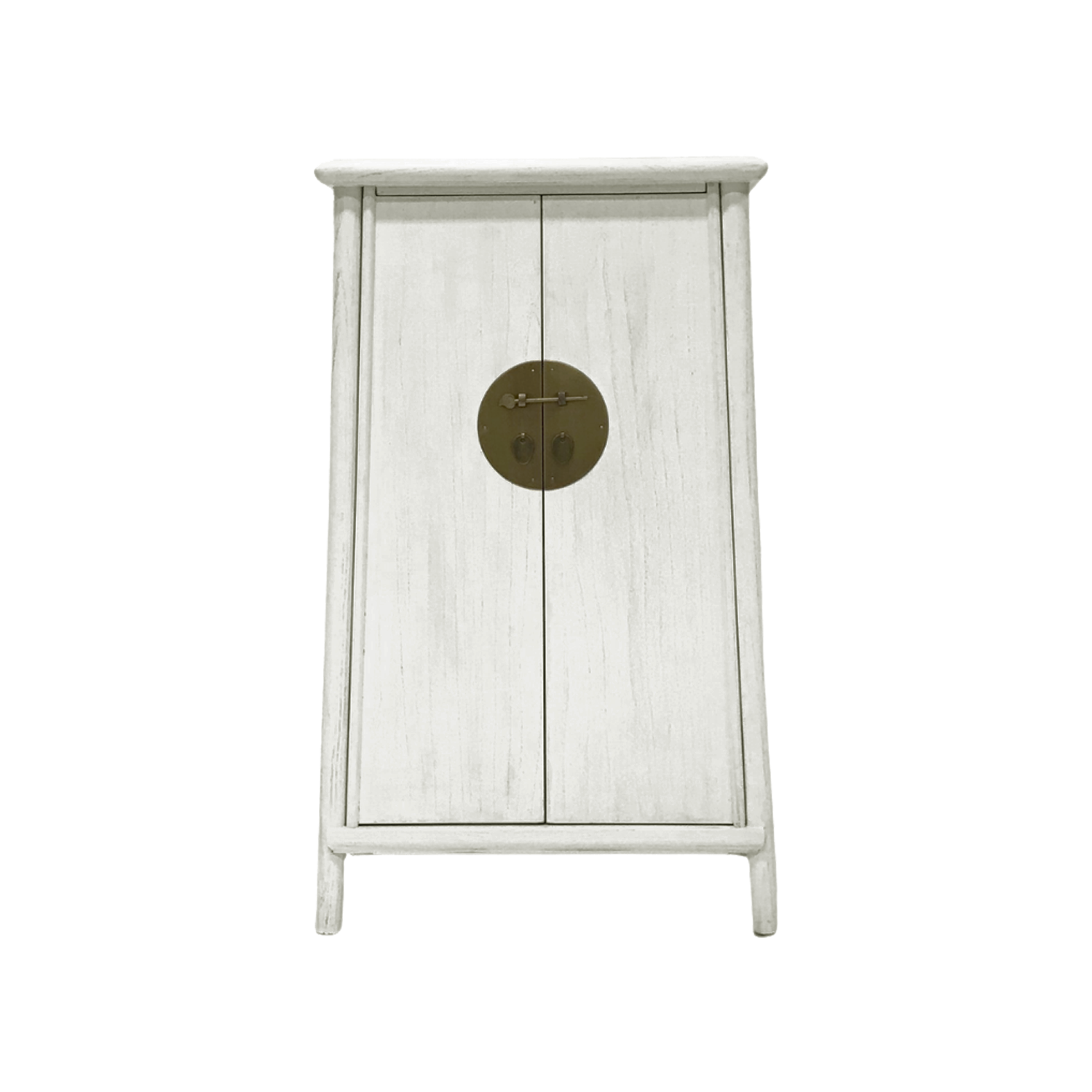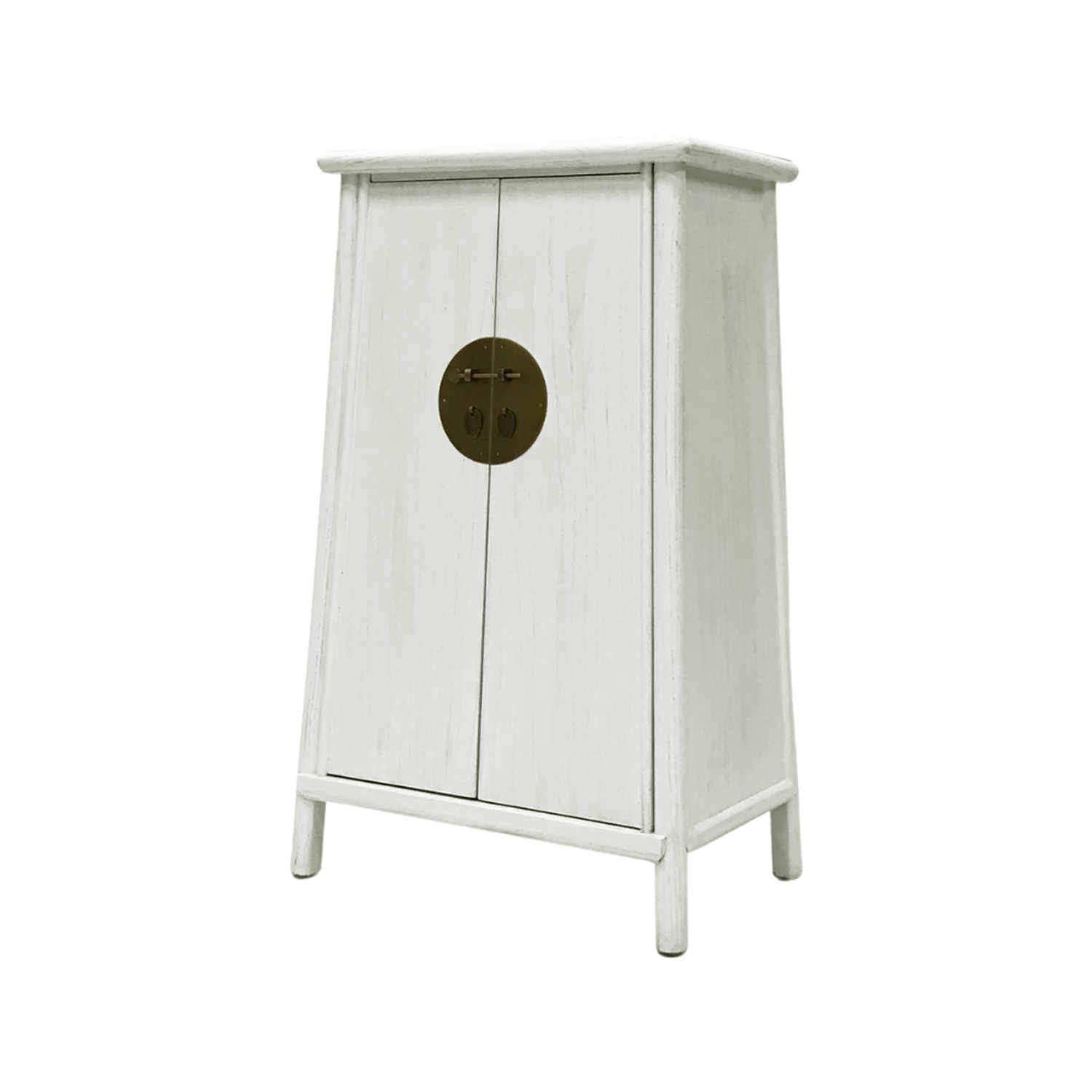 In a burst of contemporary new country style, this white modern two door cabinet features a highly complex yet natural elm wood grain in a classic chinoiserie style. With brass plating to complement the overall feel, this piece is designed to blend seamlessly into any living area. Use it as a hallway storage or simply as additional storage in the bedroom, this cabinet will give the space an earthy, oriental feel.