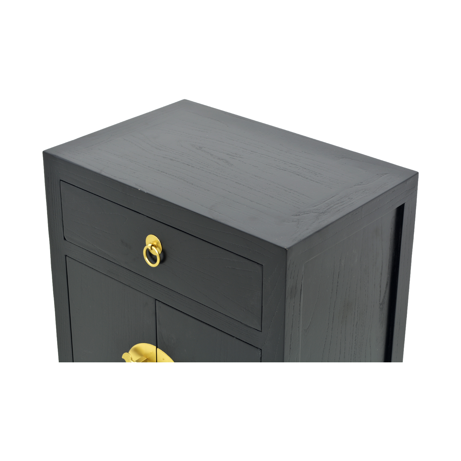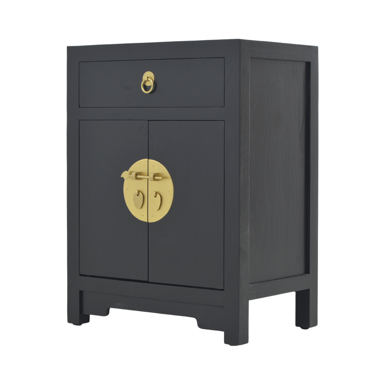 A quaint little offering that doubles as a bedside table, this black cabinet just bears the hints of chinoiserie, with round brass fittings and handle. Made such that the eye immediately draws to the round brass plate with a sliding pin to lock, this design is favoured by minimalist designers with a flair for the orient. Ideal for standing a lamp on, this is great for couch accompaniment, or as a hallway sidepiece.