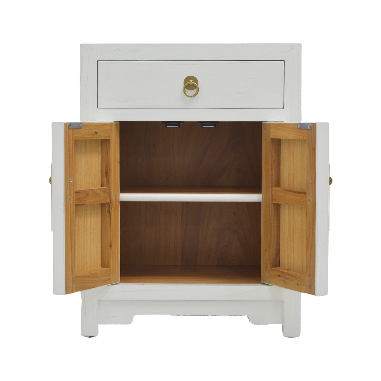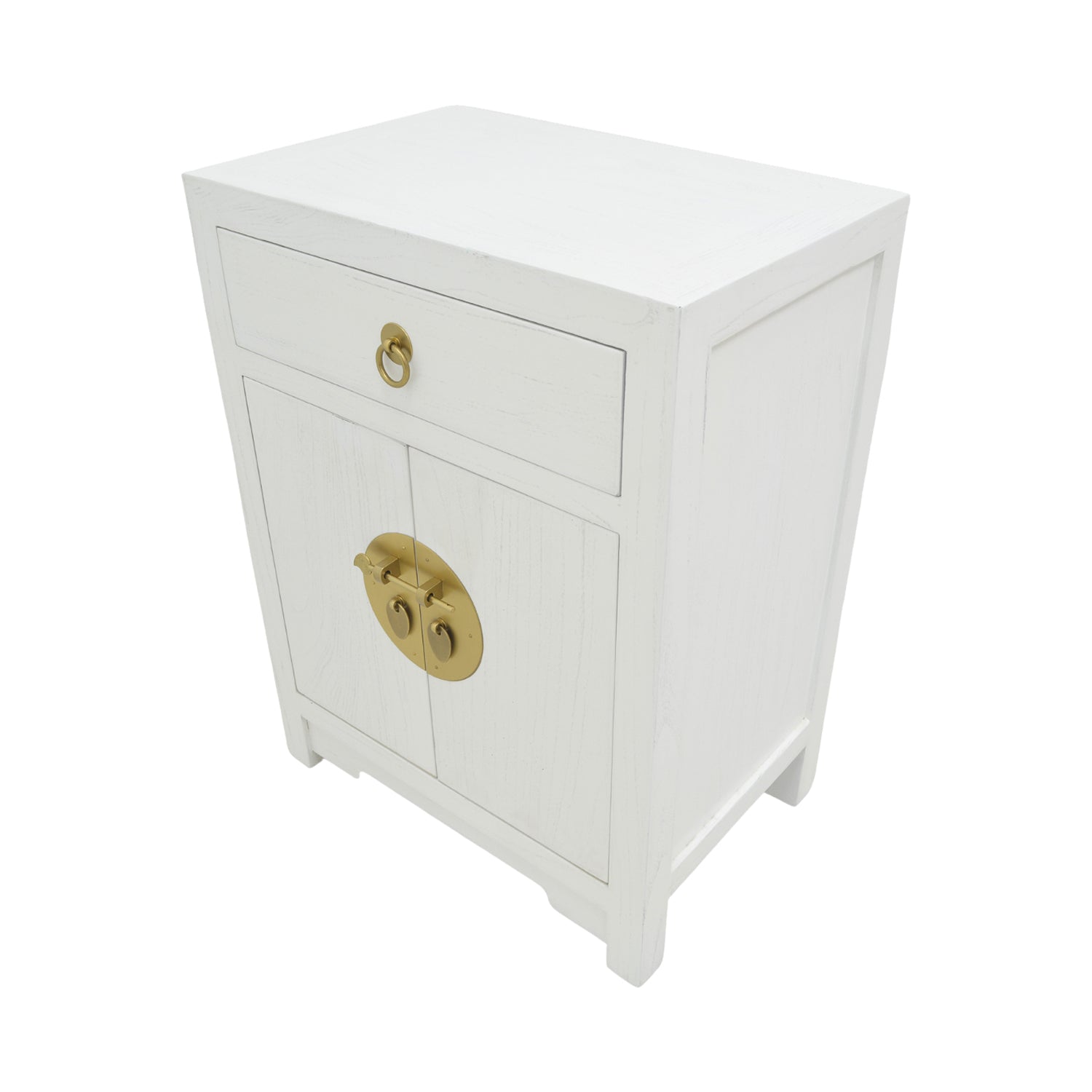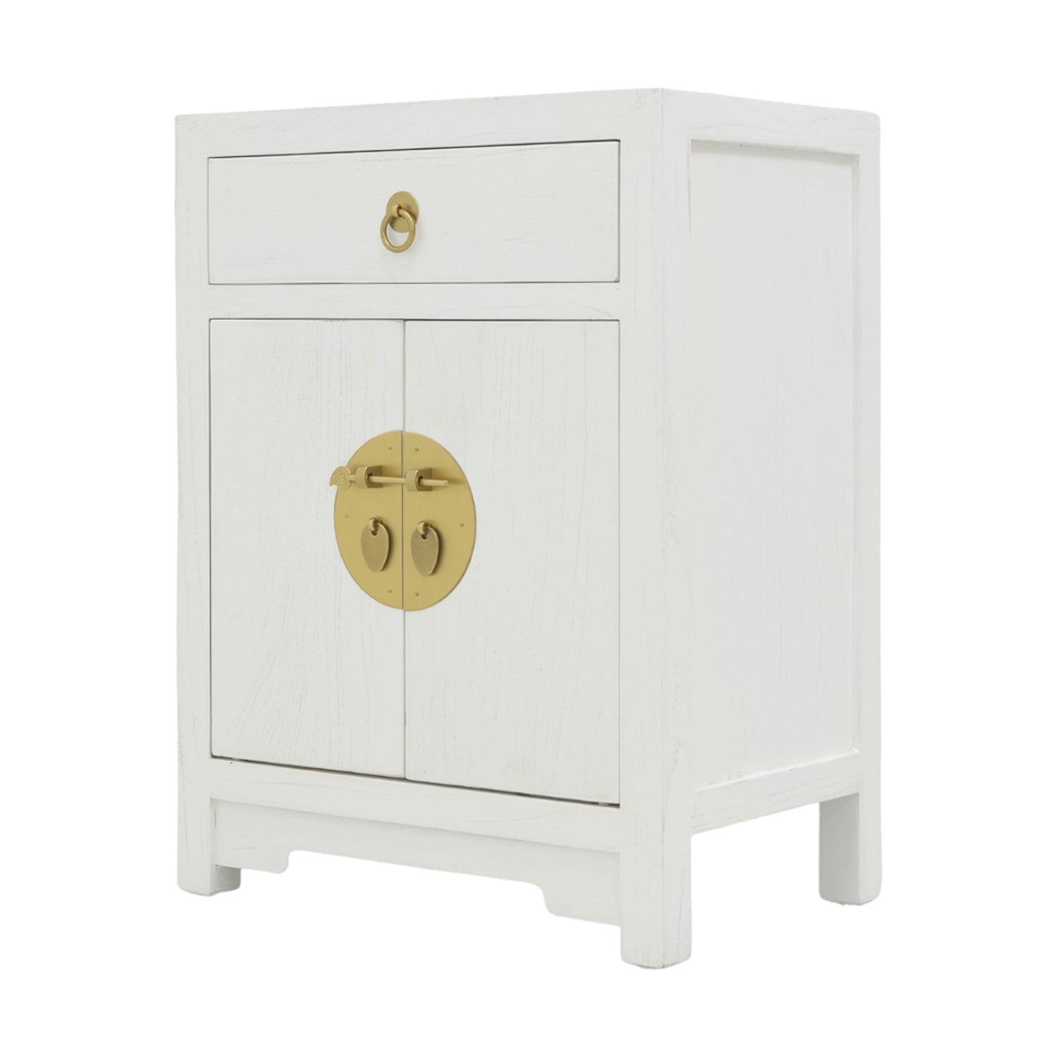 A quaint little offering that doubles as a bedside table, this milky white cabinet just bears the hints of chinoiserie, with round brass fittings and handle. Made such that the eye immediately draws to the round brass plate with a sliding pin to lock, this design is favoured by minimalist designers with a flair for the orient. Ideal for standing a lamp on, this is great for couch accompaniment, or as a hallway sidepiece.