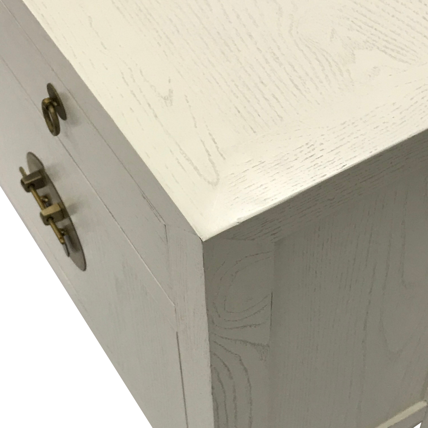 Conveniently built at waist height, this modern console brings with it a touch of the orient with brass faceplates on its swinging doors and ring pulls on all of the drawers. An ideal height for a television console or a hallway statement piece, this cabinet features curved-in table legs, reminiscent of the time it was inspired from. Made from sturdy elm wood, this particular cabinet is painted a glossy white, featuring natural wood grain.