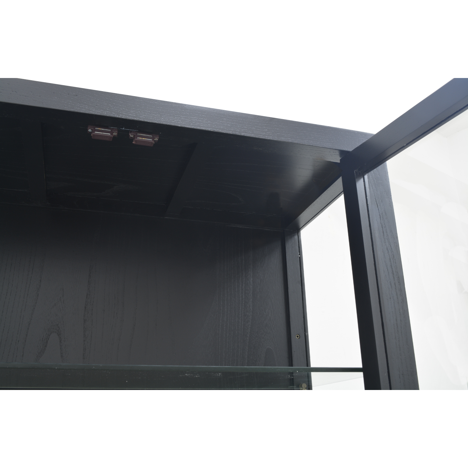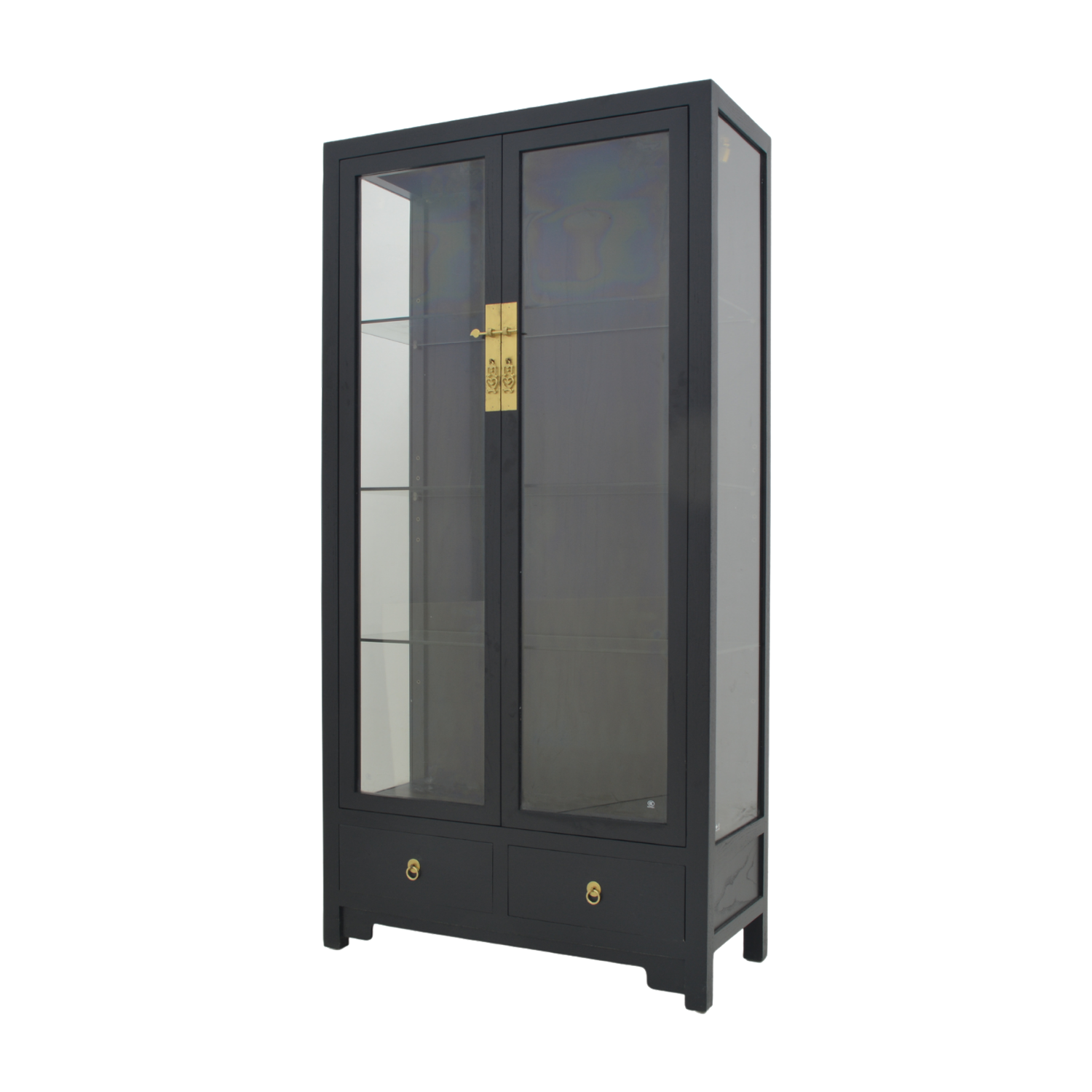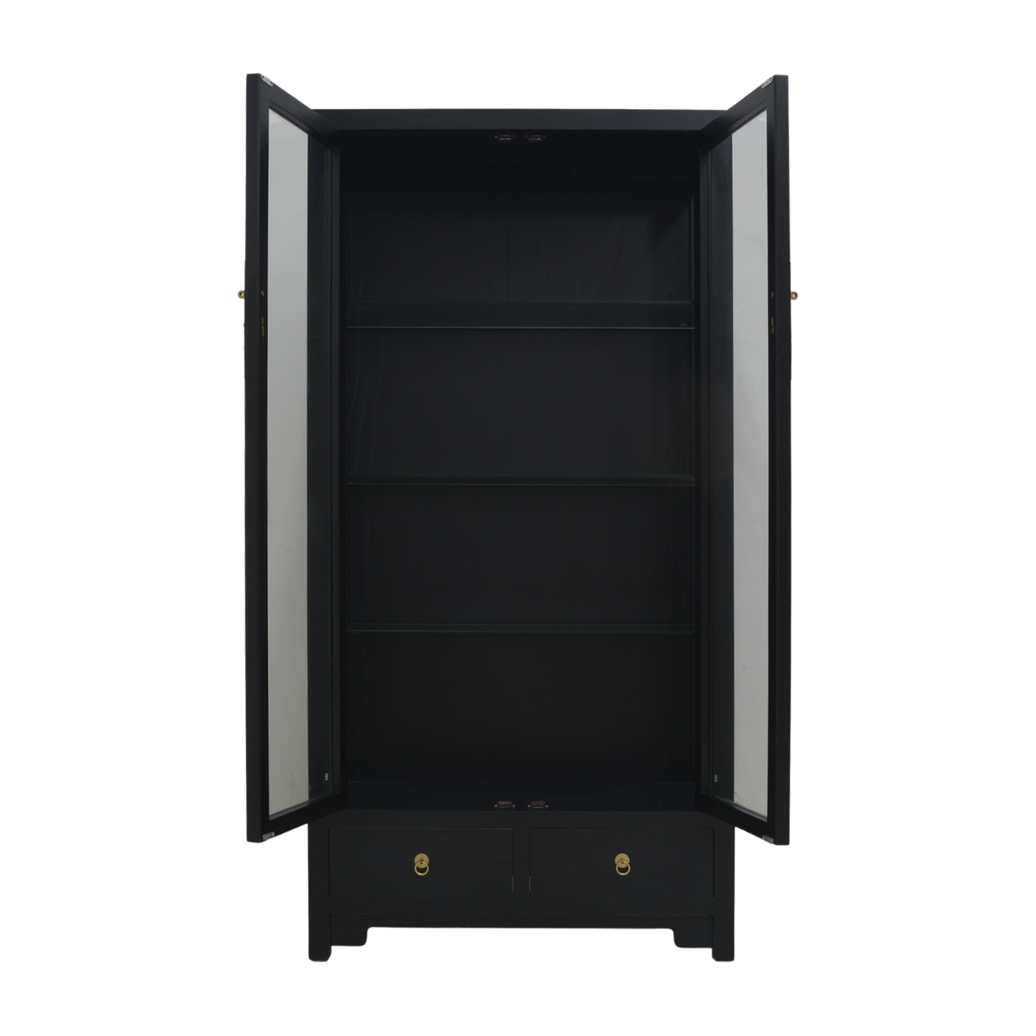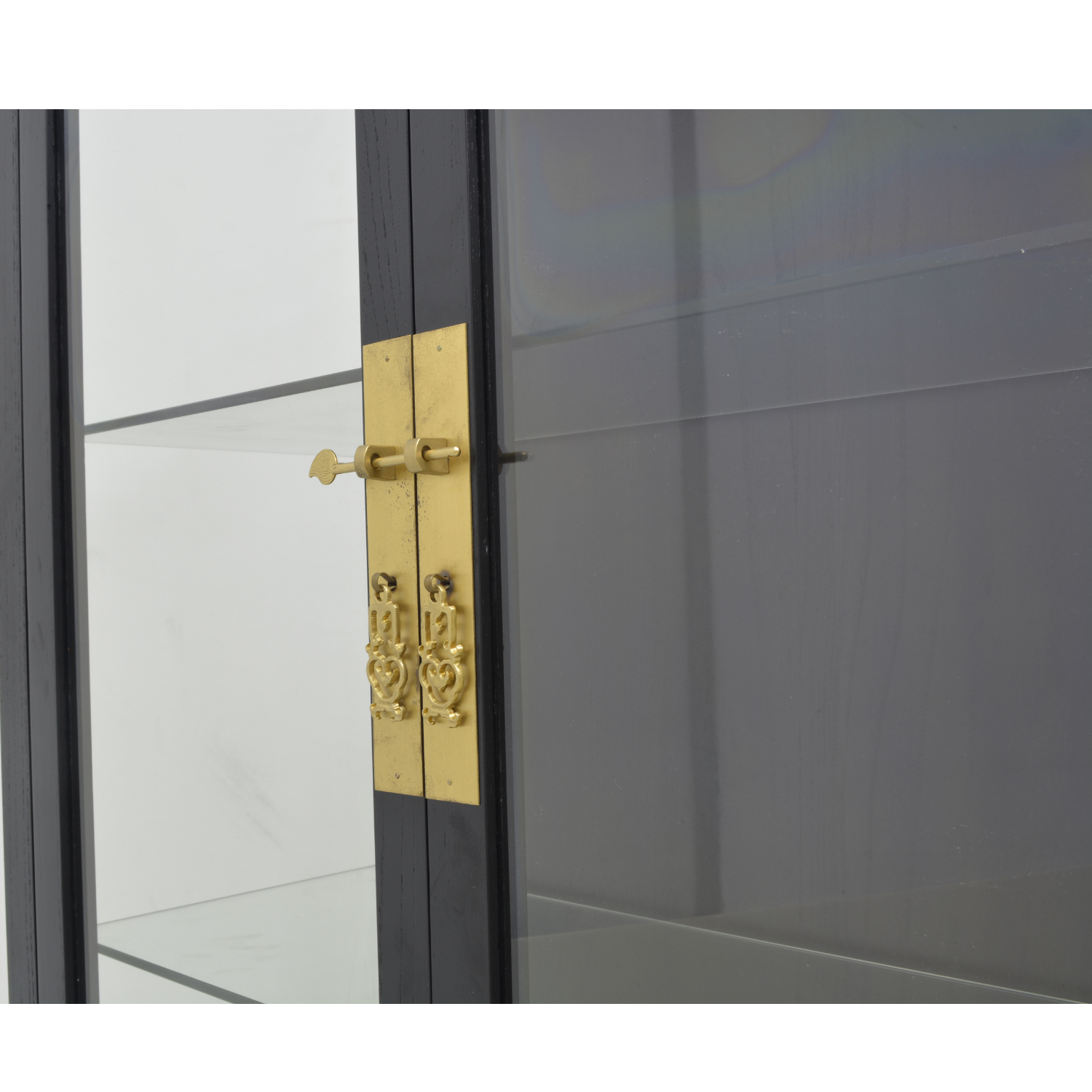 Made specifically to show off, this opulent glass cabinet mixes the oriental with the classic with black-painted elm wood, wide glass doors and two drawers below. Decorate its interiors with classic china or simply use it to showcase your passions, keepsakes or valuables, this multi-use cabinet is the book for your story. With intricate brass fittings and a classic teardrop sliding pin lock, this display cabinet brings just a hint of the chinoiserie without being overboard.