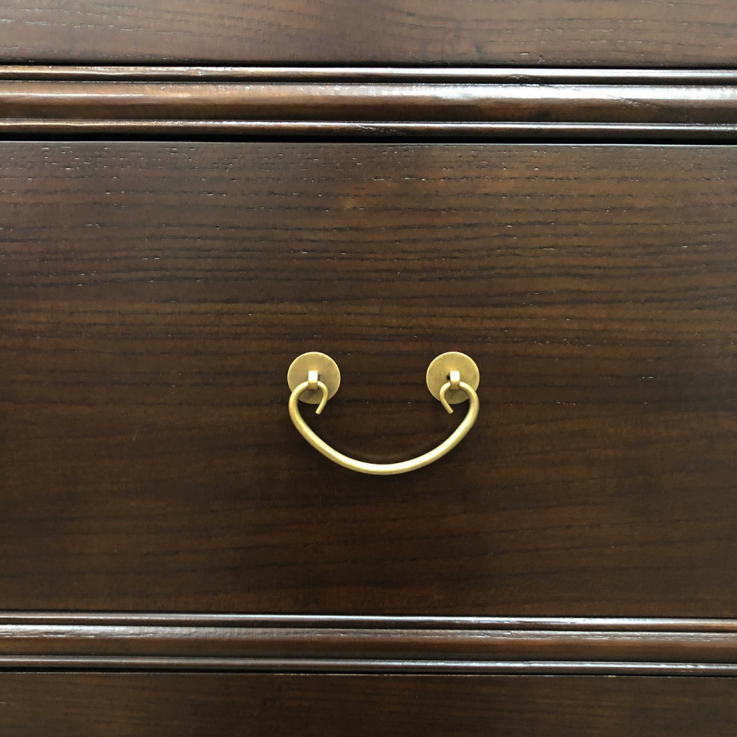 Clean and organically designed, this dark wood cabinet stands tall at 120cm and would complement a long hallway or any interior with jeweled tones. Polished, swinging brass handles are juxtaposed against the dark wood to create a sensual, opulent feel, while the natural exterior of the cabinet gives off a casual elegance that is both contemporary and minimalist.