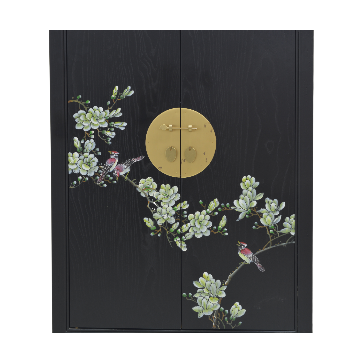 Understated and fluidly elegant, this two-door shoe cabinet is the perfect meeting of the modern and past sensibilities in design, with colourful natural motifs upon a bed of dark chocolate. Featuring a brass face plate with a sliding pin lock to further accentuate its chinoiserie origin, this shoe cabinet can double as a regular cabinet to store just about anything.