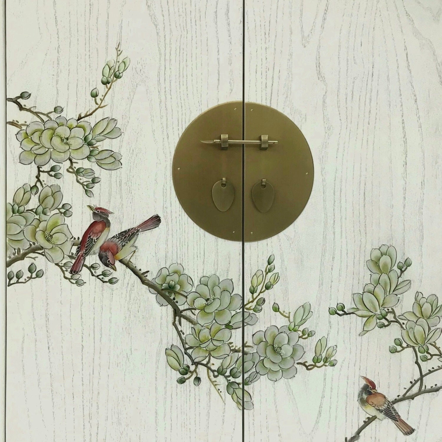Understated and fluidly elegant, this two-door shoe cabinet is the perfect meeting of the modern and past sensibilities in design, with colourful natural motifs upon a calm bed of plain white. Featuring a brass face plate with a sliding pin lock to further accentuate its chinoiserie origin, this shoe cabinet can double as a regular cabinet to store just about anything.