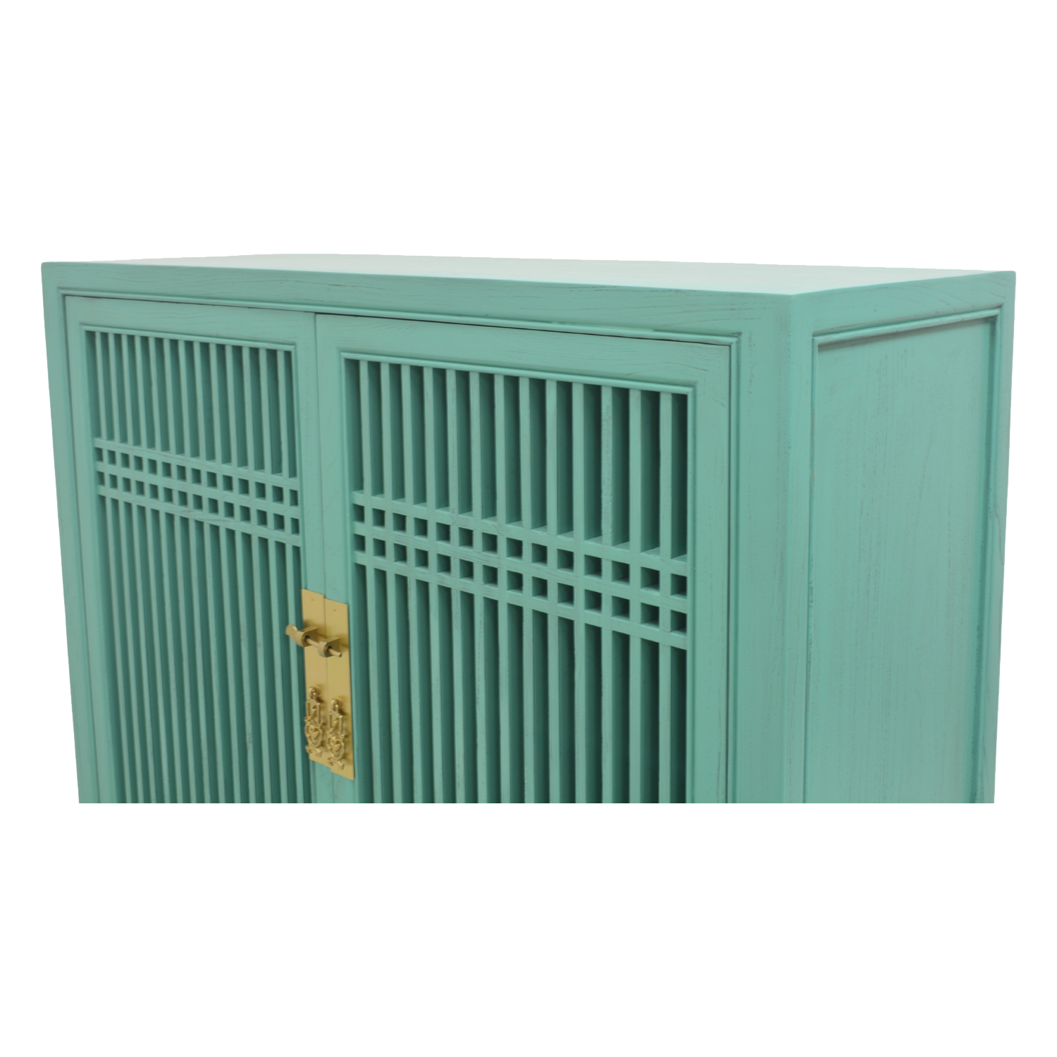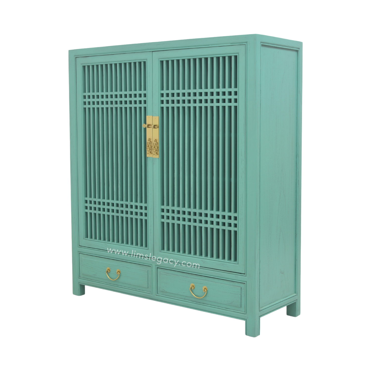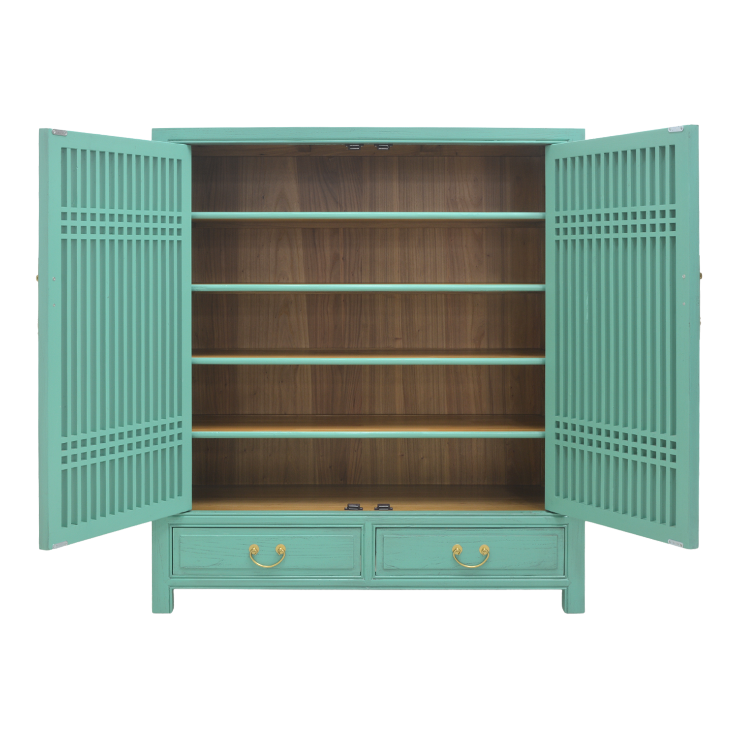 In ancient times of past, the Chinese used lattice cabinets as wedding gifts or as kitchen storage to ventilate the goods within. Now, however, this signature lattice design is beloved by any designer wanting an oriental, yet classy addition to the house. A turquoise wash colour with brass fixtures, this magnificent piece has four internal shelves and two drawers for all your storage needs.