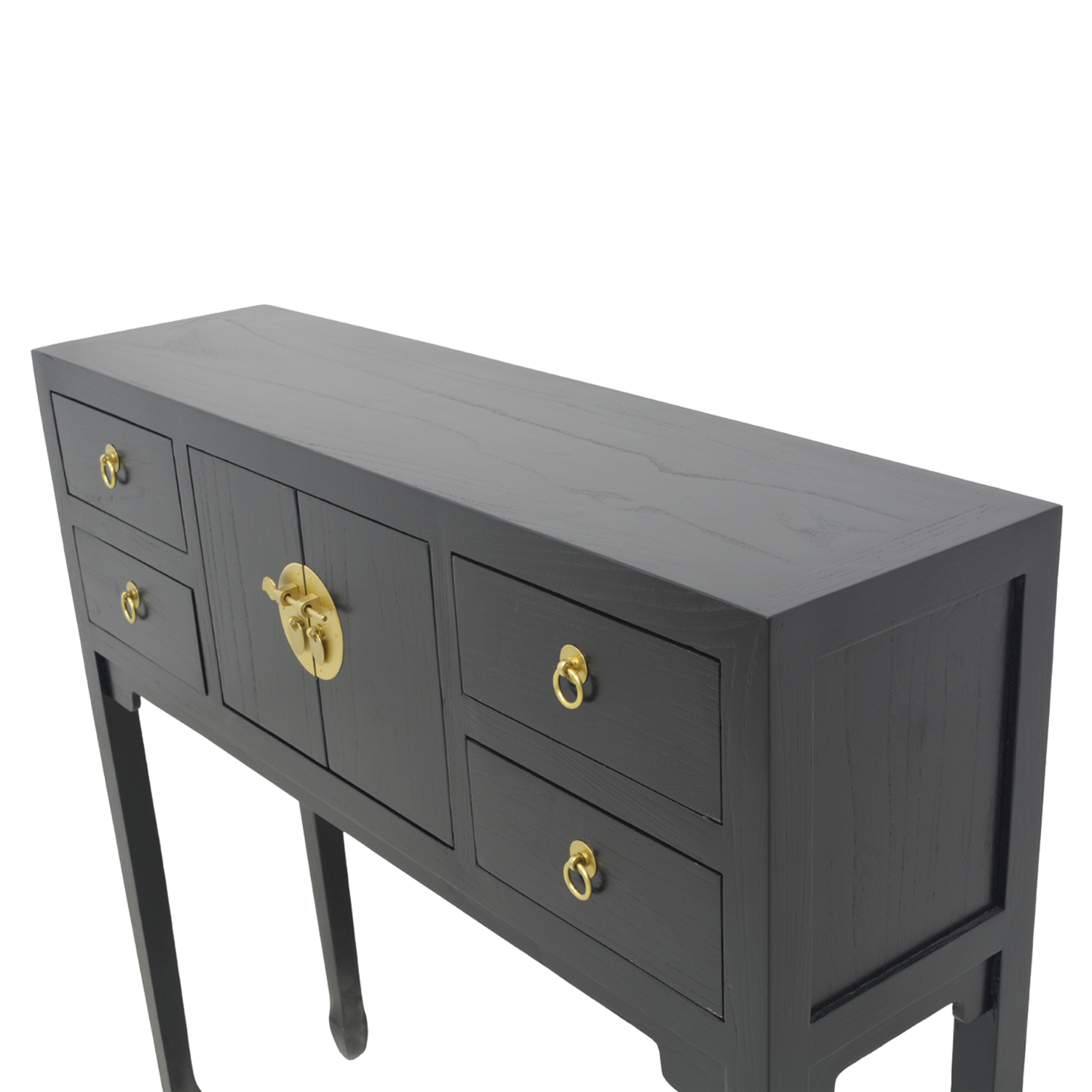 Classy with long, fluid lines, you can instantly picture this in a hallway with a mirror. Made such that the eye immediately draws to the round brass plates in the centre, this is reminiscent of Chinese interior design with brass fittings and handles to match. Top with a crystal vase of flowers or a hanging piece; this tall console is meant to decorate any space it's in.
