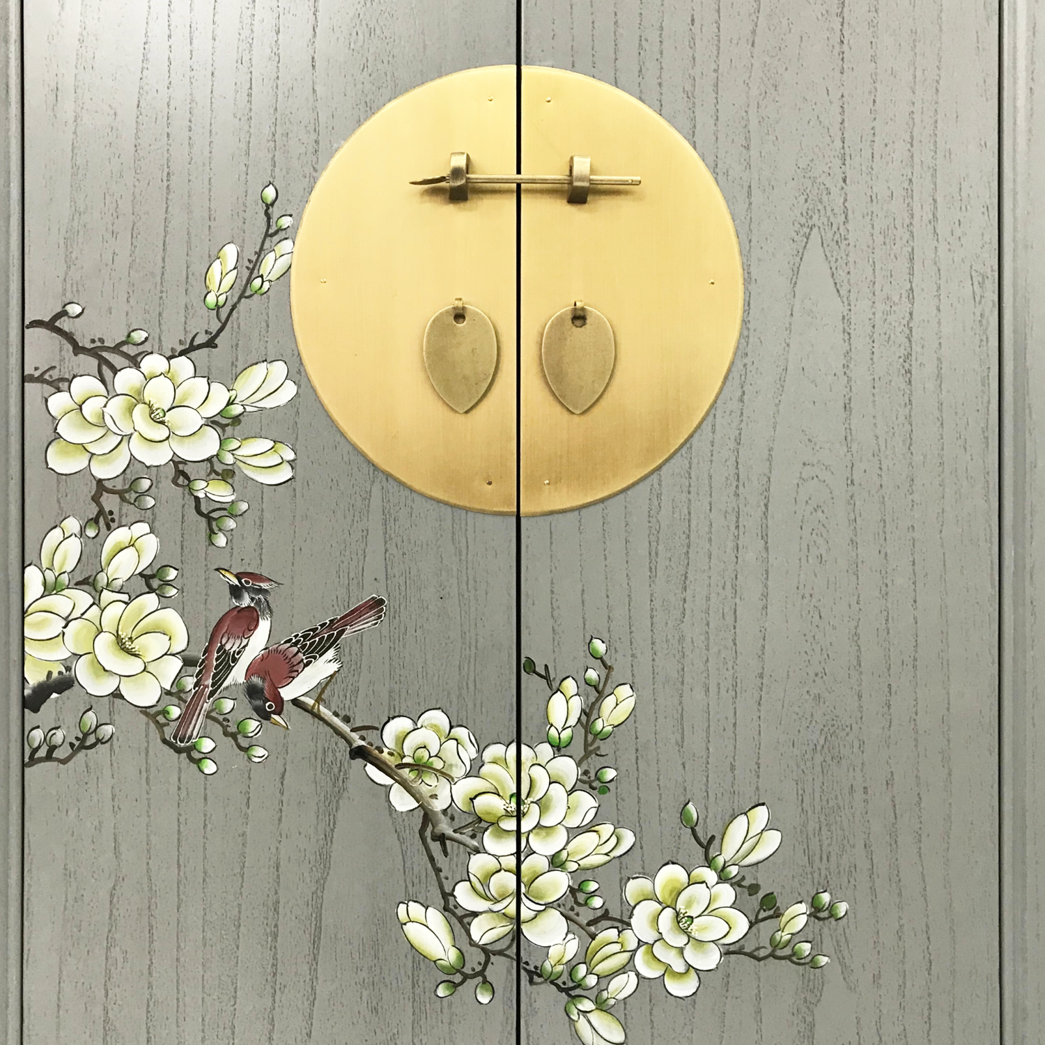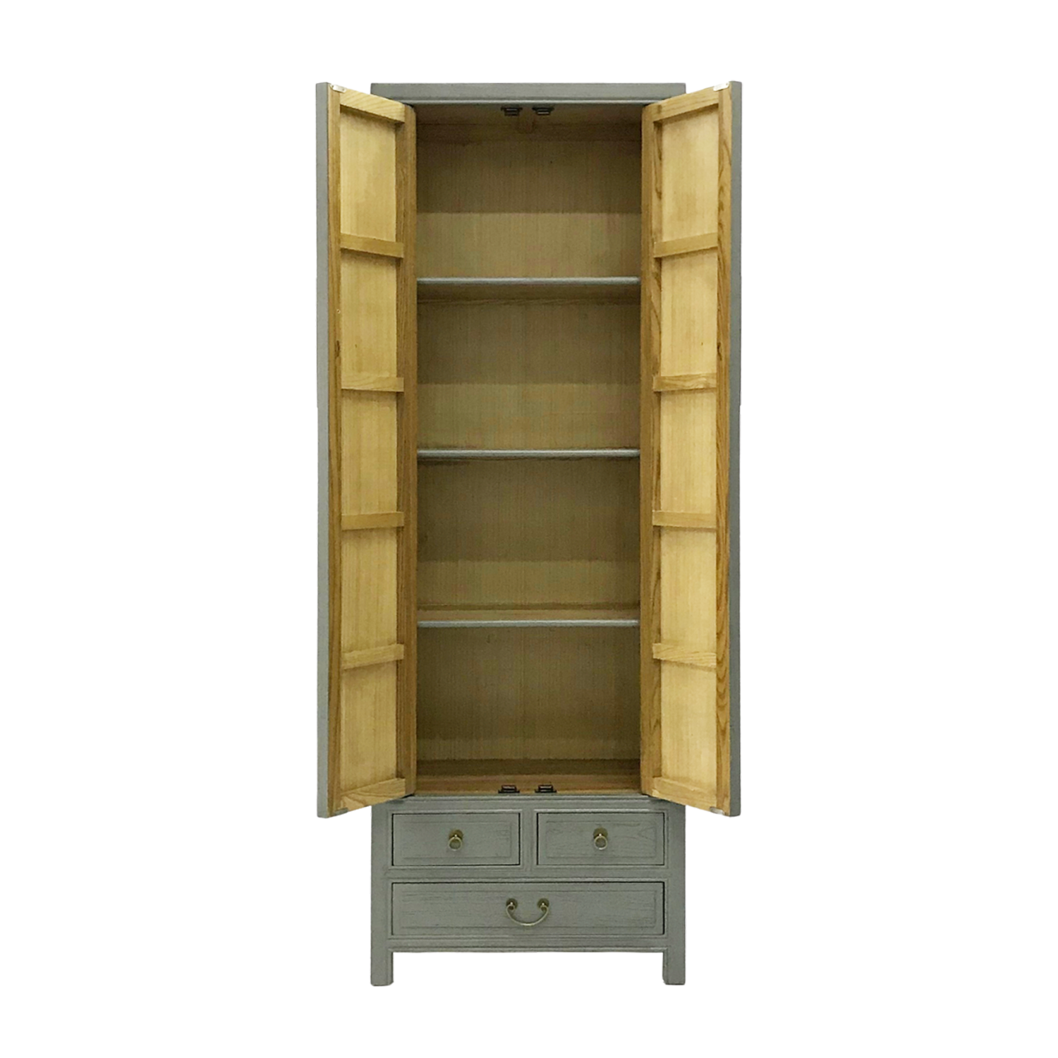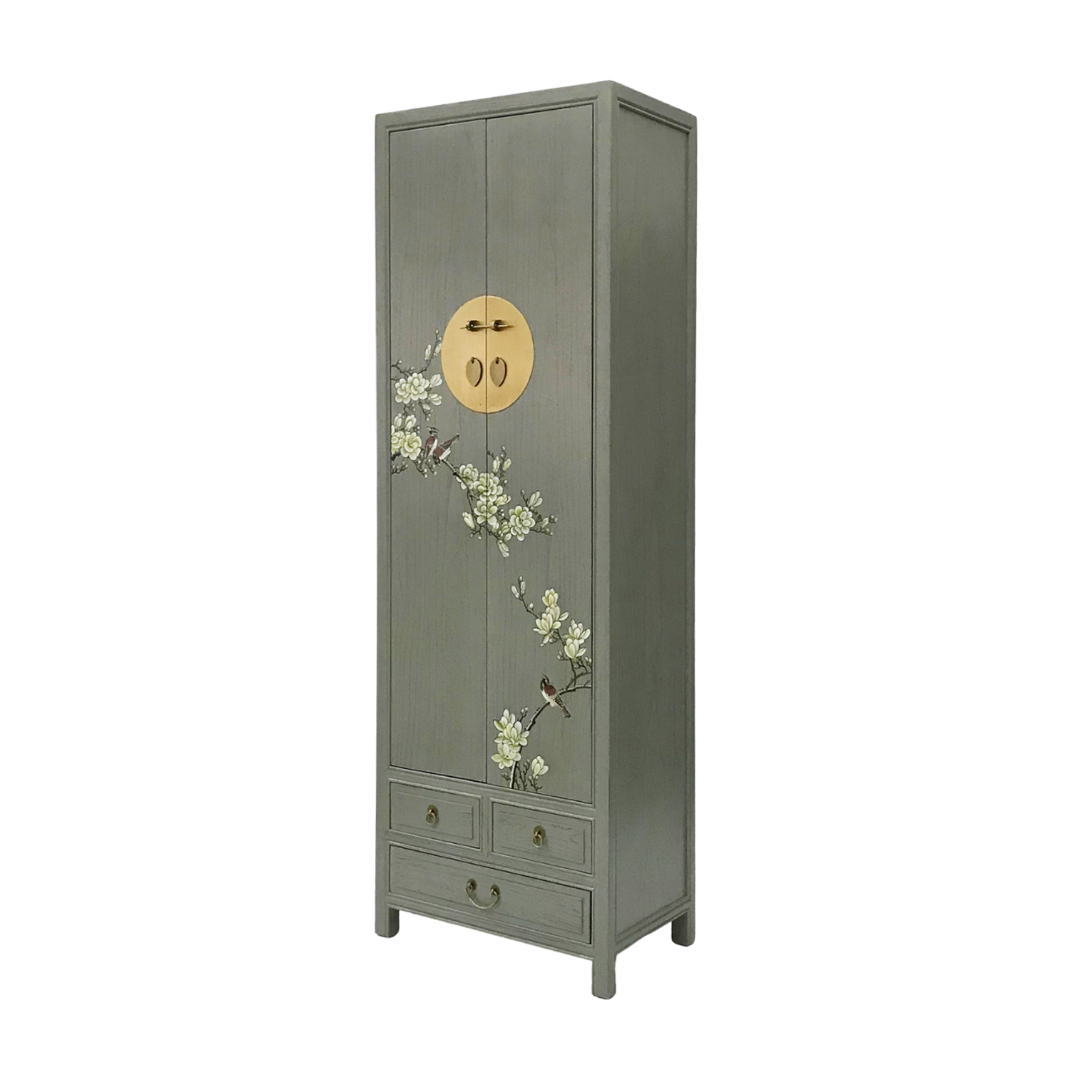 Inspired by the wedding cabinets from ancient China, this tall, narrow cabinet focuses on showcasing the natural wood grain of the elm, its elegant construction and the hand painted motifs that the era was famed for. Featuring four spacious shelves and three bottom drawers, this cabinet is ideal for storing medium height items such as vases and homeware items, or serving as additional closet space!