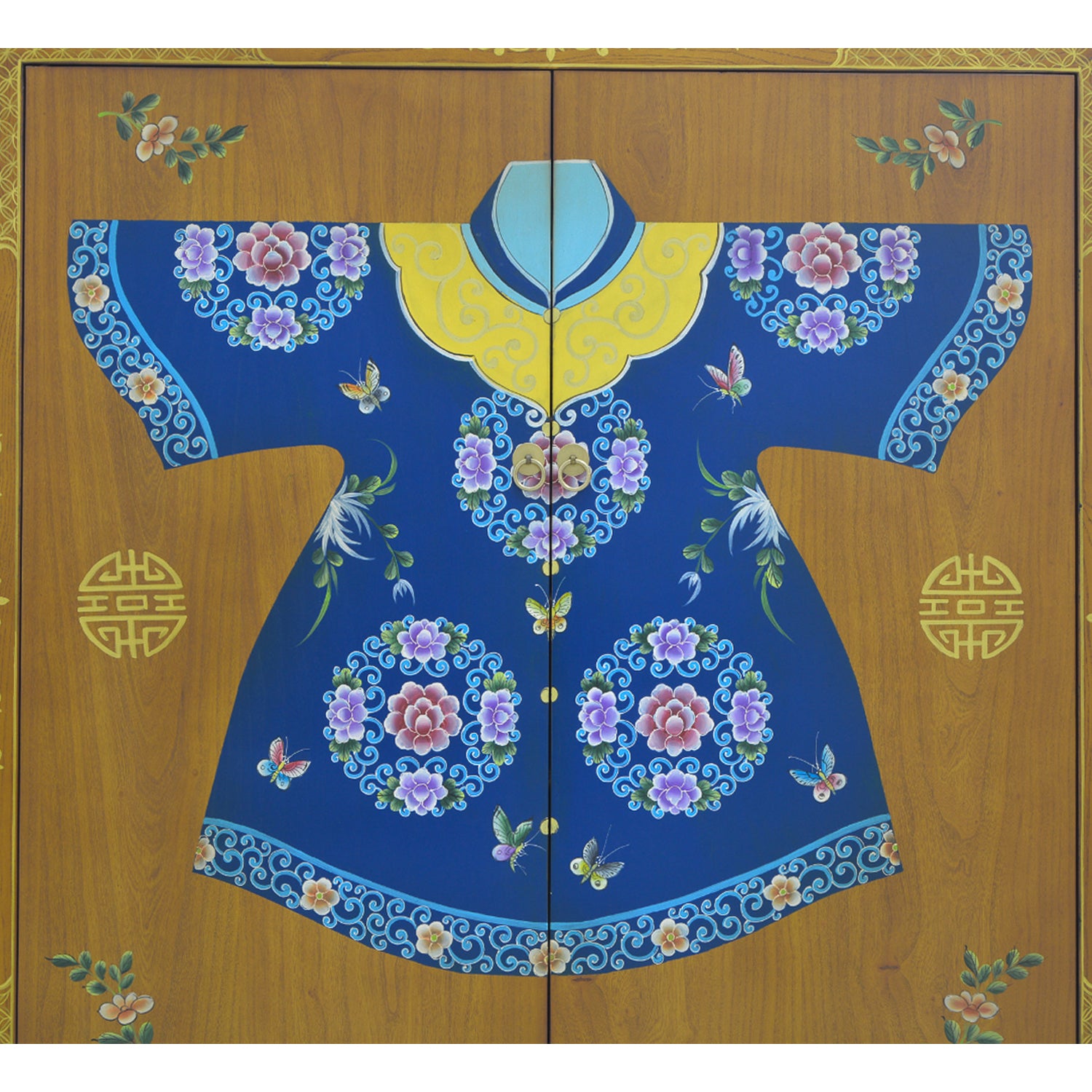 Unmistakably chinoiserie, this robe cabinet is a statement and a half - from its brightly coloured exterior to the intricate floral robe motif, this decadently painted cabinet is made to have a whole room decorated around it! Opulent in design yet practical in function, this follows the design of the Chinese wedding cabinets, where clothes were not yet vertically hung, but folded. Ideal for linen or small cloth items!