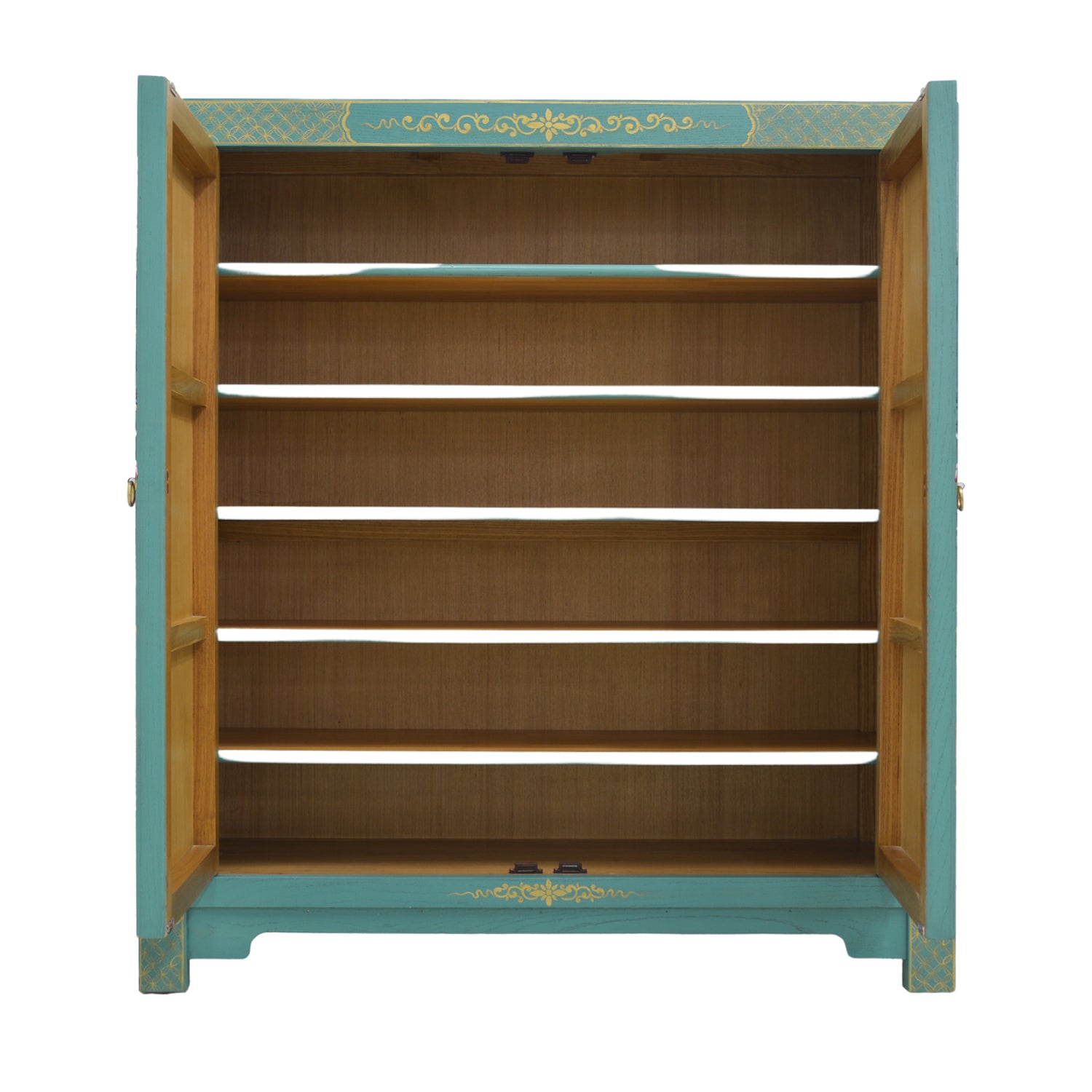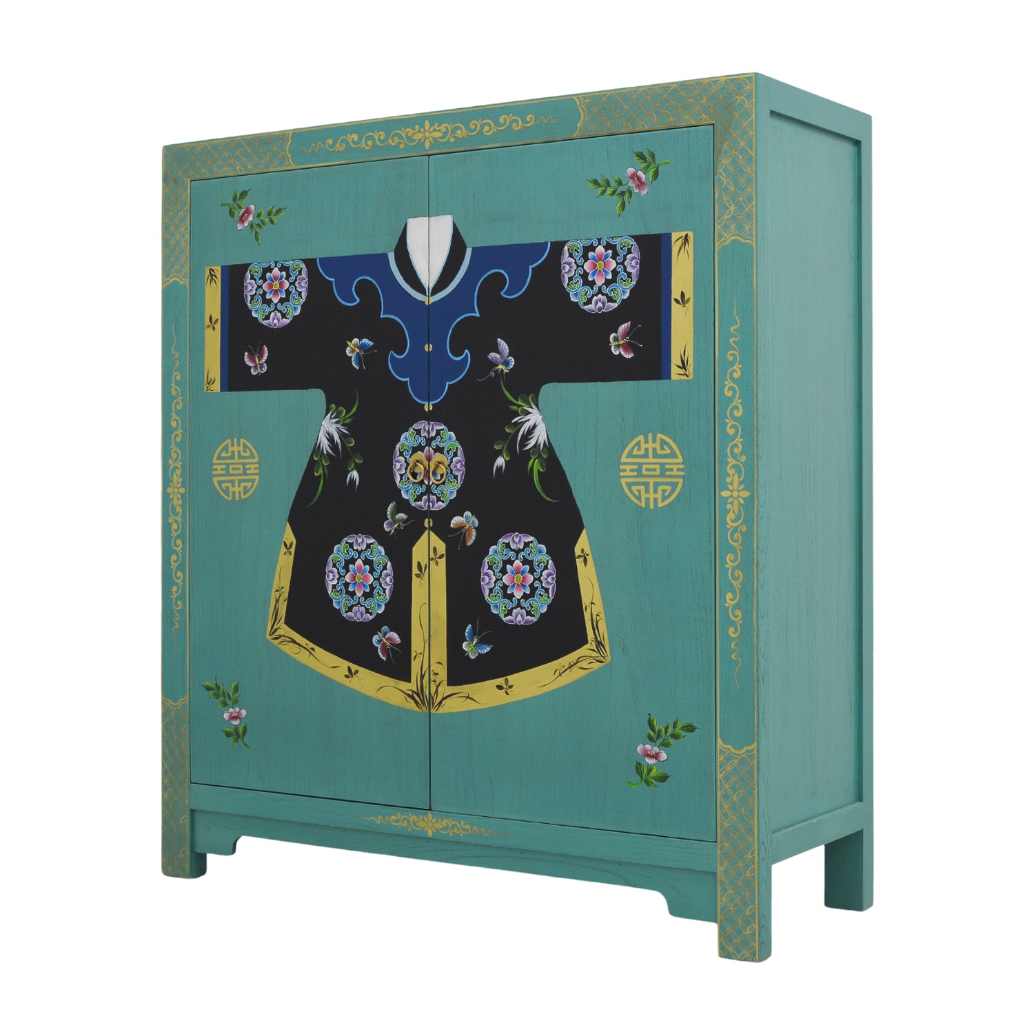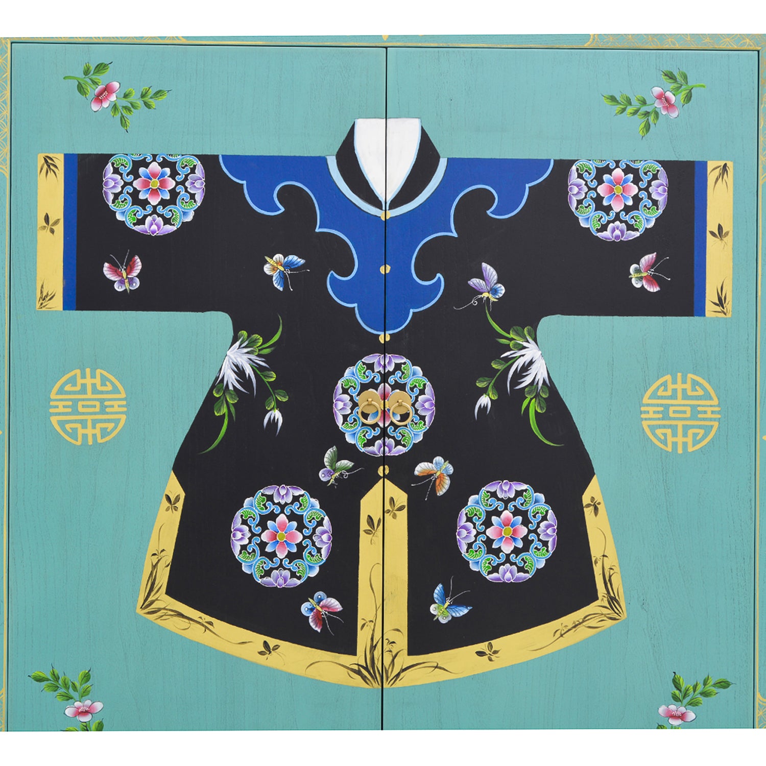 Unmistakably chinoiserie, this turquoise robe cabinet is a statement and a half - from its brightly coloured exterior to the intricate floral robe motif, this decadently painted cabinet is made to have a whole room decorated around it! Opulent in design yet practical in function, this follows the design of the Chinese wedding cabinets, where clothes were not yet vertically hung, but folded. Ideal for linen or small cloth items!