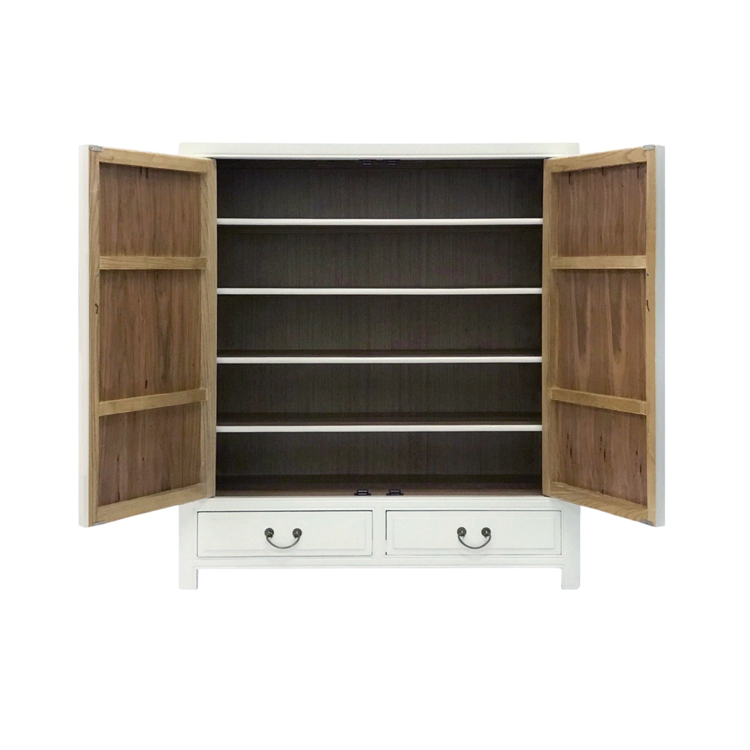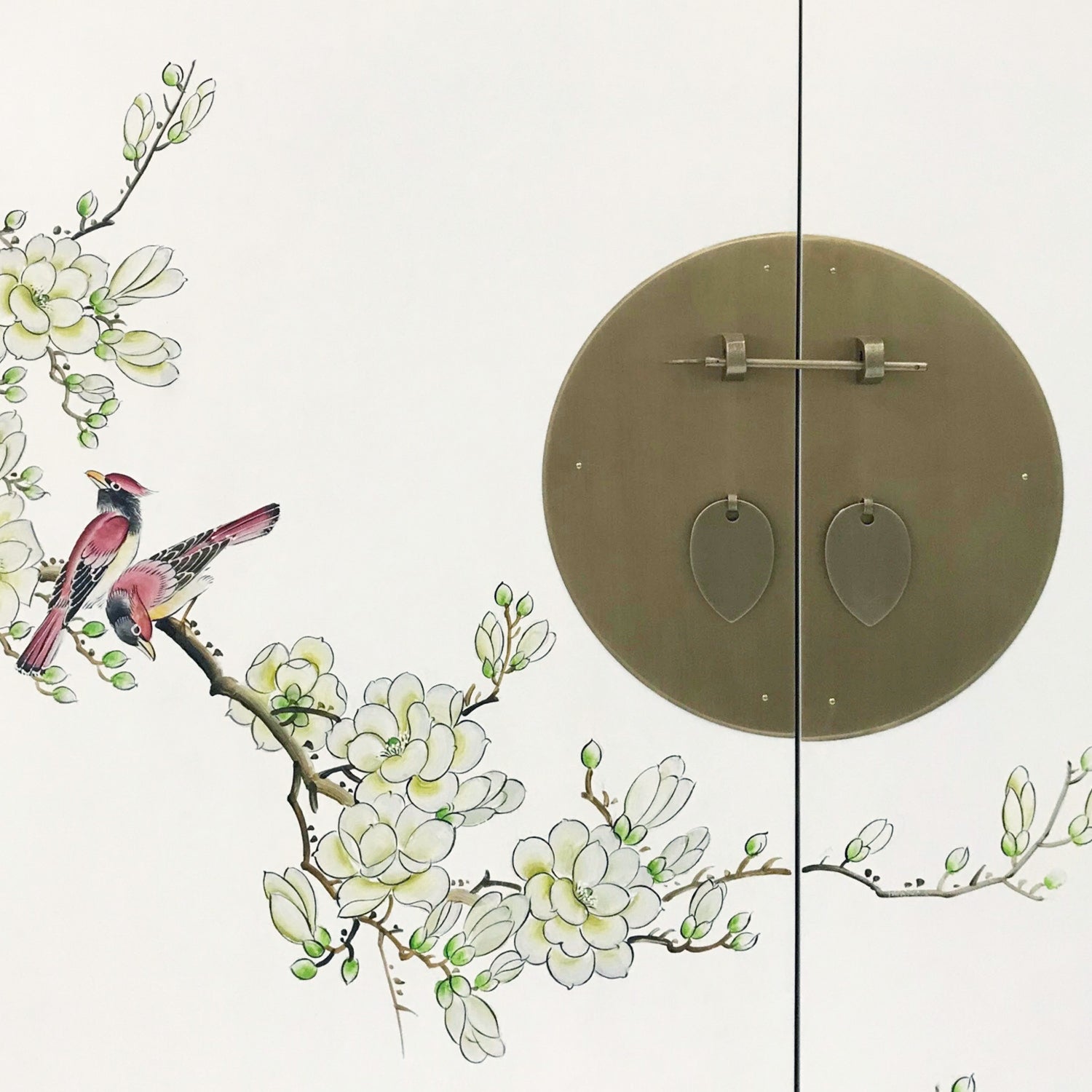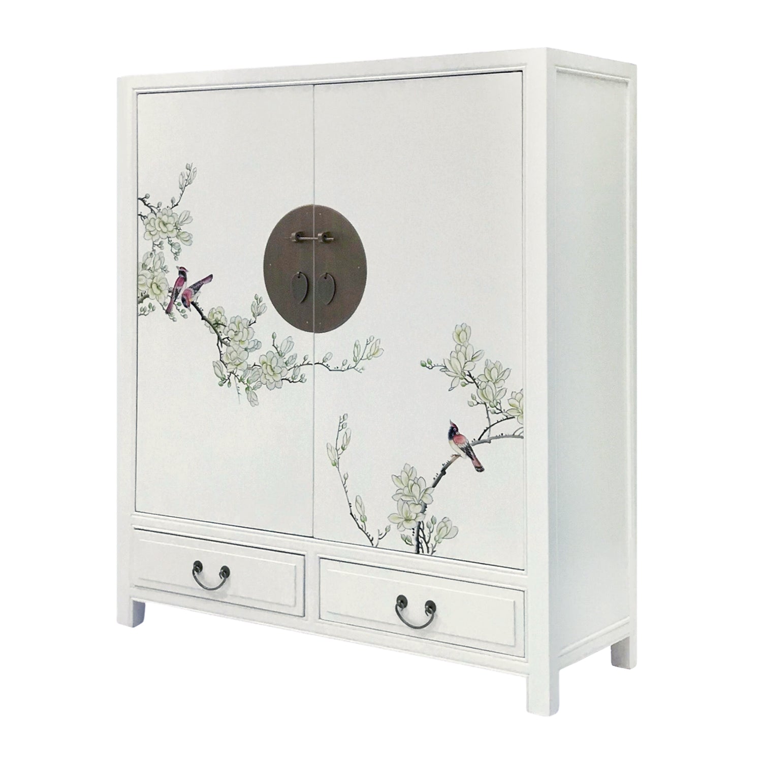 Magnificent and majestic, this shoe cabinet definitely has more than sufficient space to store your entire household’s shoe collection and more. A large cabinet with an outward exterior of white wash adorned with chinoiserie floral motifs, it is offset by a round brass face plate with a sliding pin lock to further put emphasis on its Chinese origins. Use it for its intended purpose or transform it into any storage of your desire!