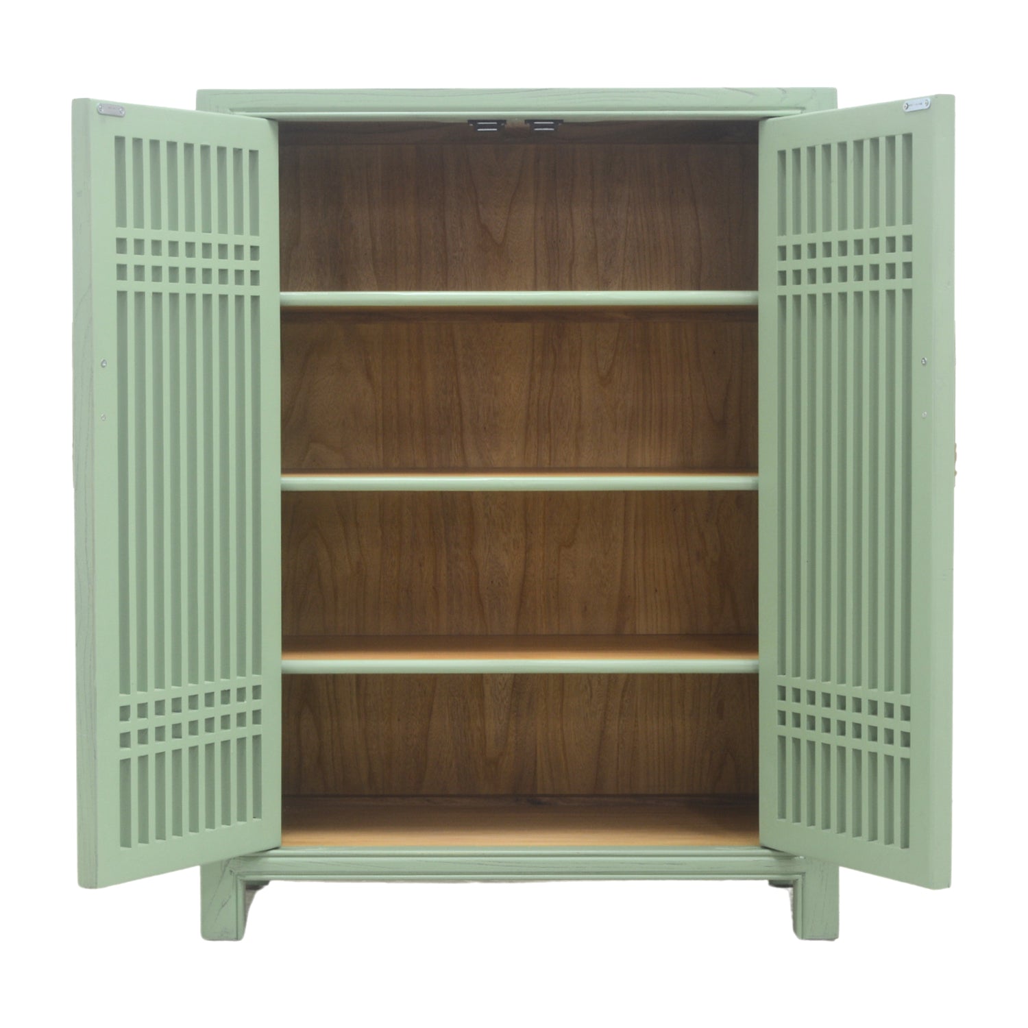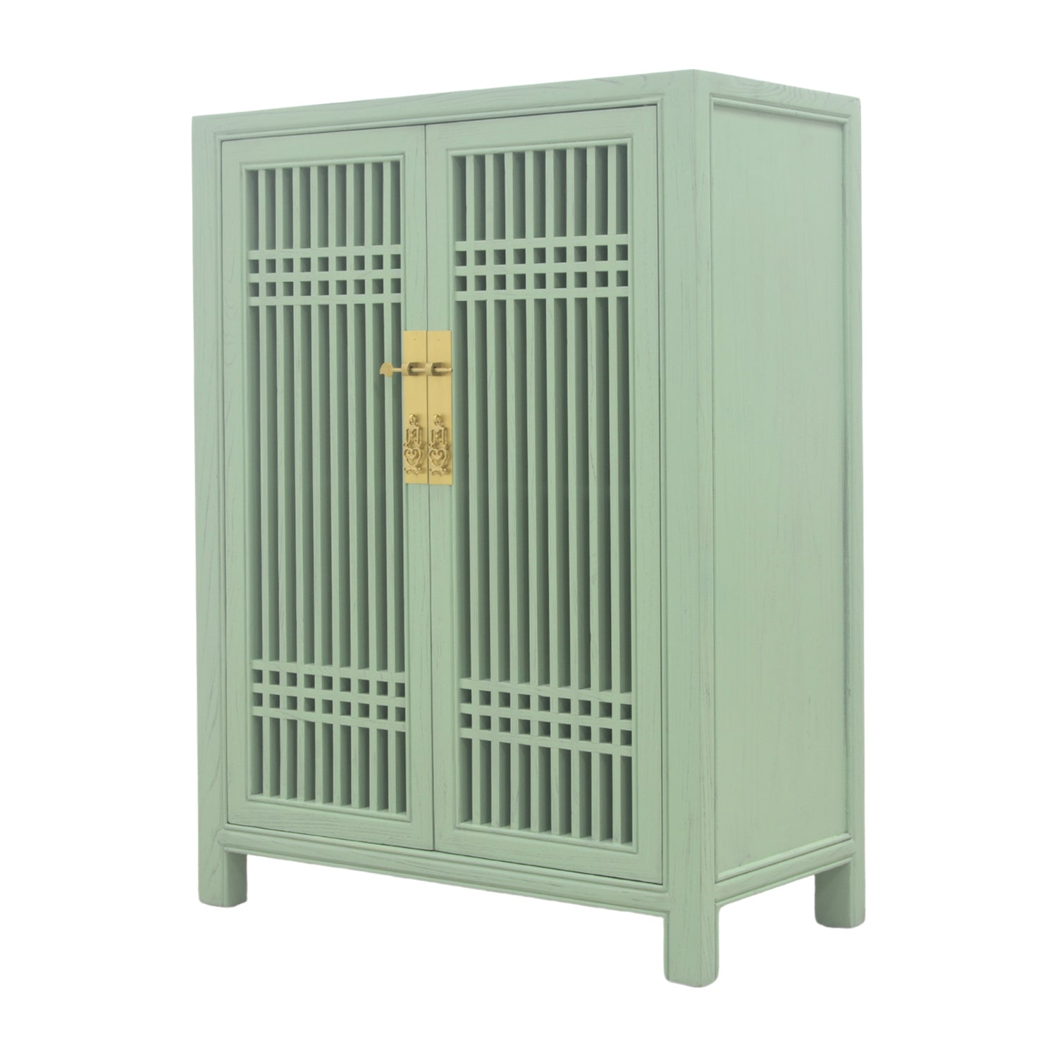 In the times of old, the Chinese favoured this lattice design for its closed yet open concept. The contents would be shielded from view yet would be open enough to let air flow freely. Inspired from those times, the lattice structure is still favourably viewed in today's architecture, as it is with this expansive shoe cabinet. Dressed in mint wash with brass fittings, this cabinet is ideal to keep your shoes ventilated, yet hidden.