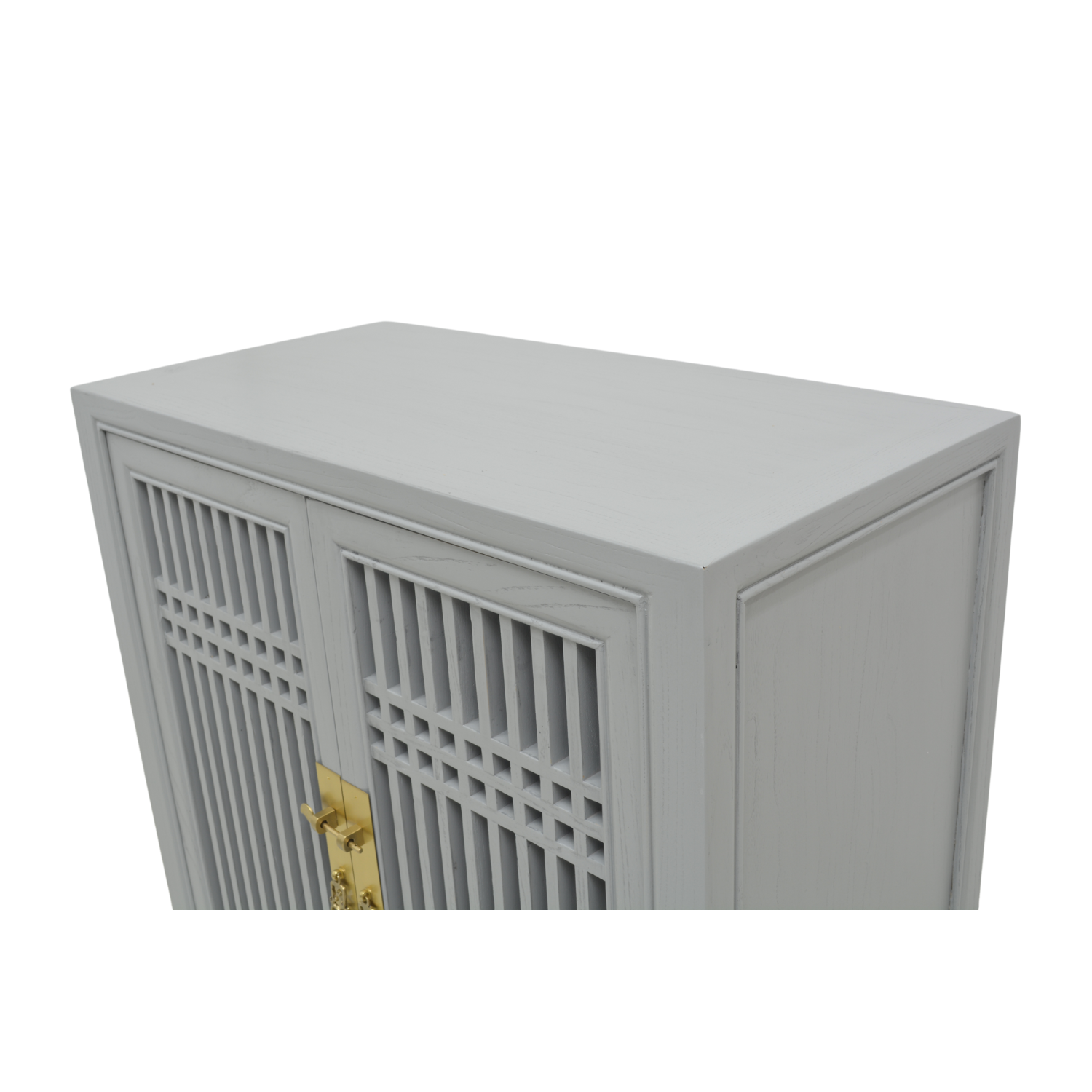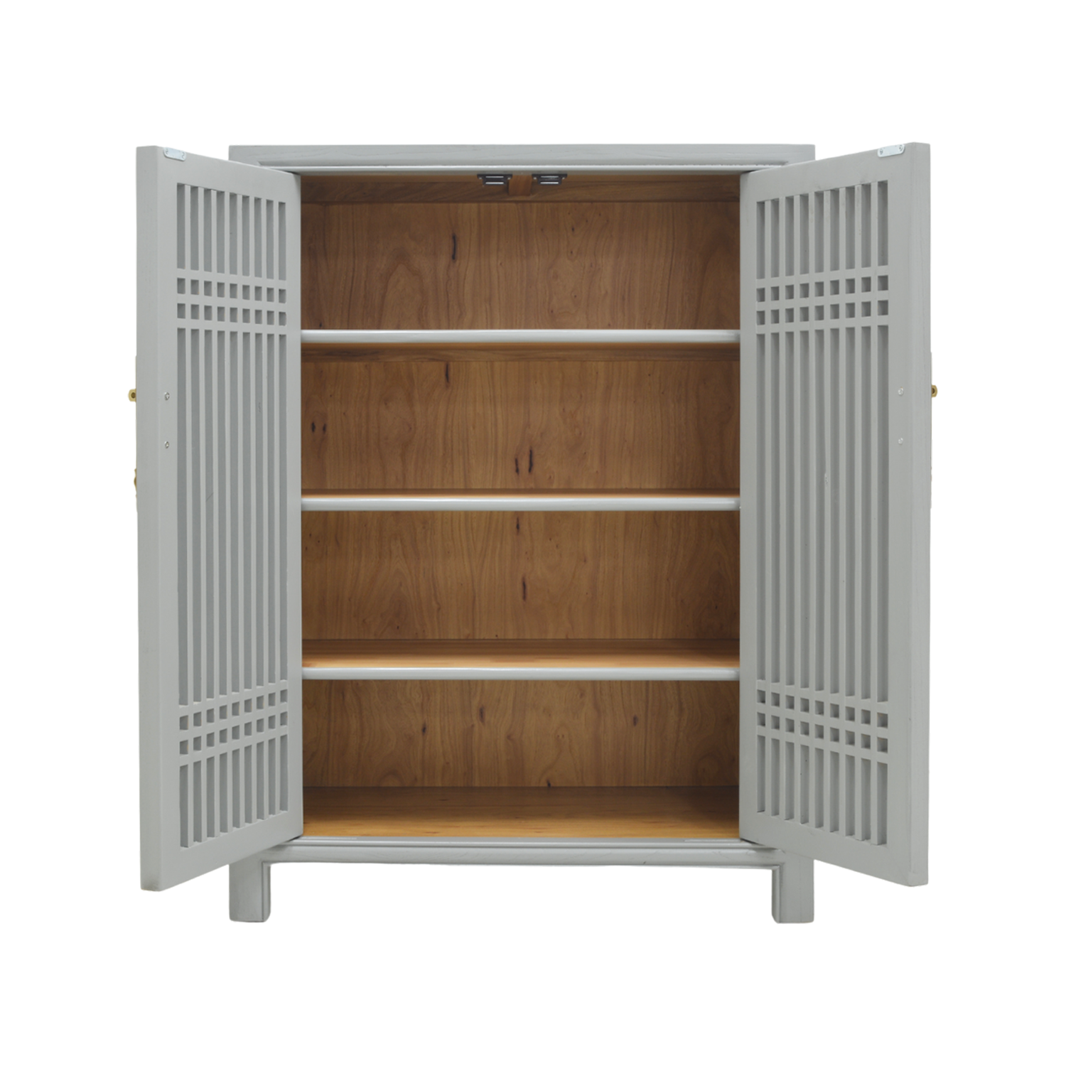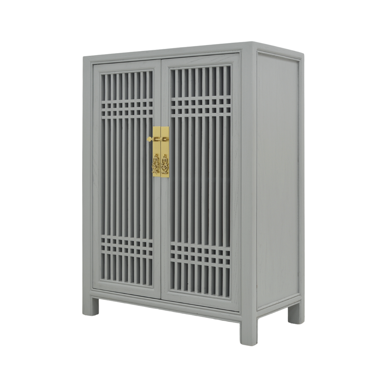 In the times of old, the Chinese favoured this lattice design for its closed yet open concept. The contents would be shielded from view yet would be open enough to let air flow freely. Inspired from those times, the lattice structure is still favourably viewed in today's architecture, as it is with this expansive shoe cabinet. Dressed in grey with brass fittings, this cabinet is ideal to keep your shoes ventilated, yet hidden.