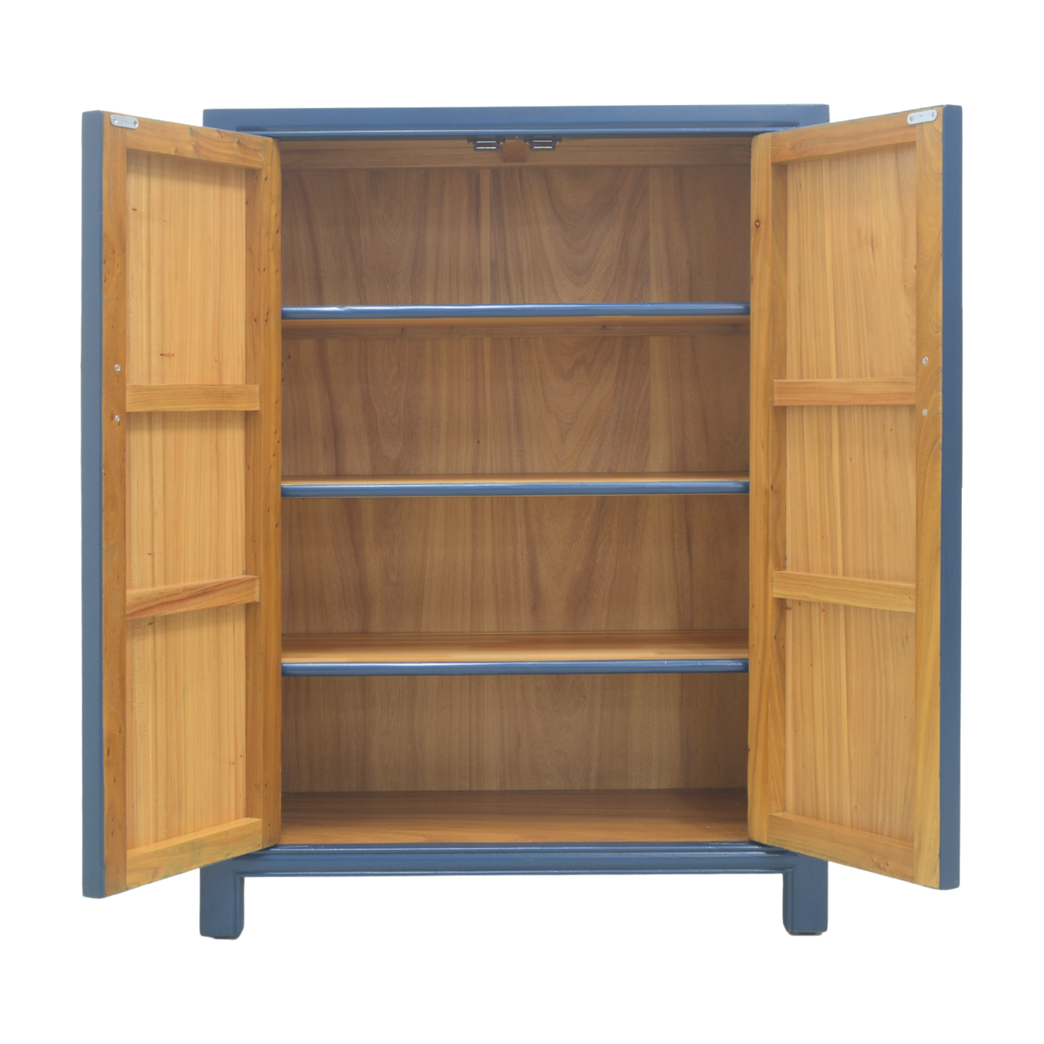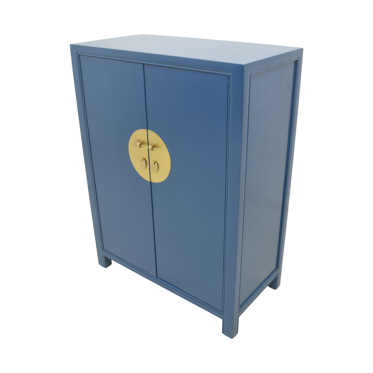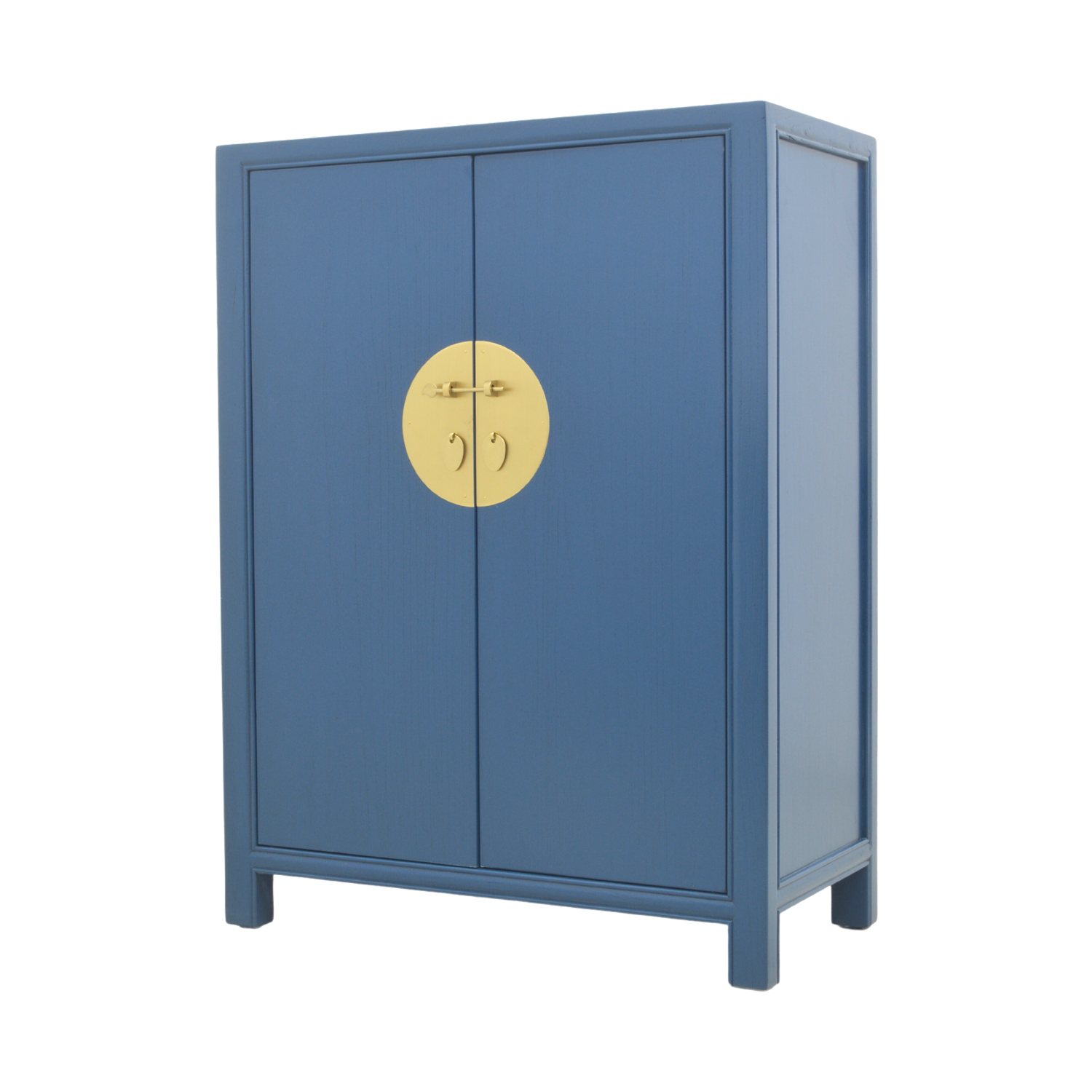 Fluidly minimalistic, this oriental shoe cabinet mixes the chinoiserie with the modern by featuring a traditional design in a trendy royal blue. With clean, flowing lines and just a simple brass face plate to indicate its oriental influences, this understated shoe cabinet blends into any living space with effortless ease. Use it for its intended purpose or get creative; the four shelves are perfect for storing rarely used china or linen!
